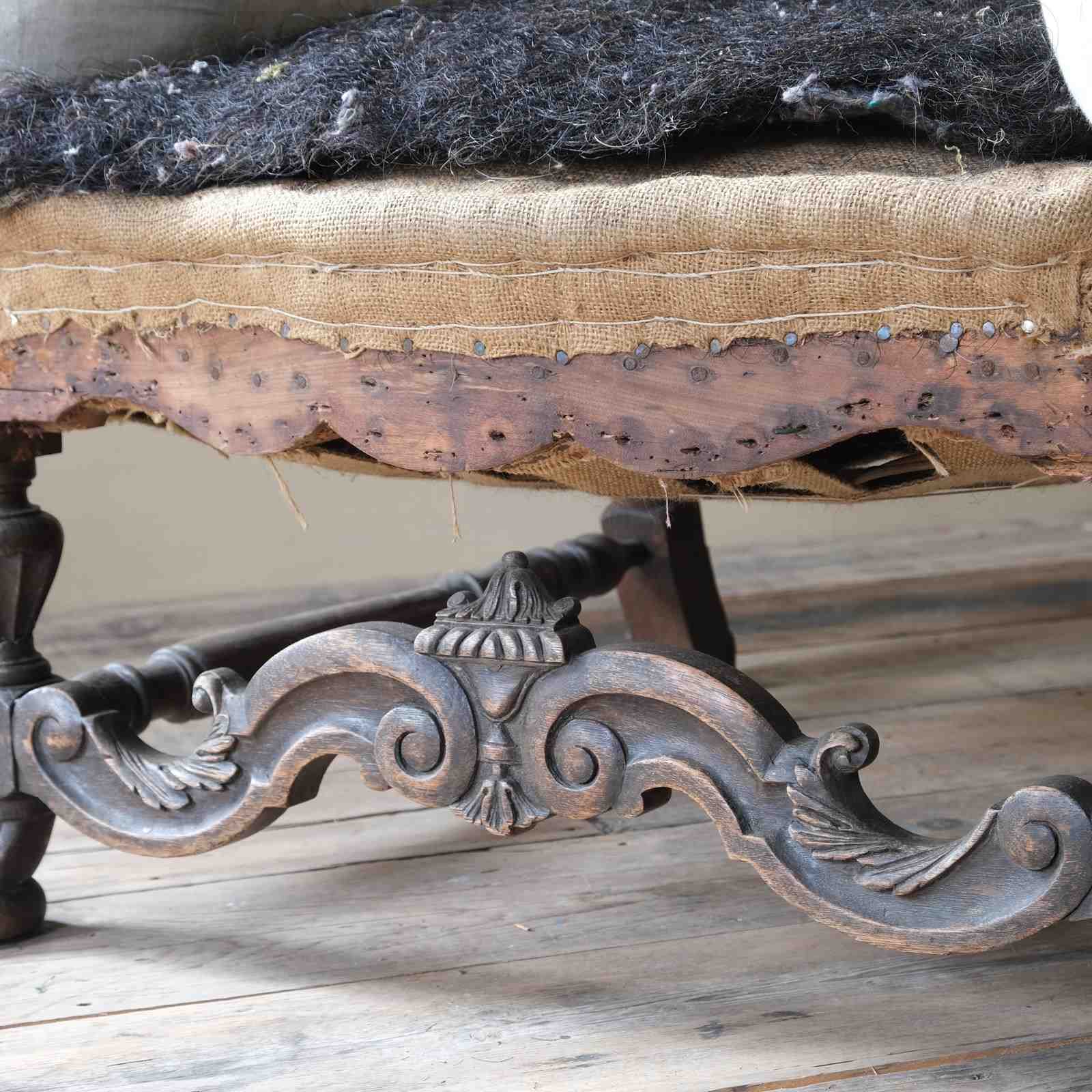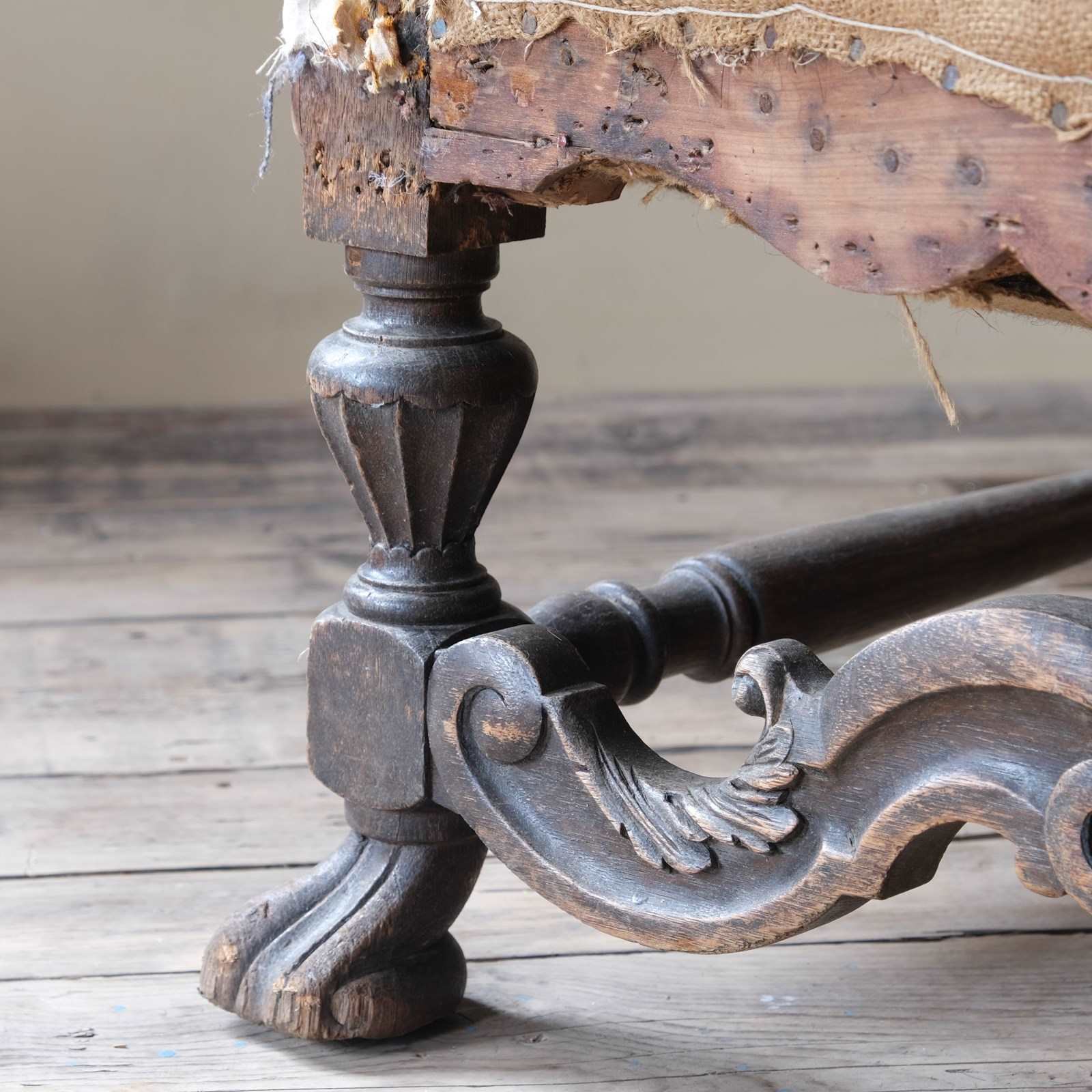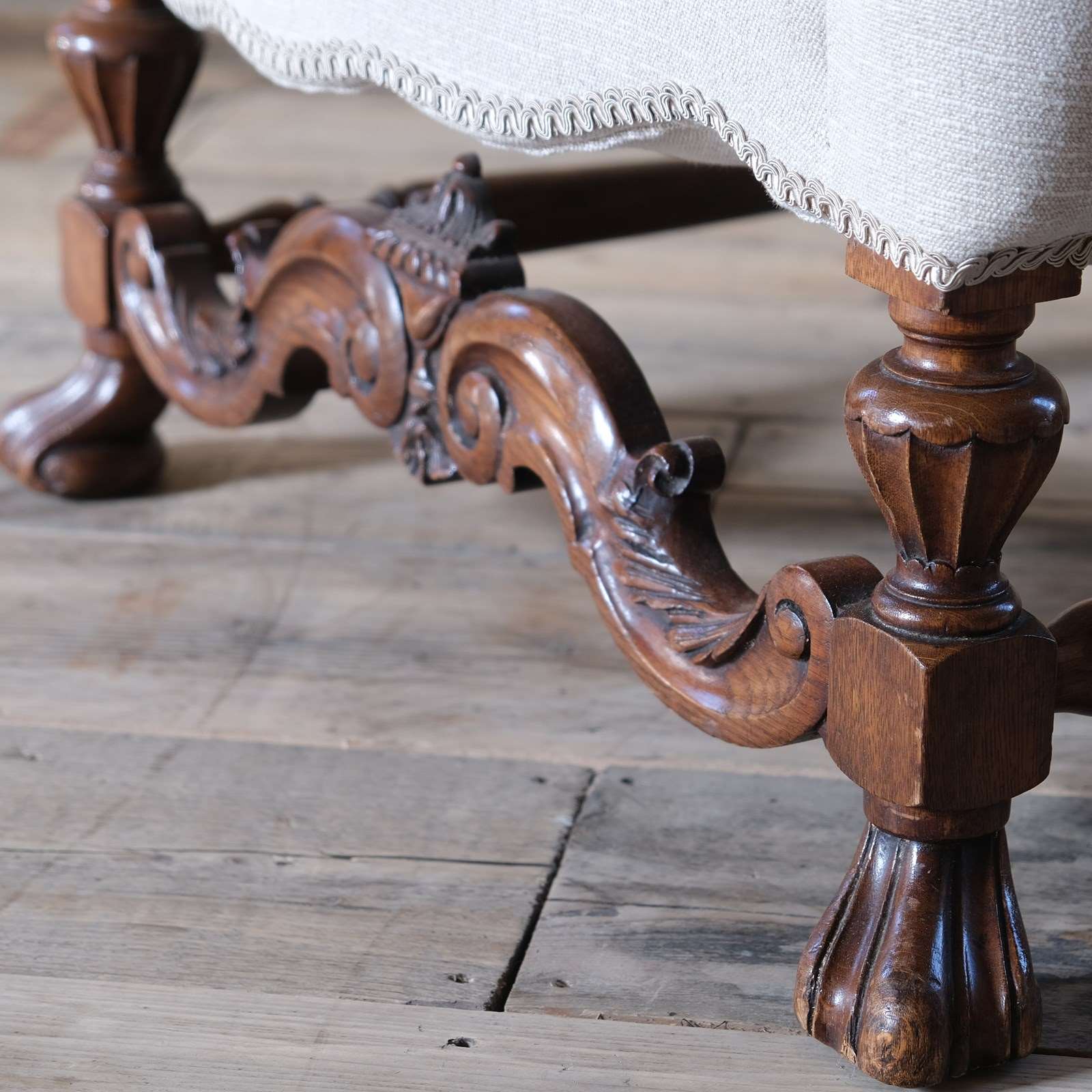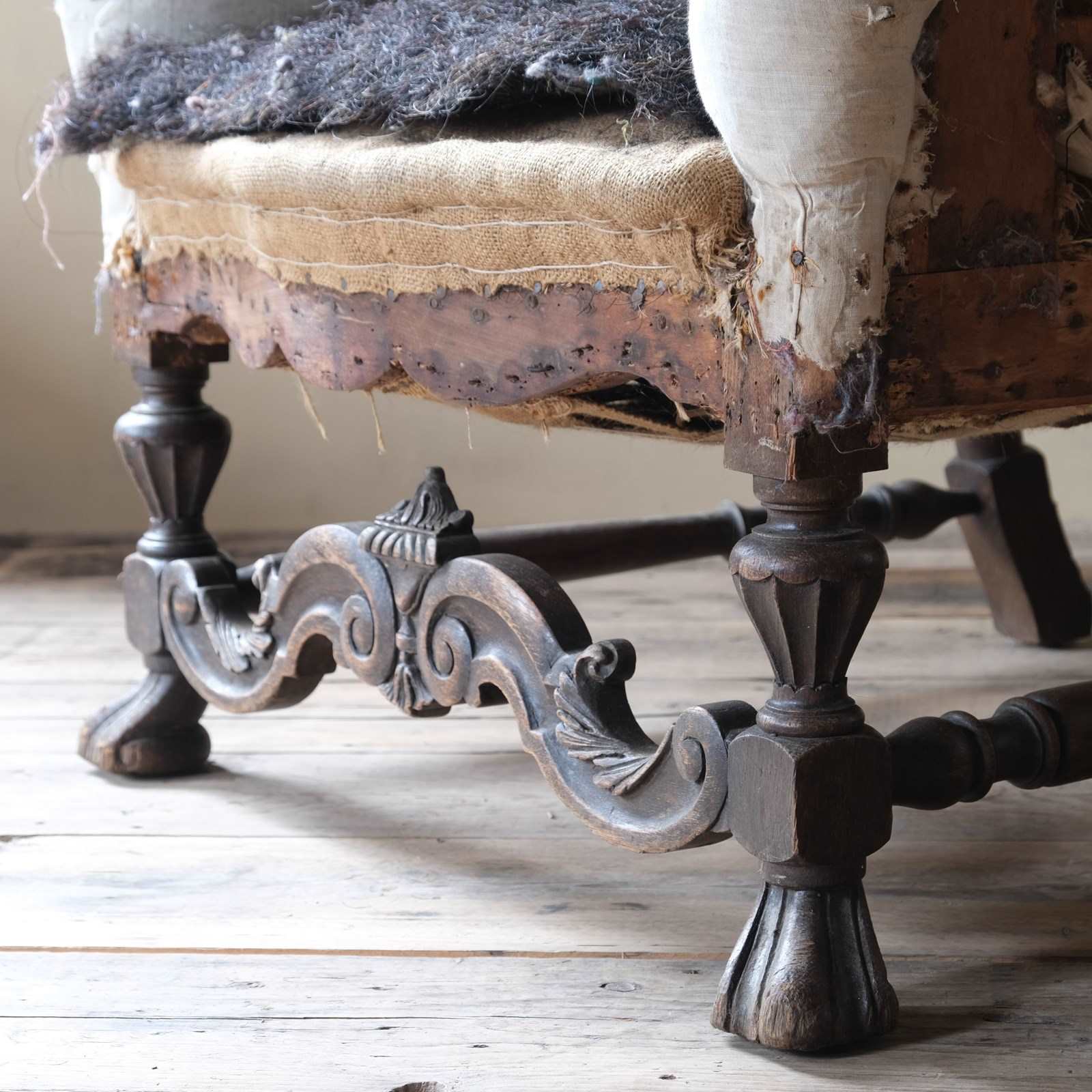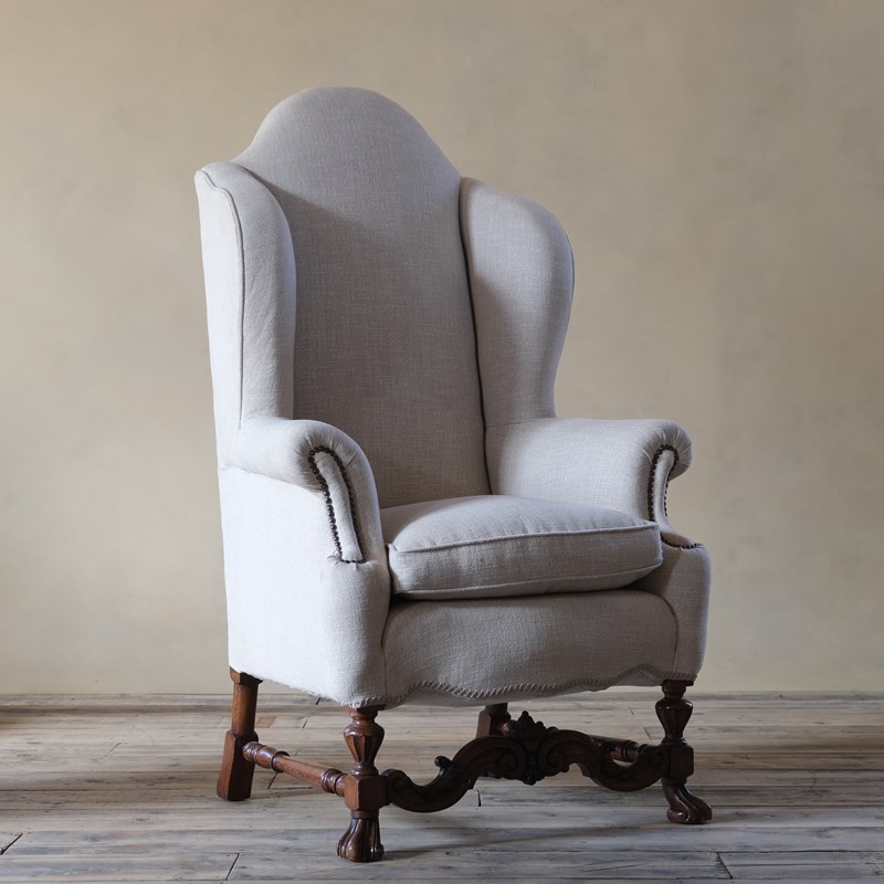 A monumental matched pair of 19th century William & Mary style wingback armchairs. The walnut frames raised by crisply carved oak legs.