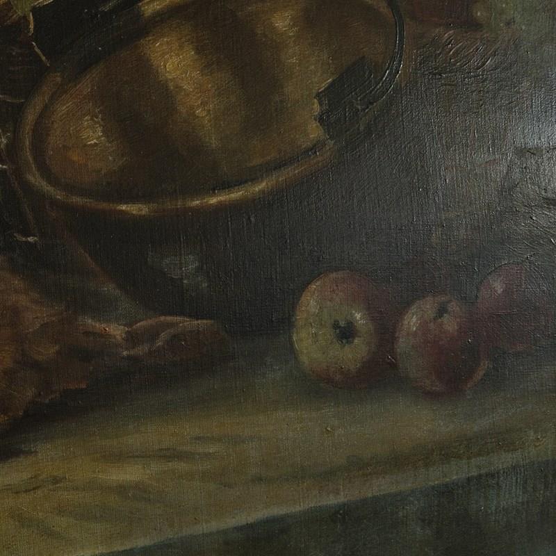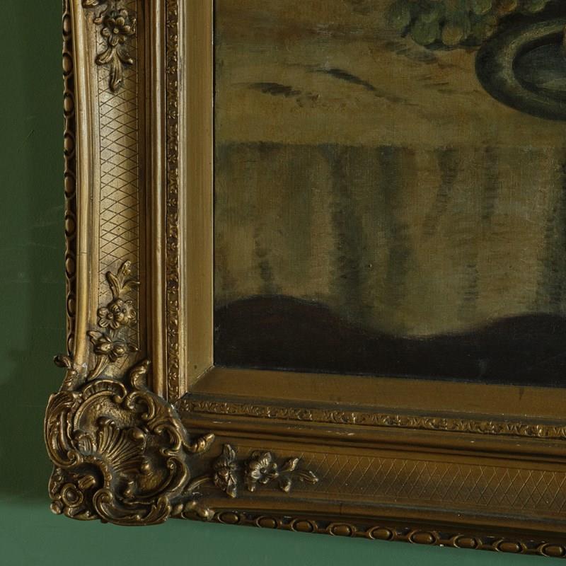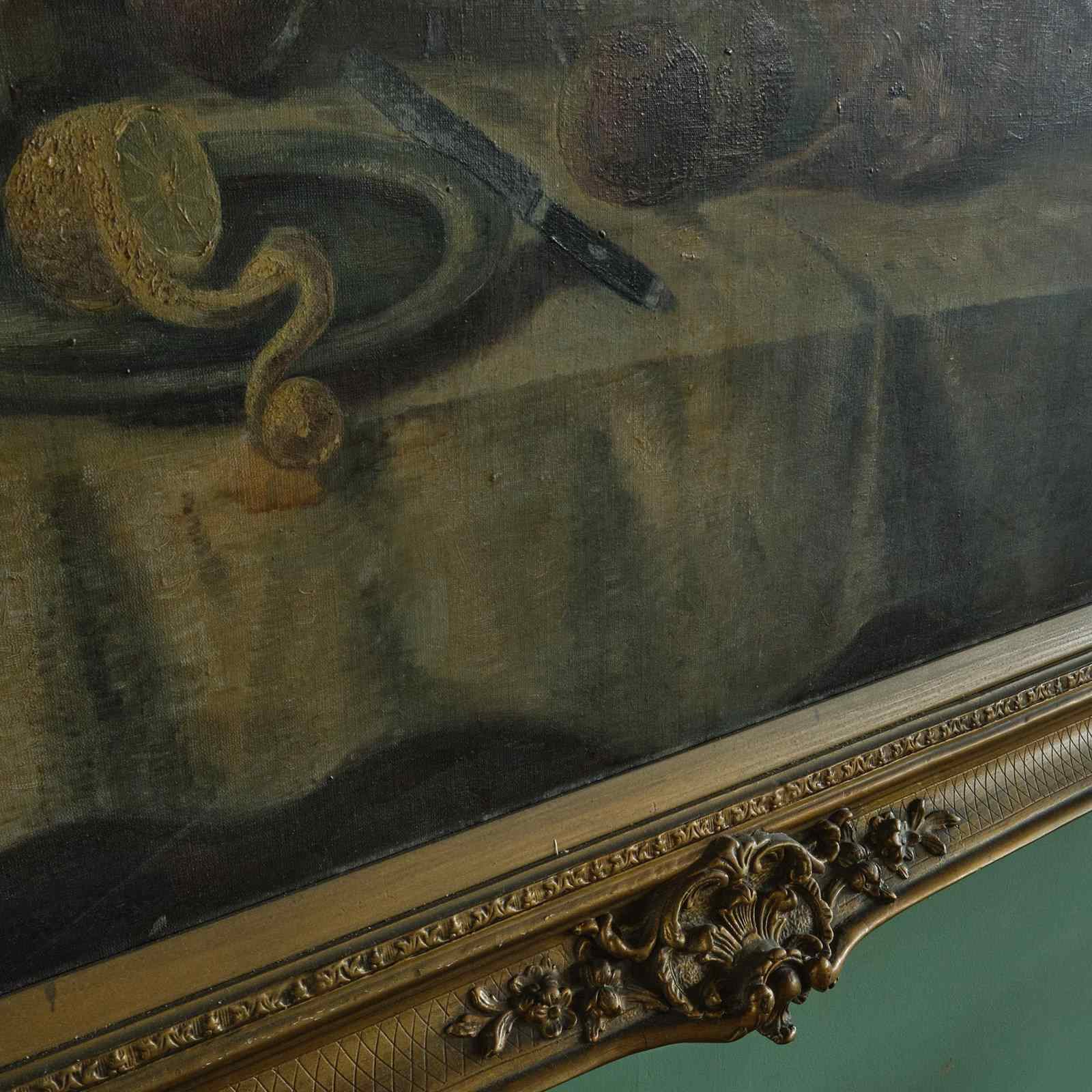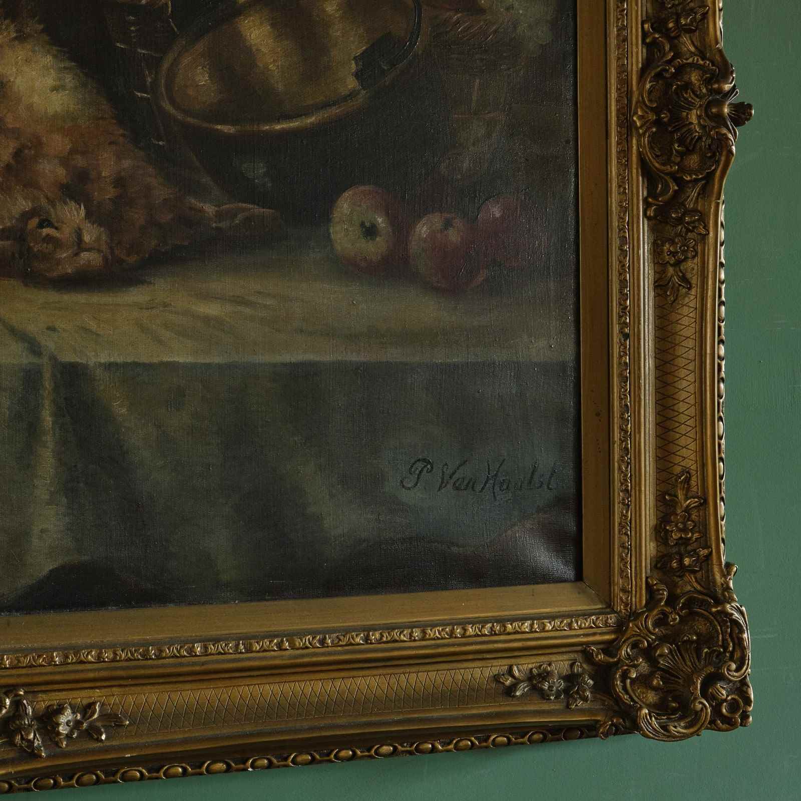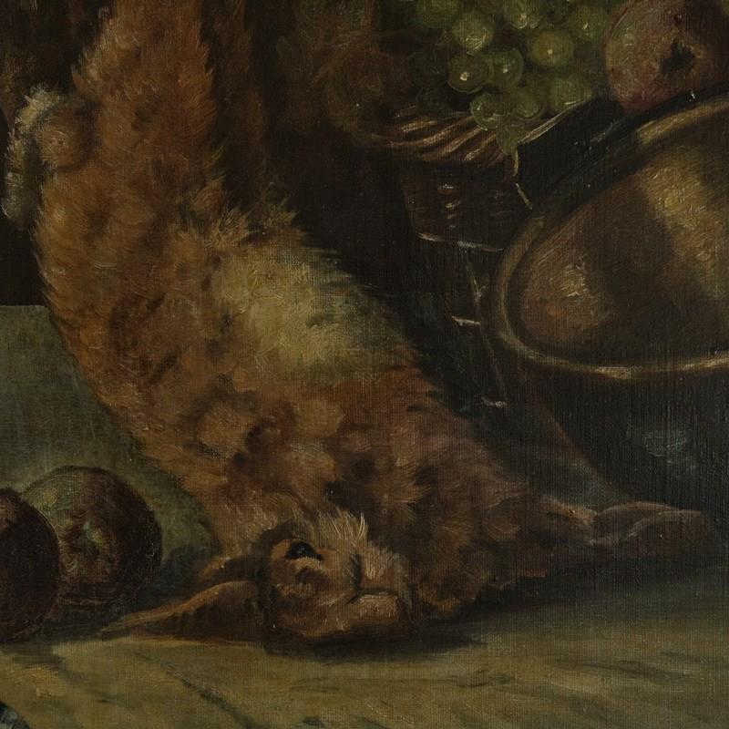 A large 19th century Dutch signed oil on canvas depicting a table scene with fruits and a dead hare. The painting hangs in a pine and plaster gilt frame with various small losses but mostly complete.