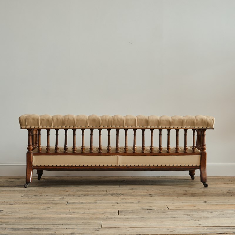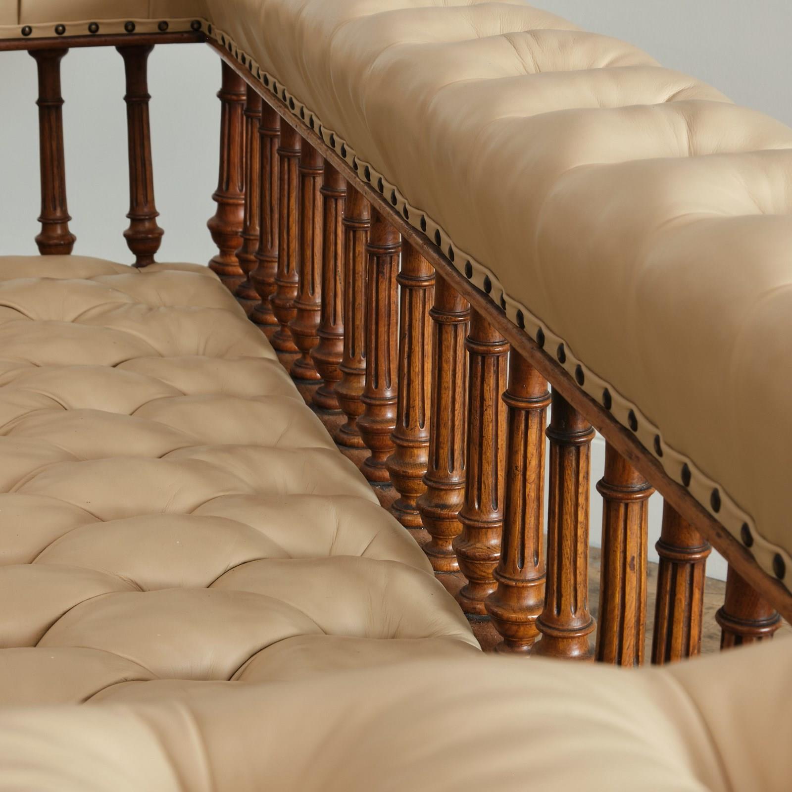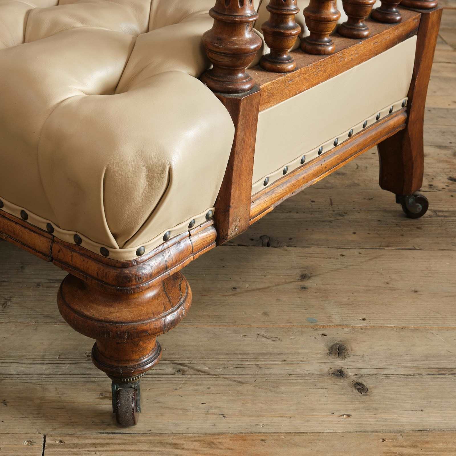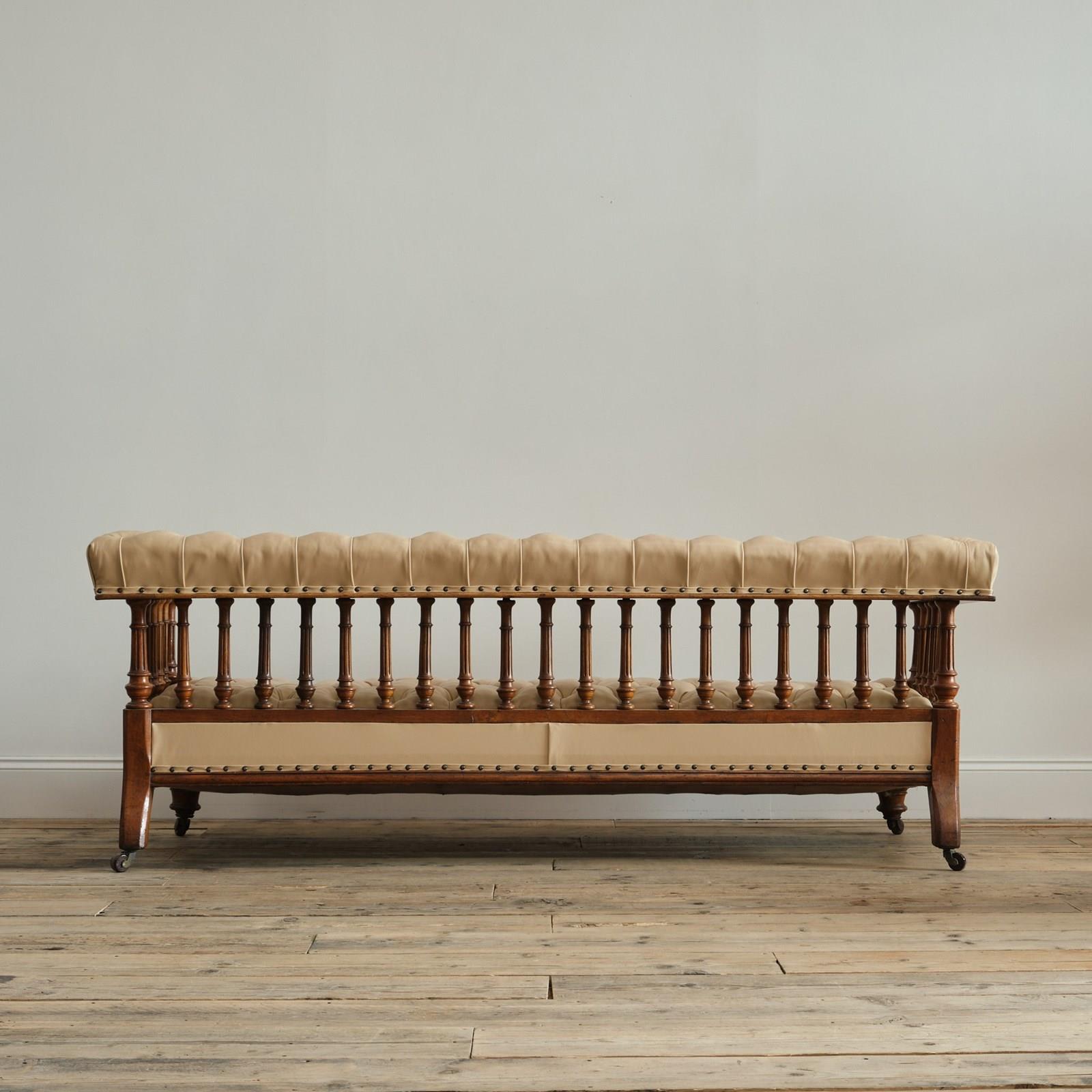 A large 19th century country house open arm sofa. Constructed in Oak and raised on thick turned front legs with splayed rear legs and all with the original casters. The back raised on turned and fluted supports. English c1870