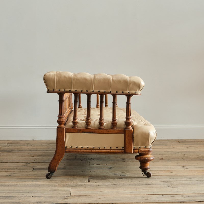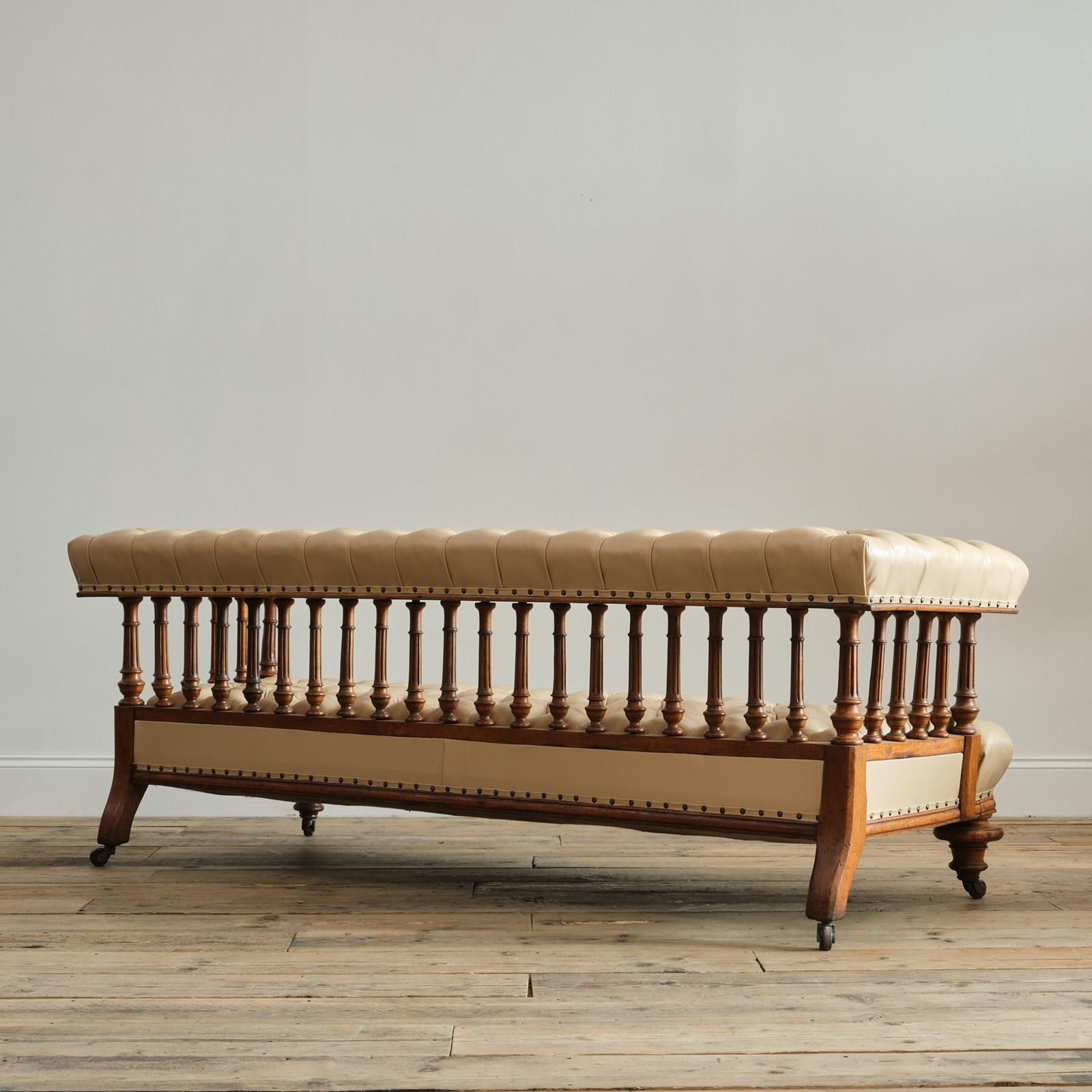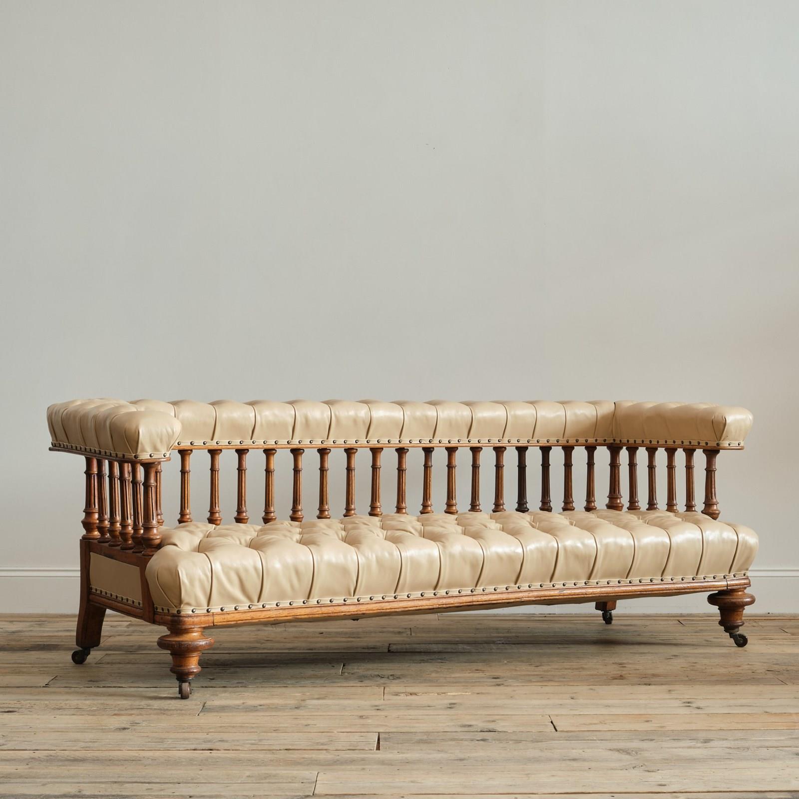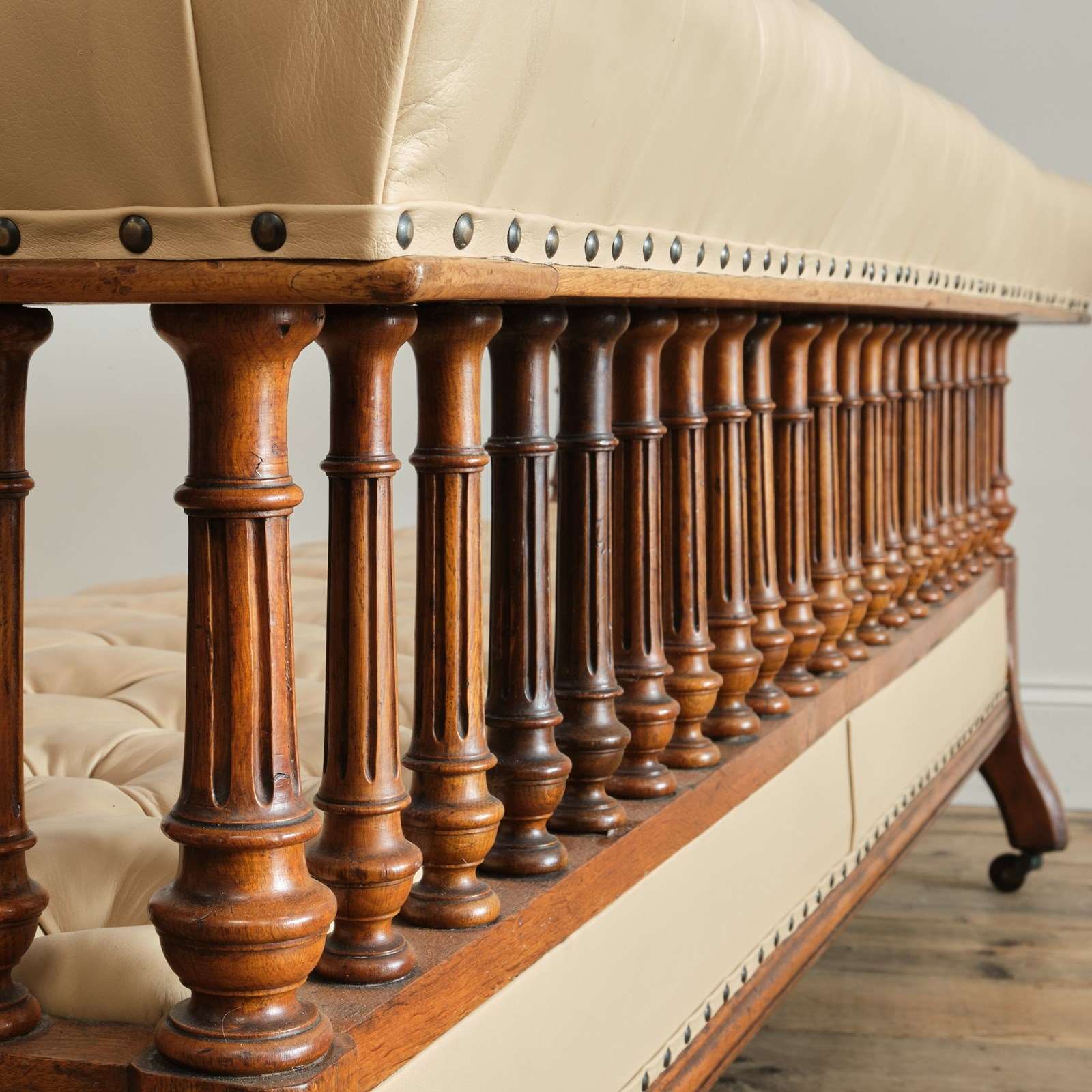 A large 19th century country house open arm sofa. Constructed in Oak and raised on thick turned front legs with splayed rear legs and all with the original casters. The back raised on turned and fluted supports. English c1870