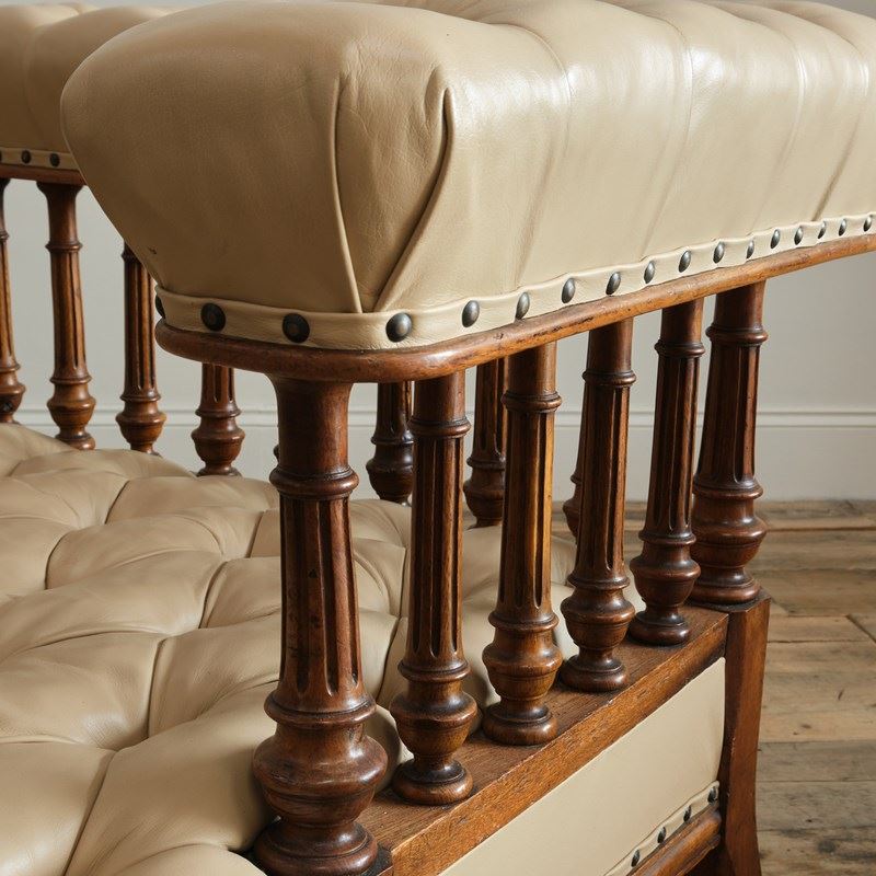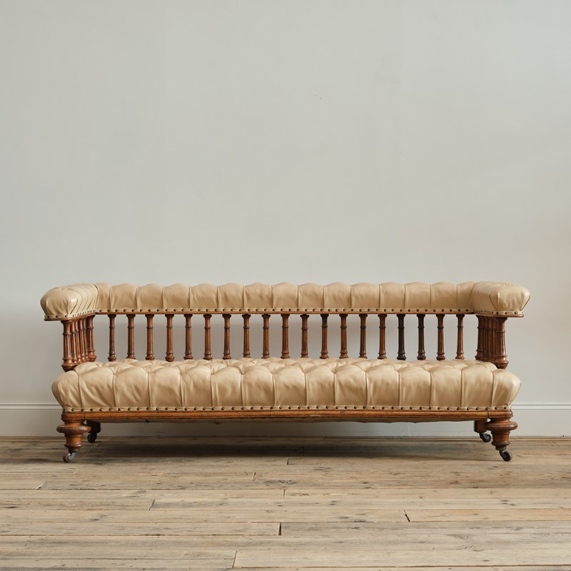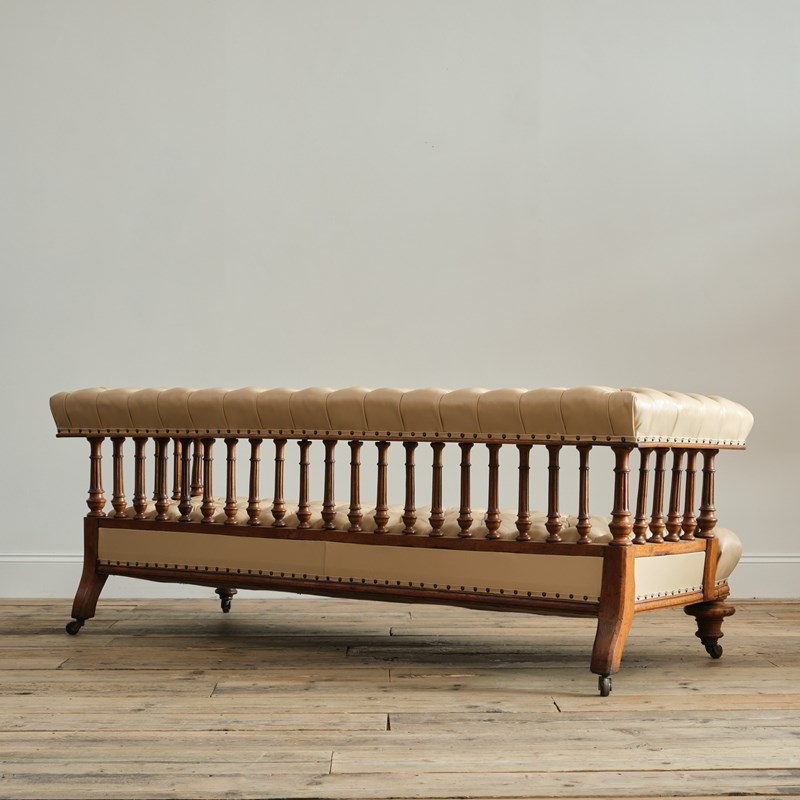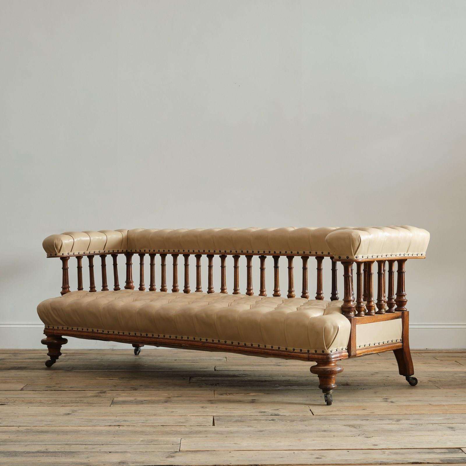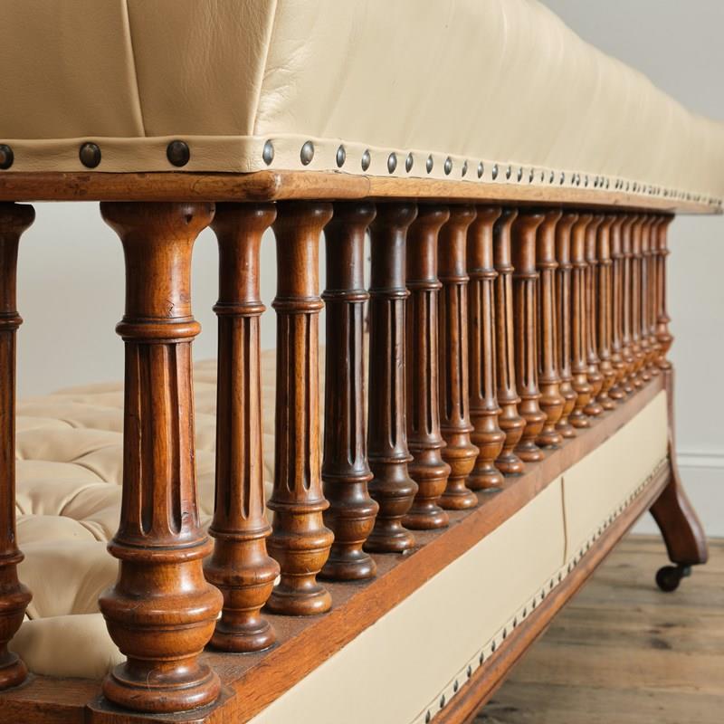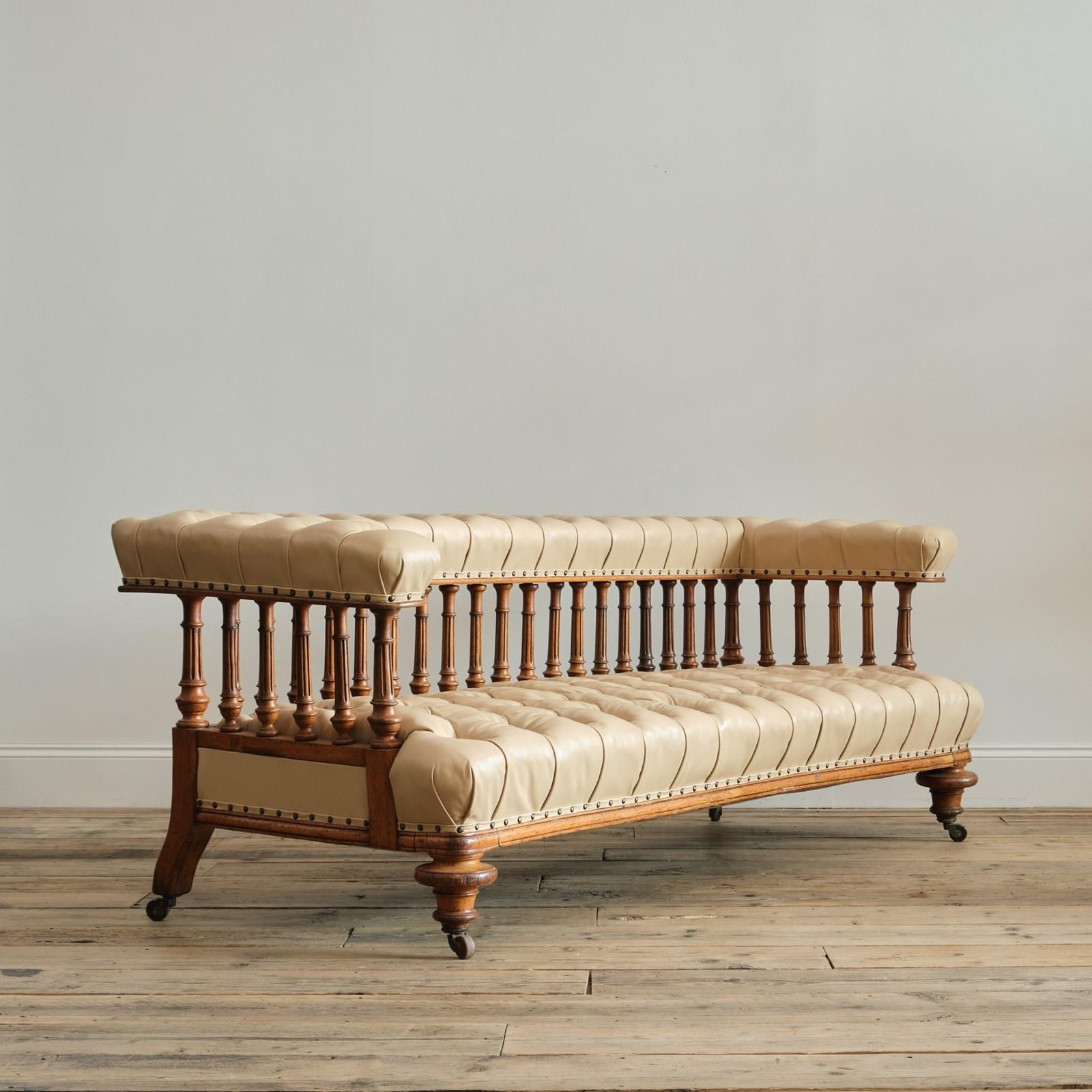 A large 19th century country house open arm sofa. Constructed in Oak and raised on thick turned front legs with splayed rear legs and all with the original casters. The back raised on turned and fluted supports. English c1870