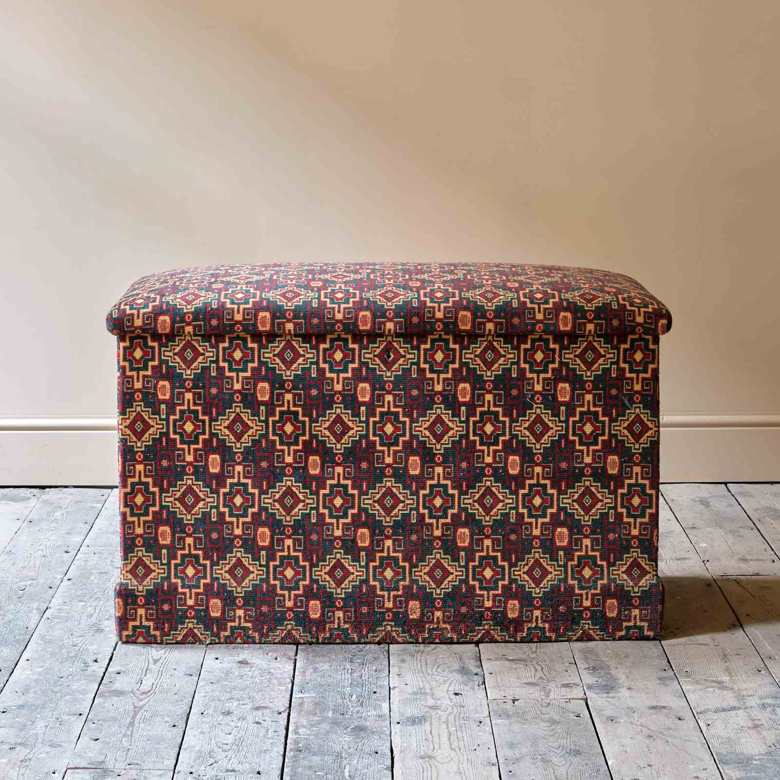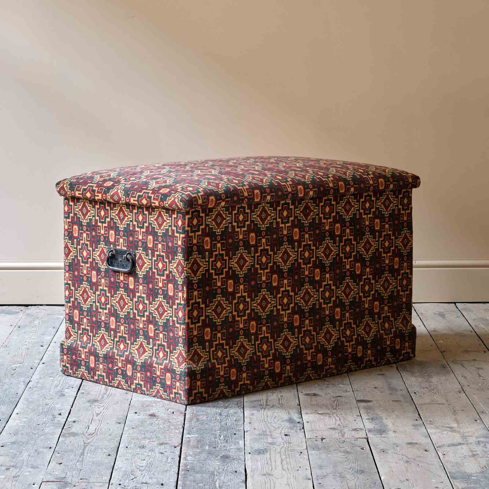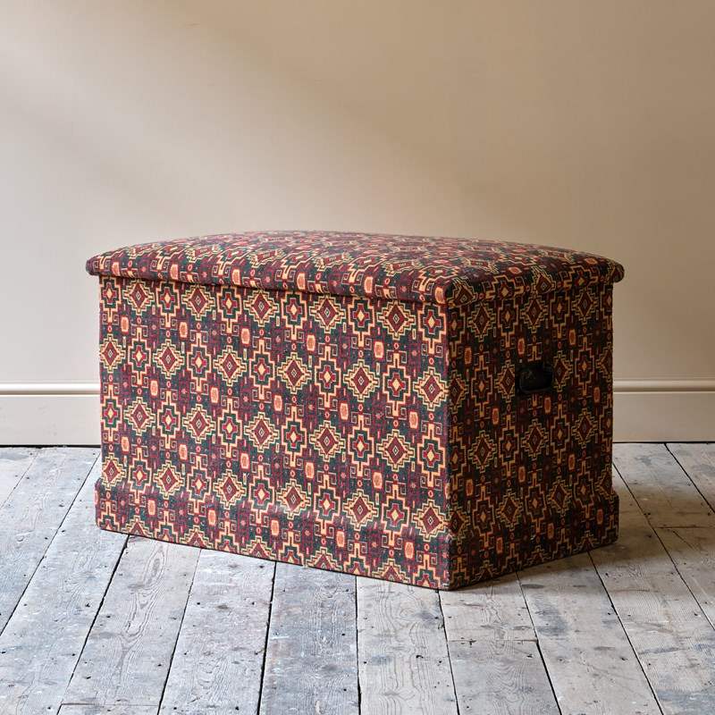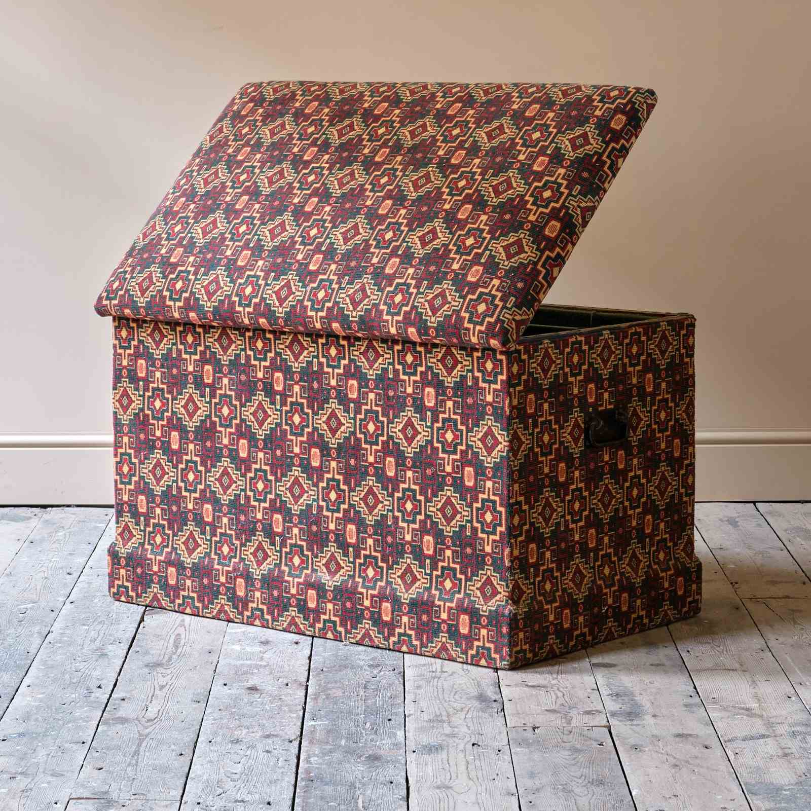 A large 19th century pine storage box in later thick carpet type material and a green baize lined interior with compartmental storage bays. The main body of the box with iron carry handles and the top with horsehair upholstery.