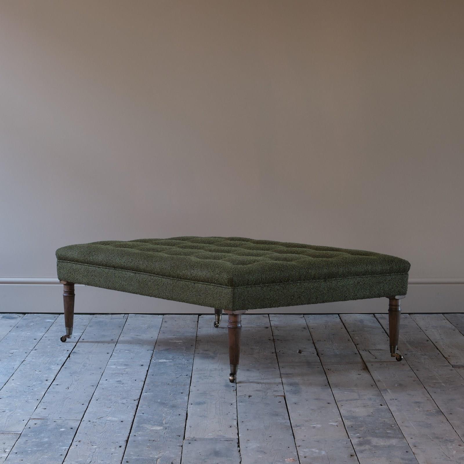 A large country house inspired footstool. Upholstered in floral Jacquard chintz. Raised on turned beech and reeded legs and casters.