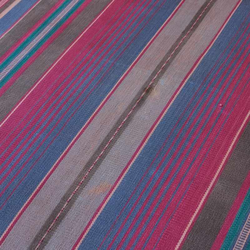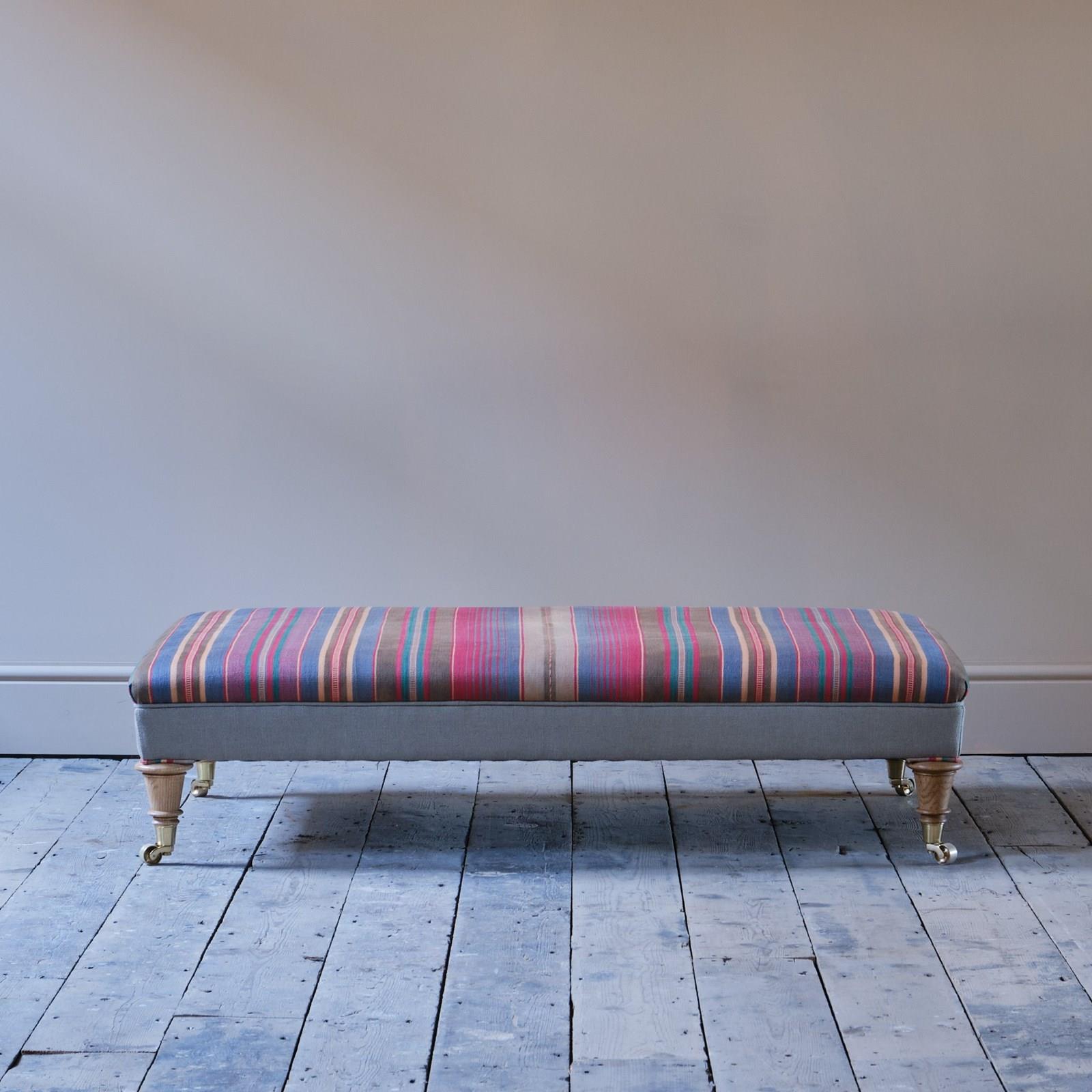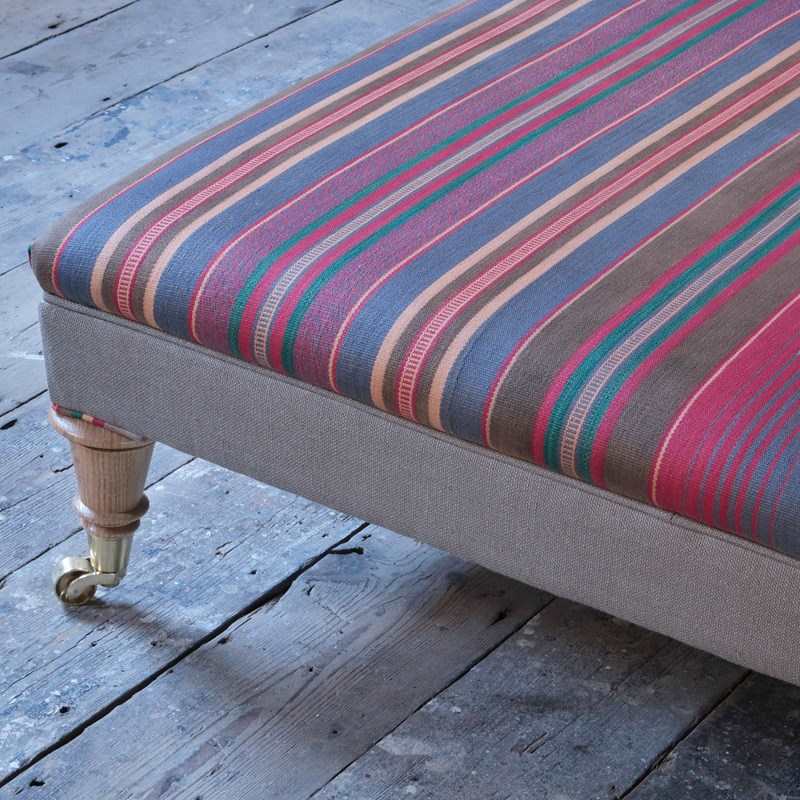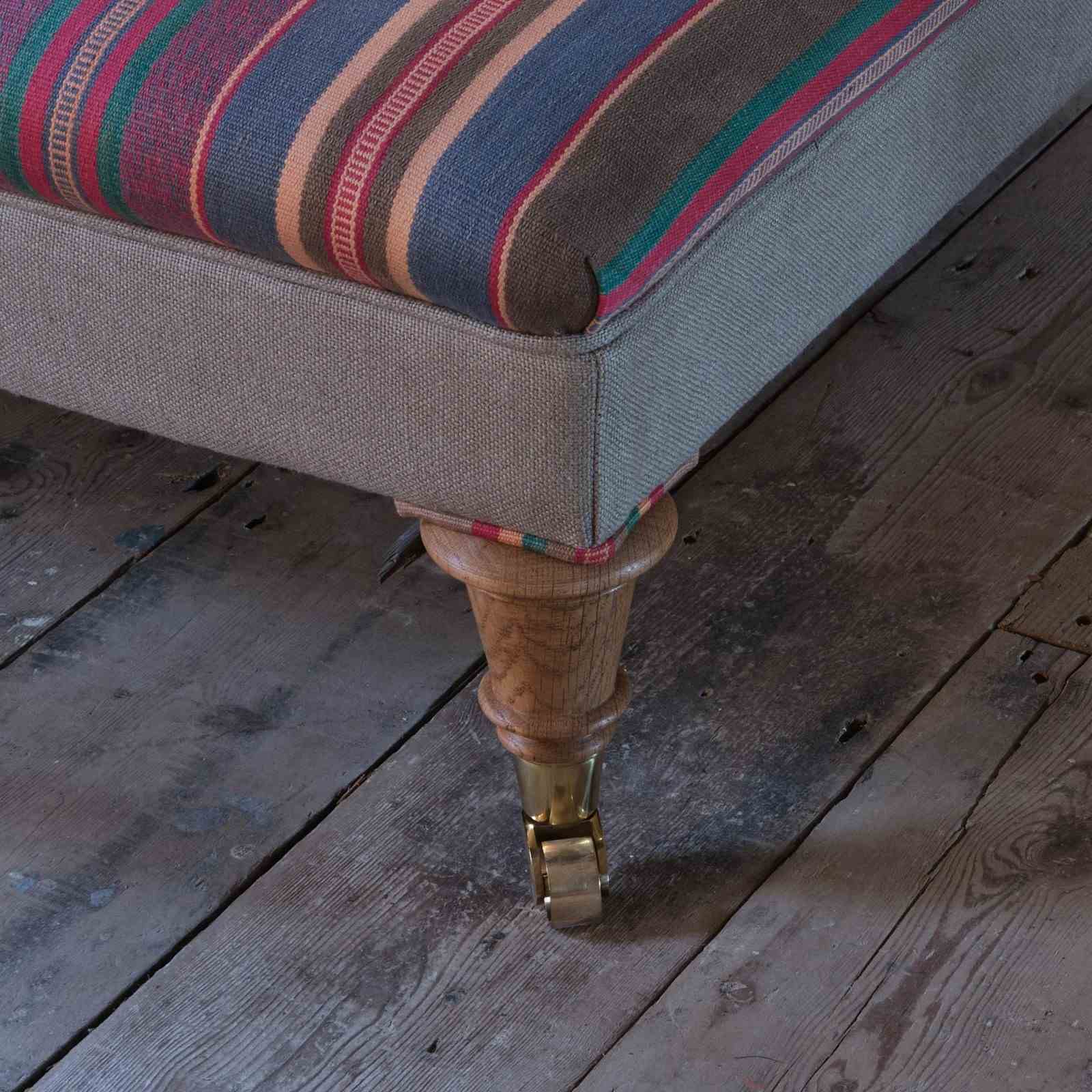 A large country house inspired footstool. Upholstered in a vintage flat weave rug top and linen boarder. Raised on low turned oak and legs and casters. The vintage rug does have the odd mark to it but doesn't have any holes.