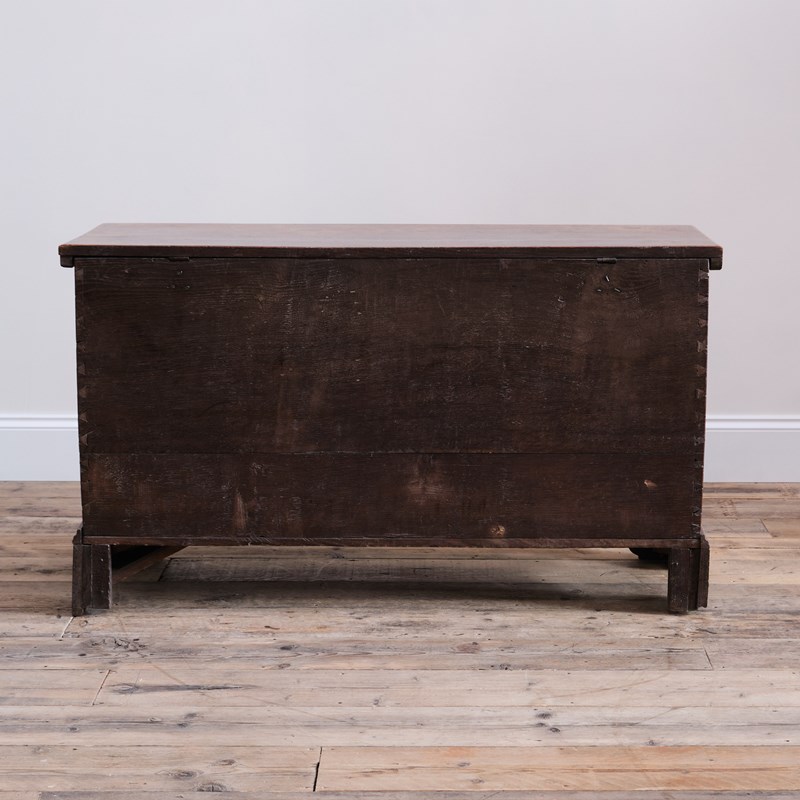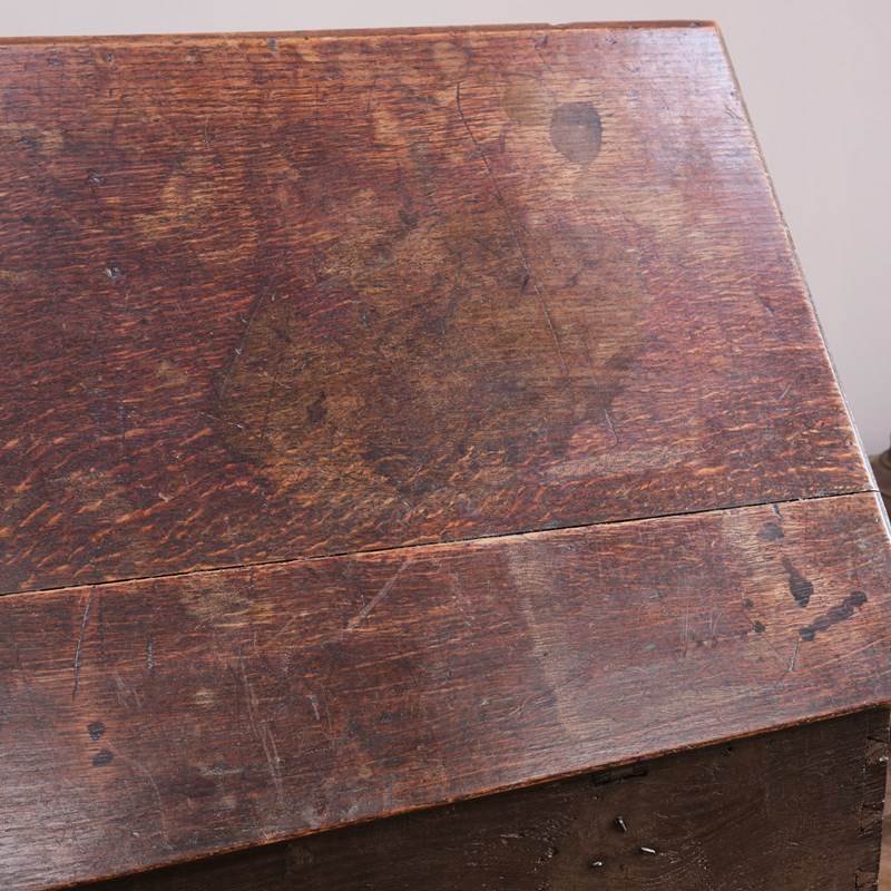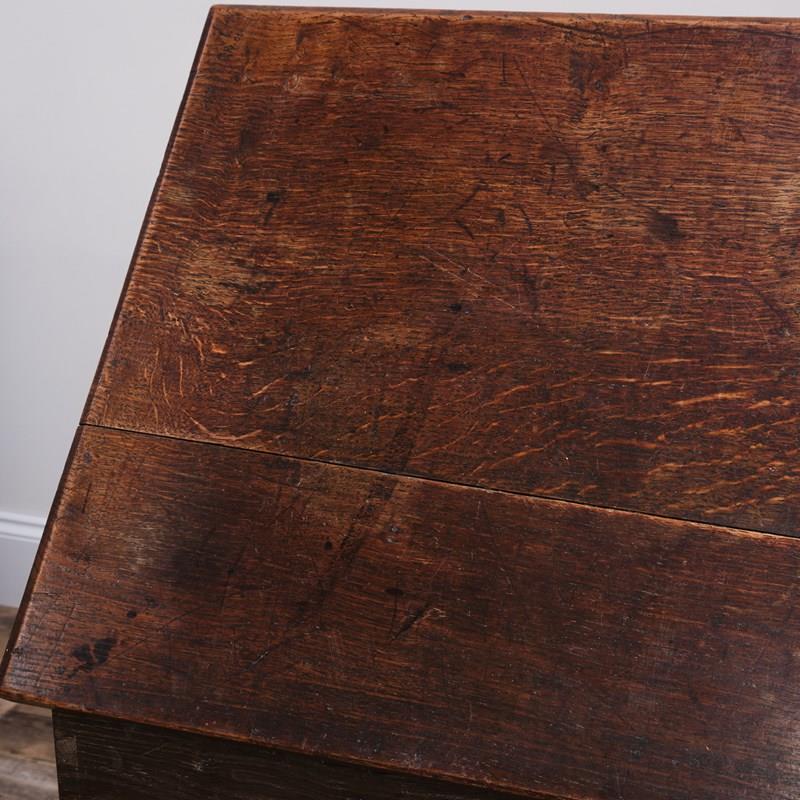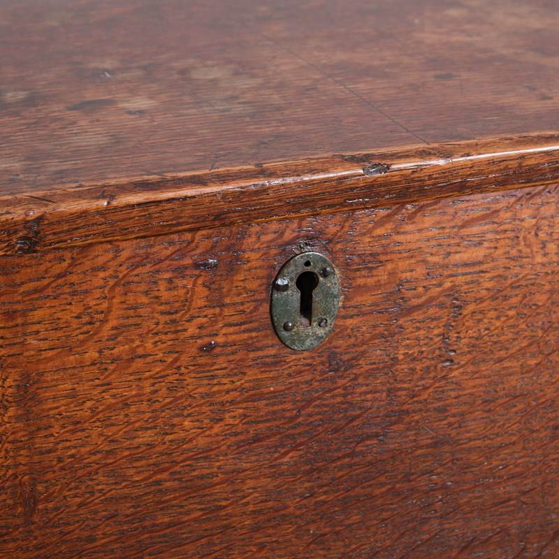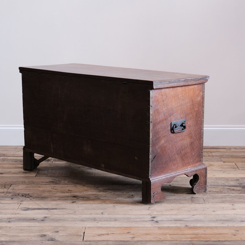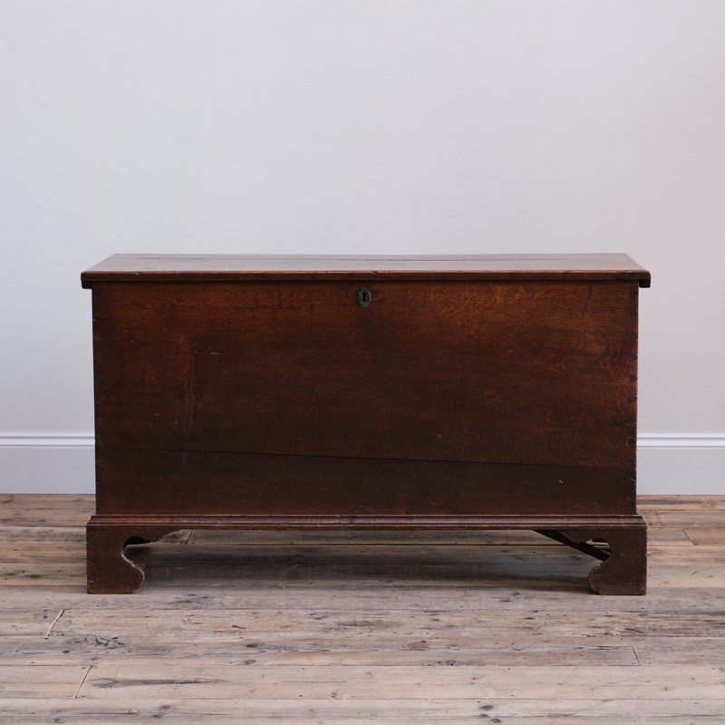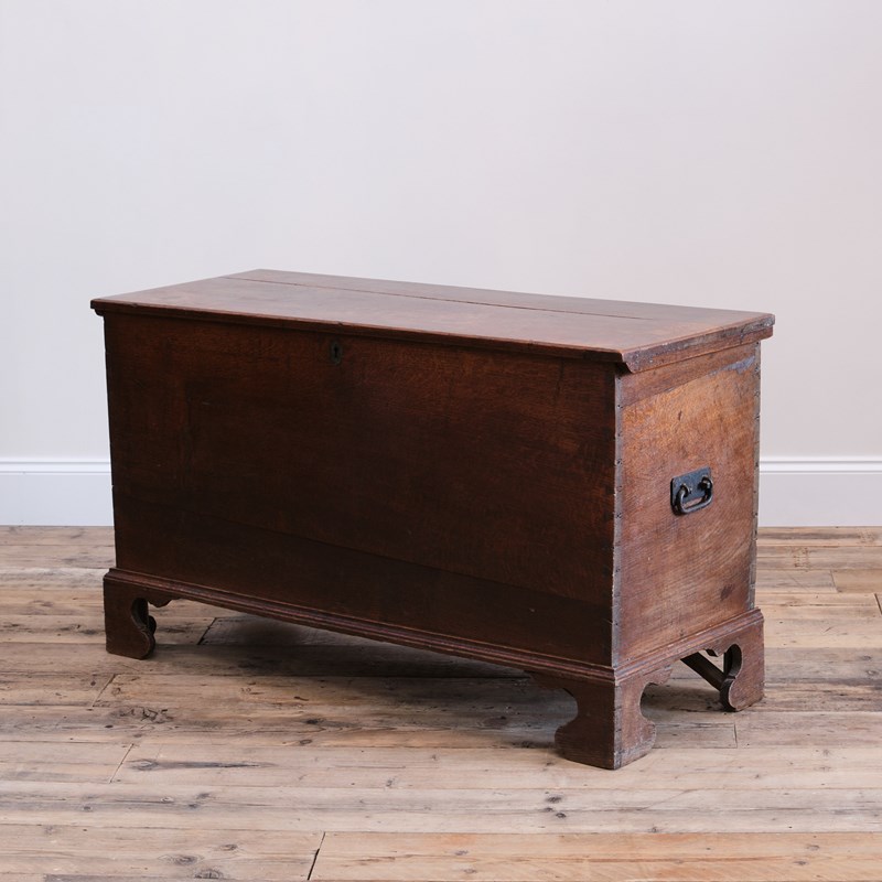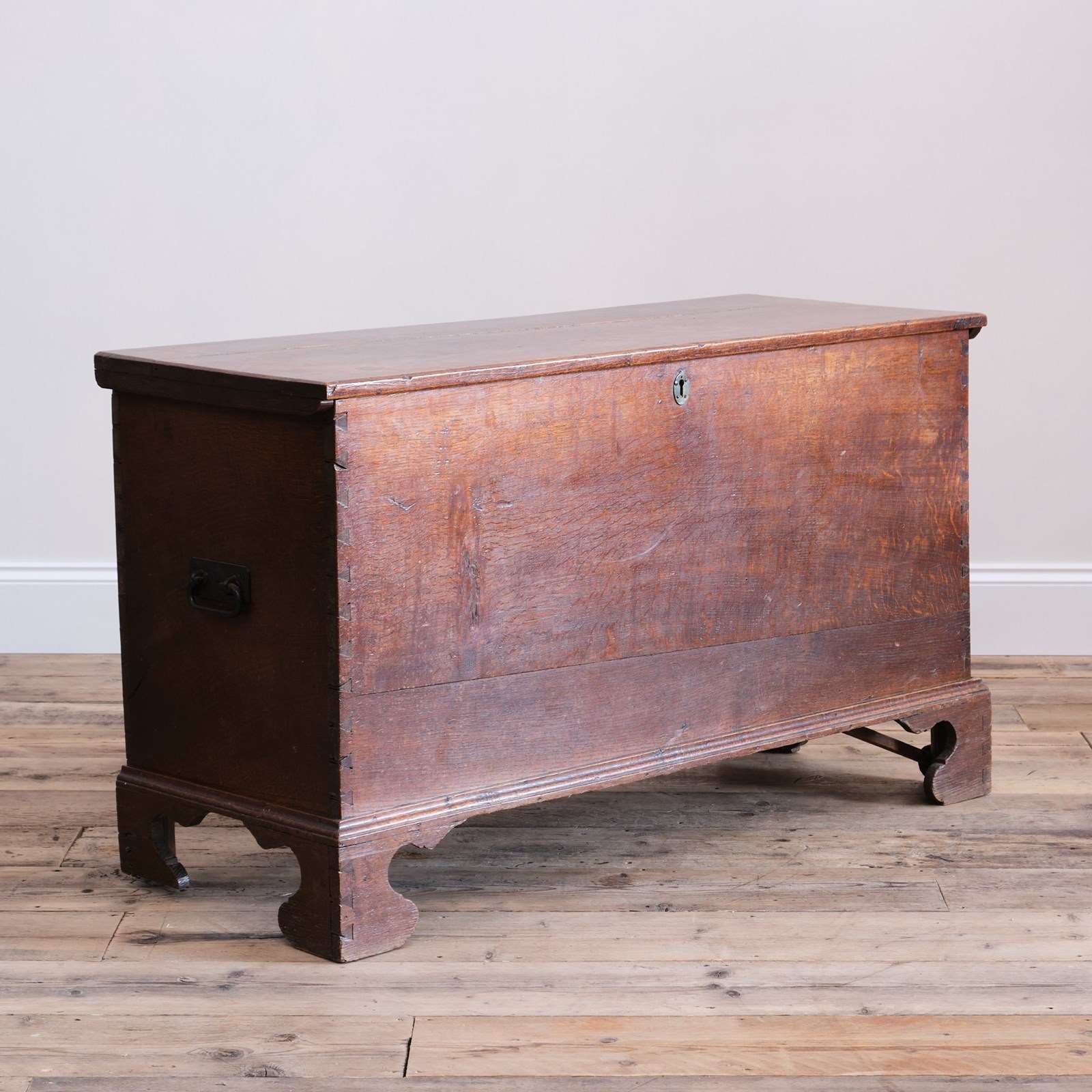A large Georgian oak blanket box on bracket feet. Retaining its original hardware but lacking the original key.