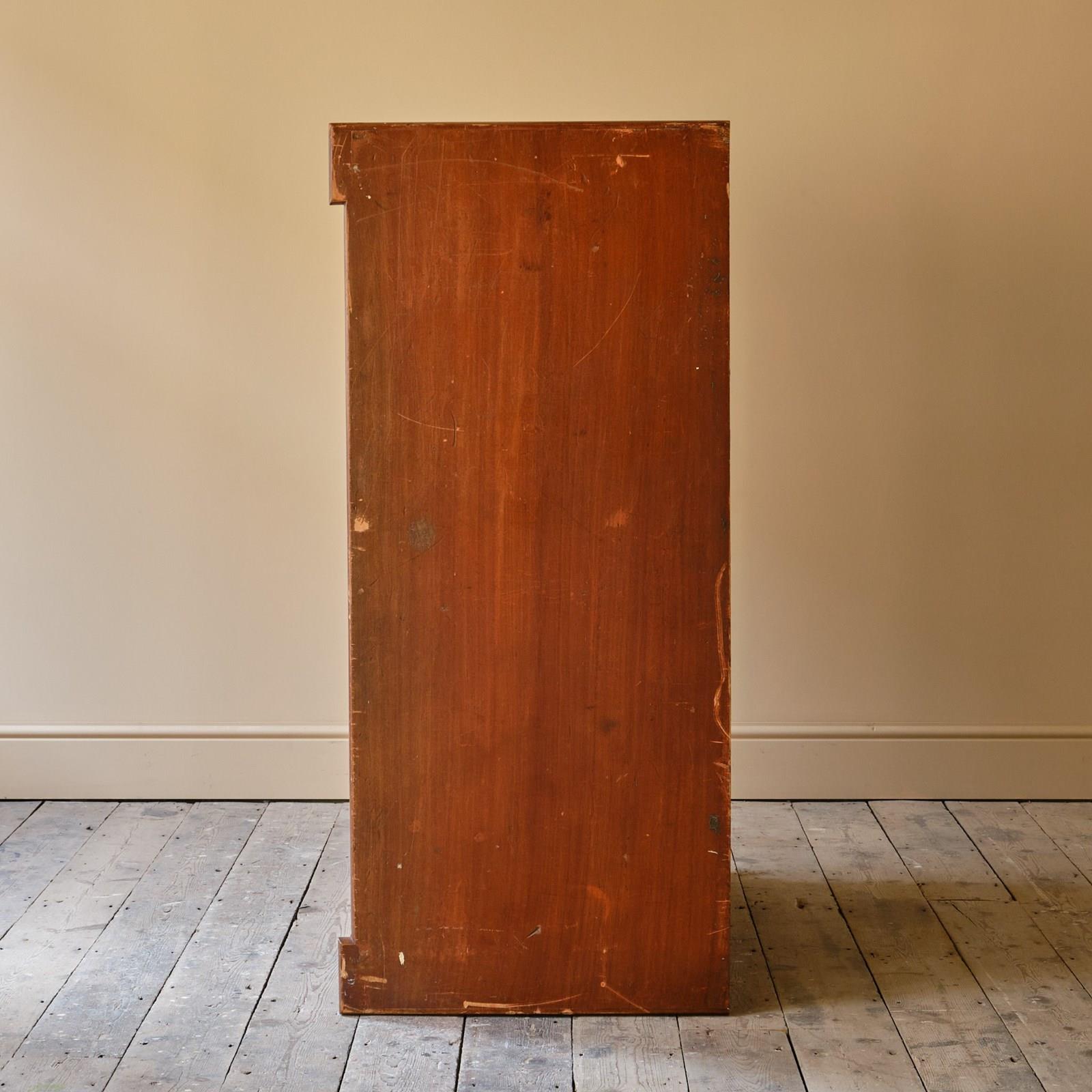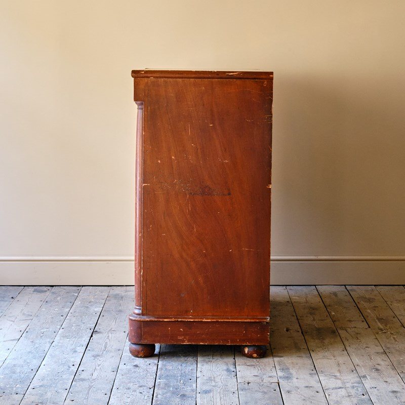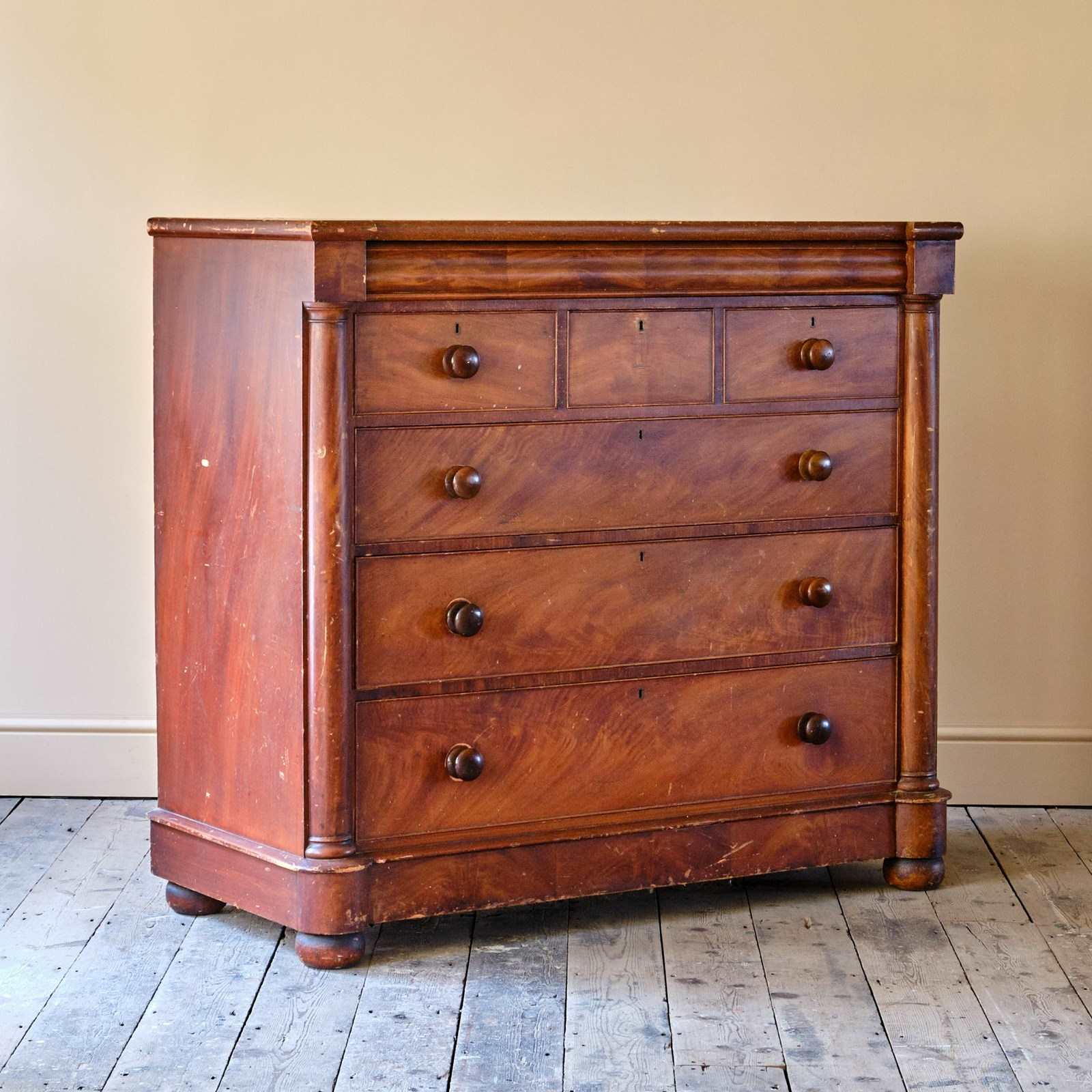 A large mid 19th century Scottish pine chest in its wonderful original simulated Mahogany paint. The drawers with the original fruitwood pulls Comprise of 3 drawers over 3 graduated drawers with a hidden drawer to the frieze all flanked by turned columns and raised on turned but feet.