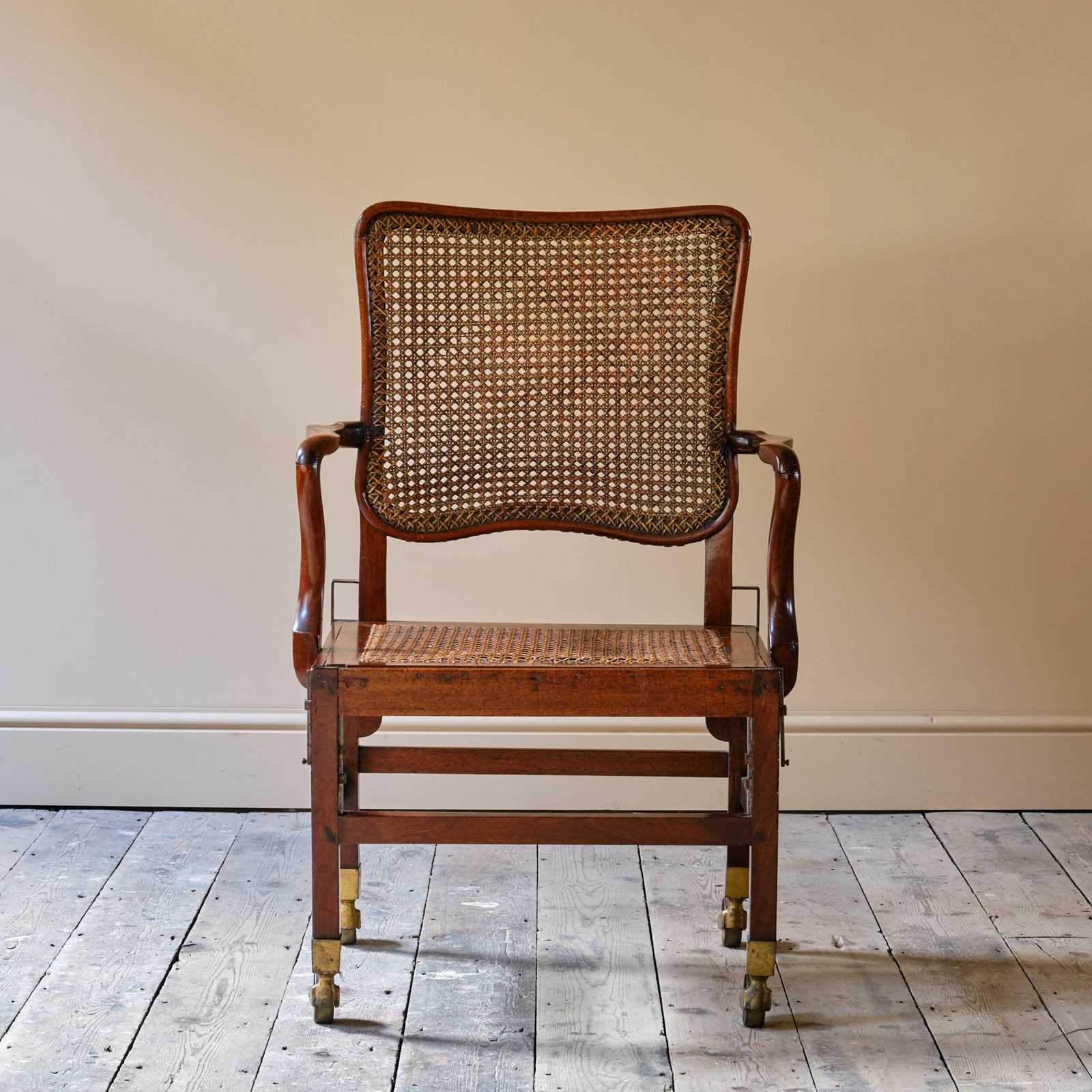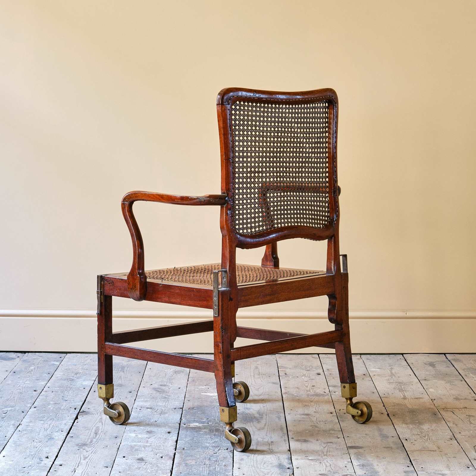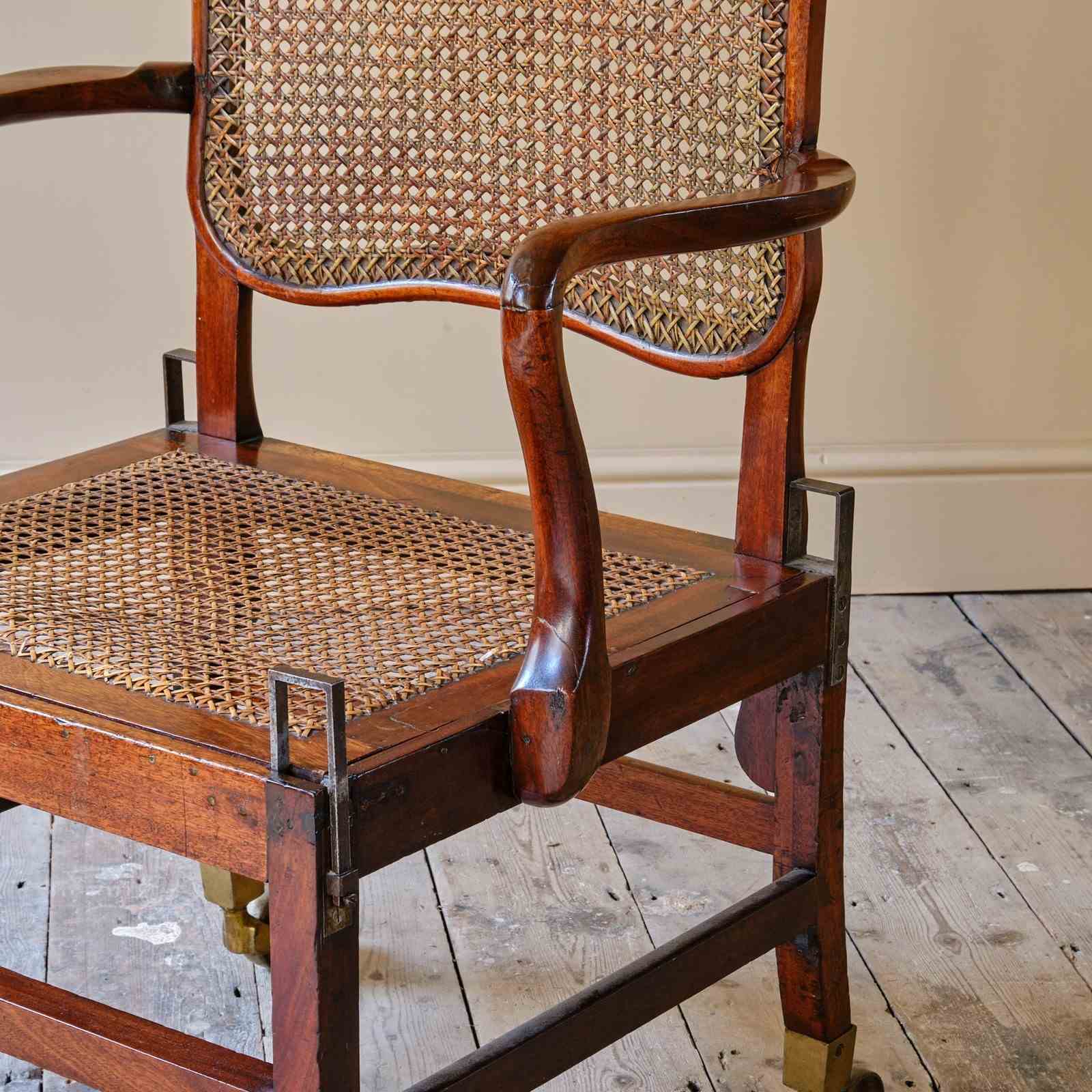 A late 18th century Mahogany Sedan armchair. Of wonderful form and good scale. The drop in seat and shaped back rest with rattan. With adjustable metal inserts for the carrying handles. Raised on square legs joined by stretchers and with the original oversized brass casters. c1780