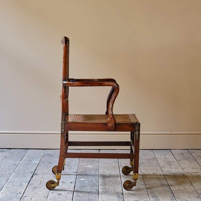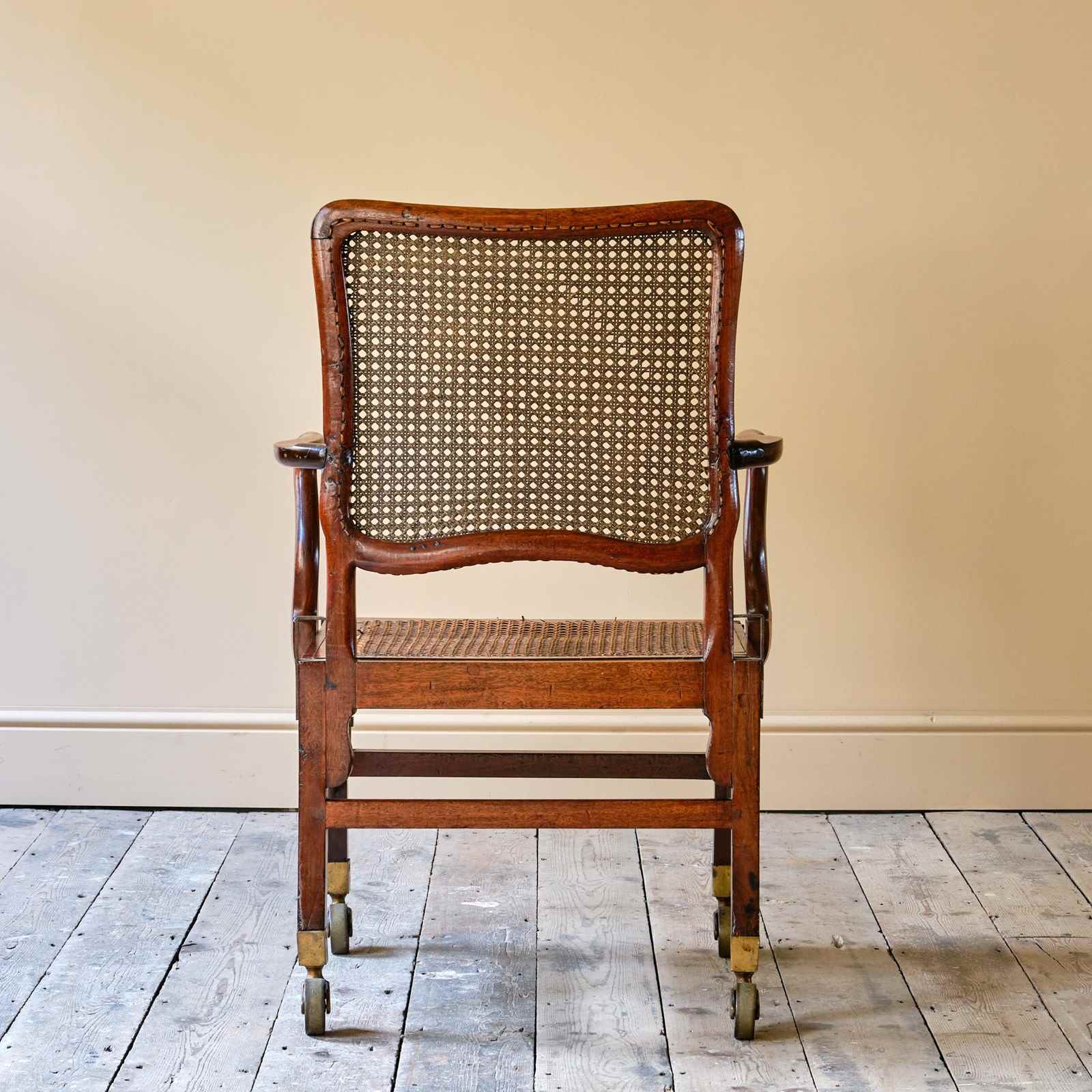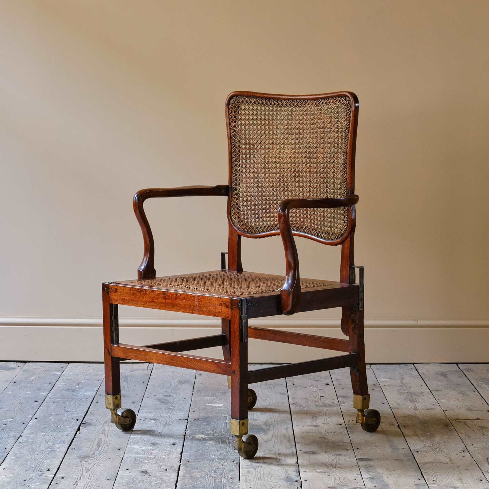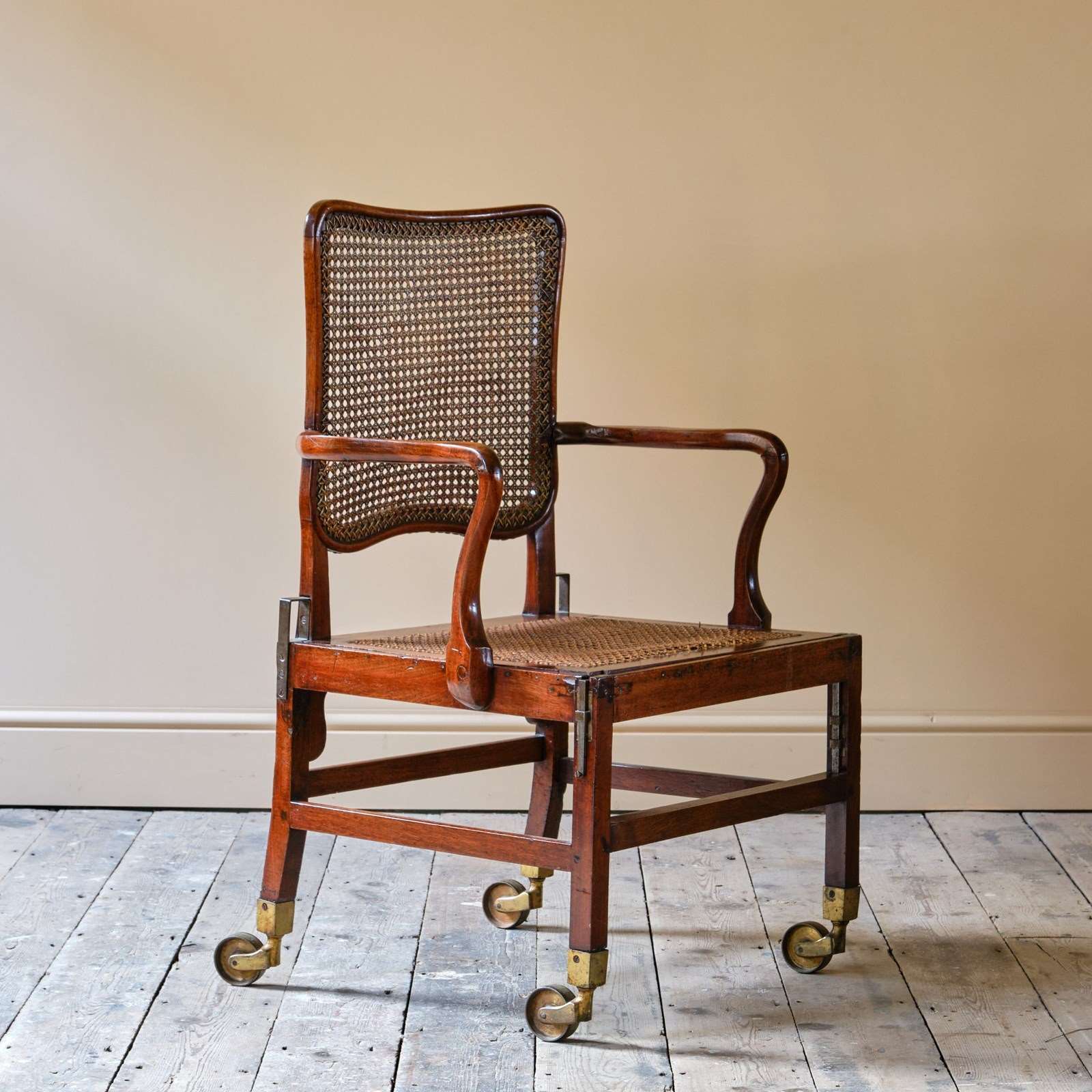 A late 18th century Mahogany Sedan armchair. Of wonderful form and good scale. The drop in seat and shaped back rest with rattan. With adjustable metal inserts for the carrying handles. Raised on square legs joined by stretchers and with the original oversized brass casters. c1780