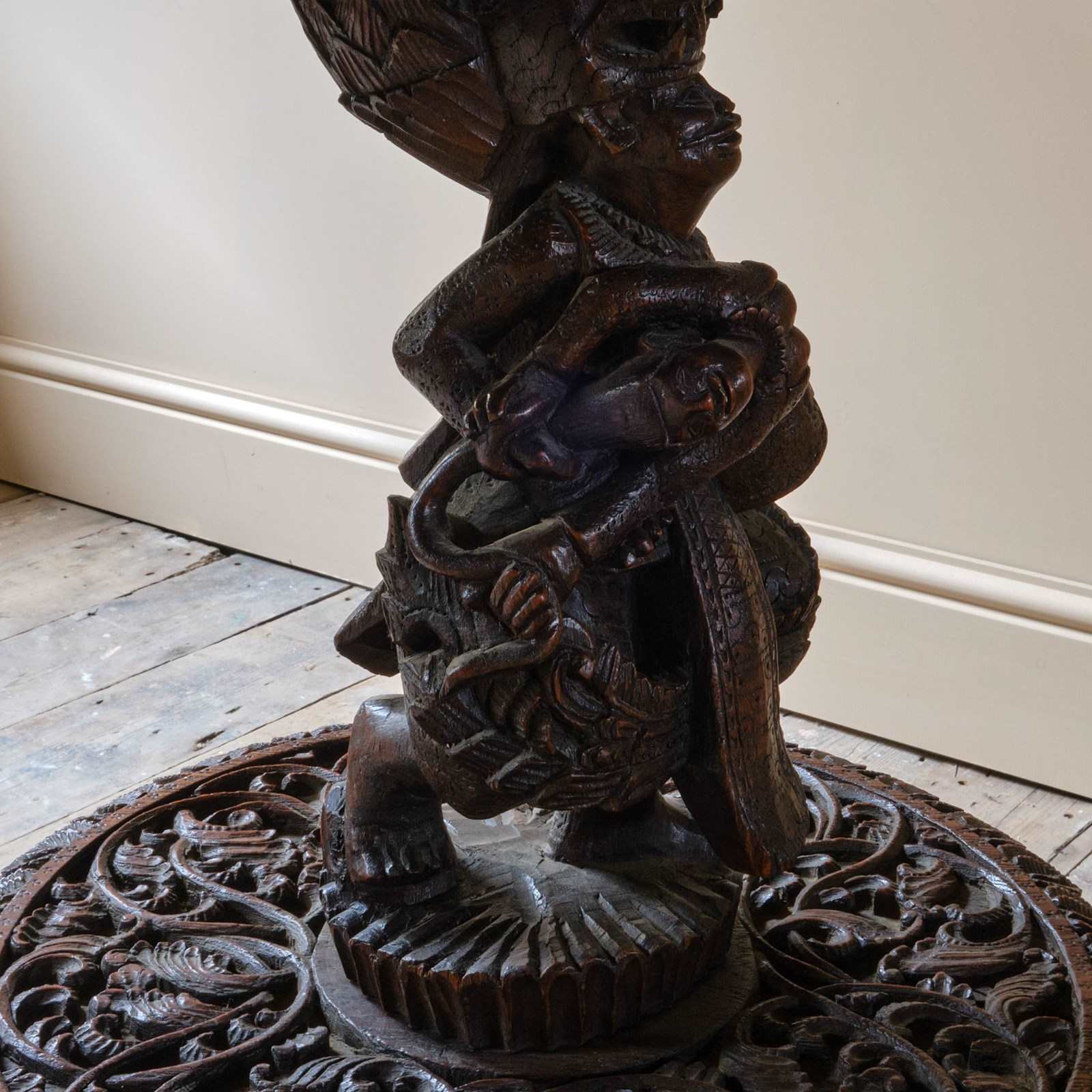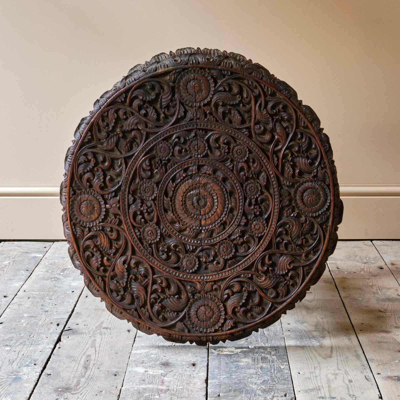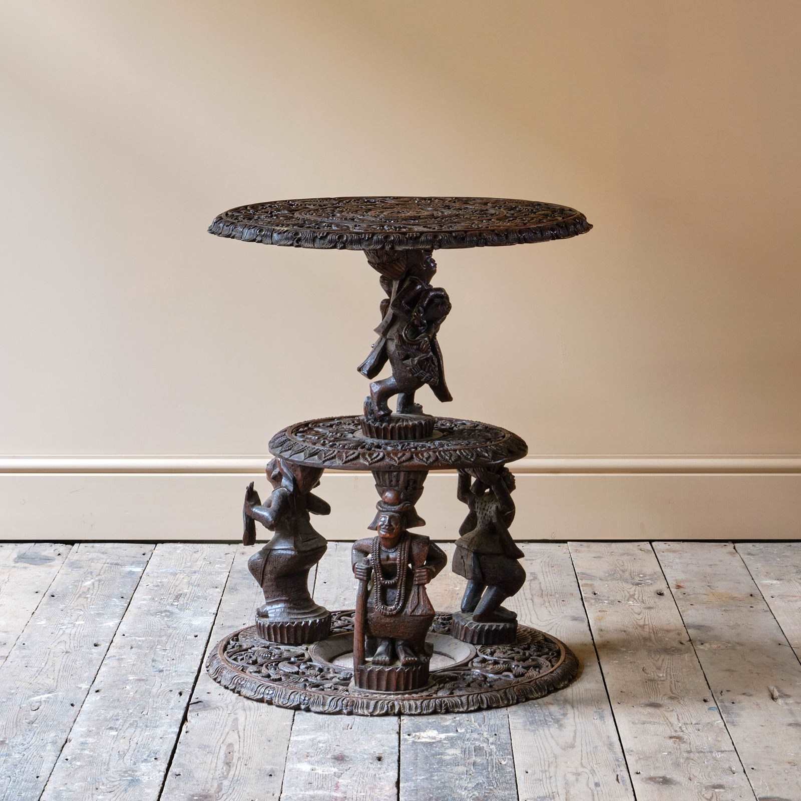 A profusely carved Burmese side table with nicely carved figure supports and decorative tops. A good example in good order.