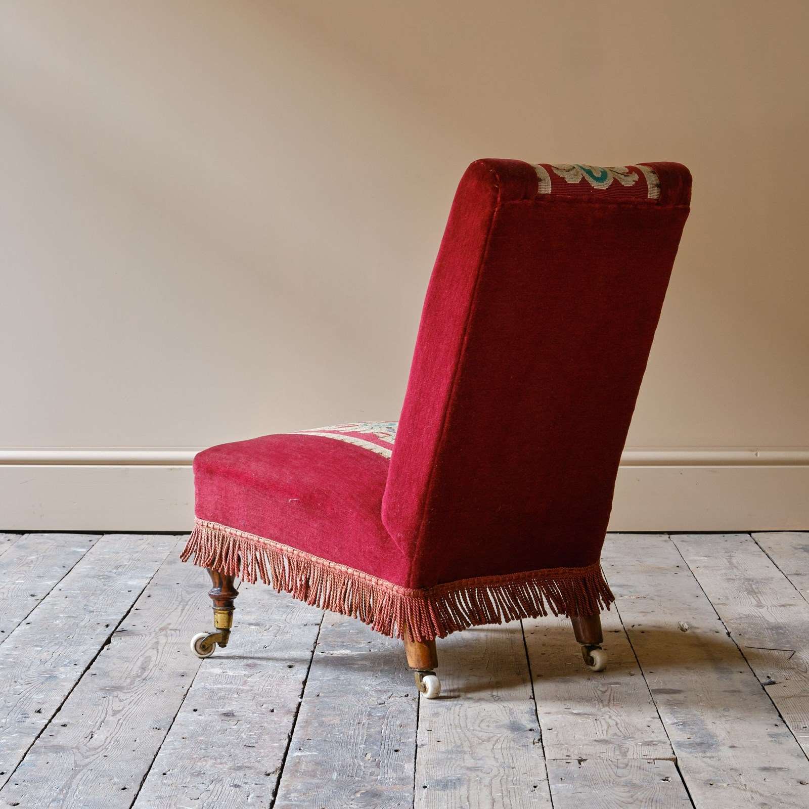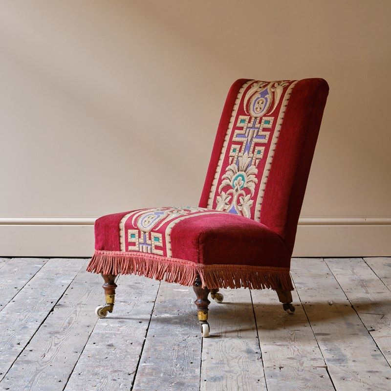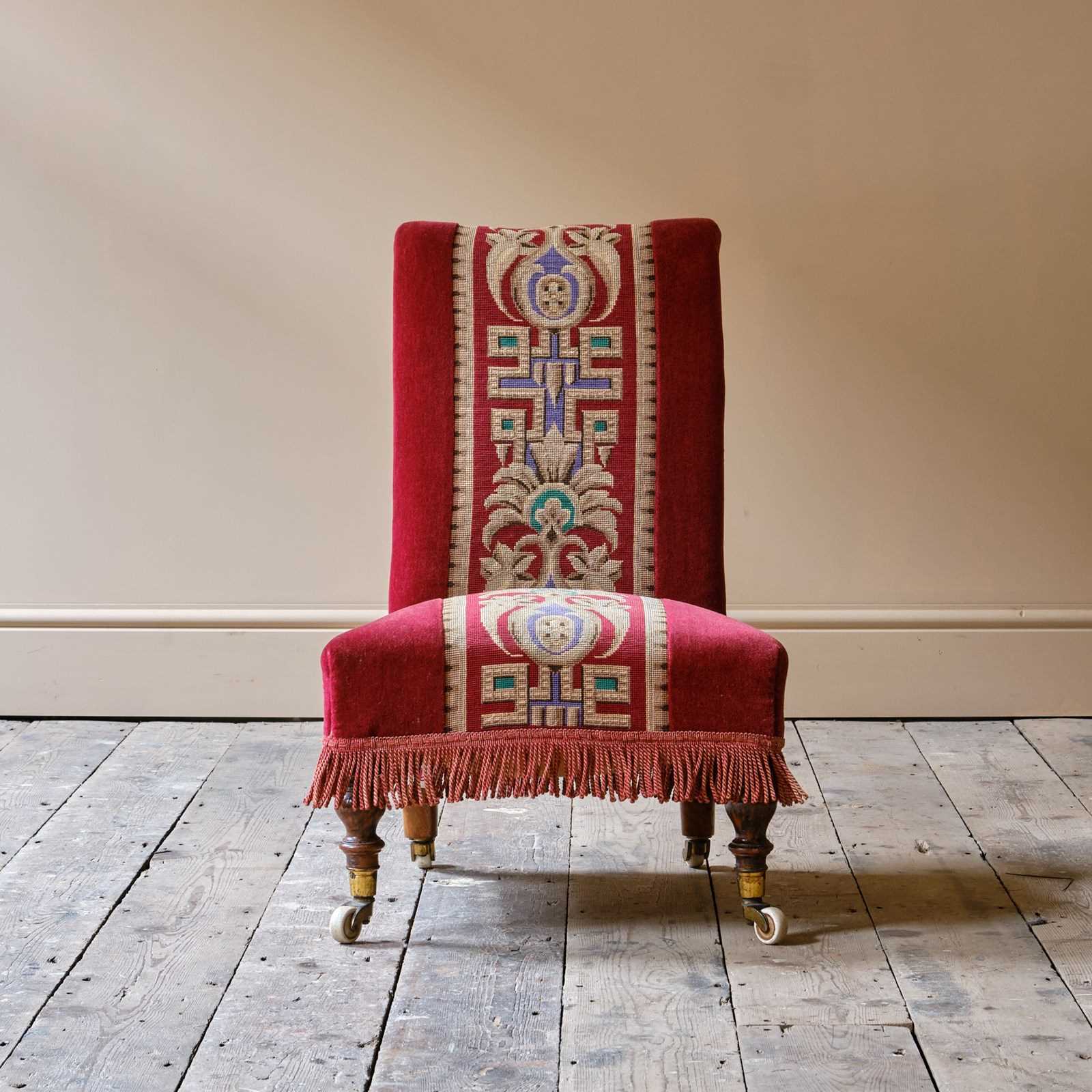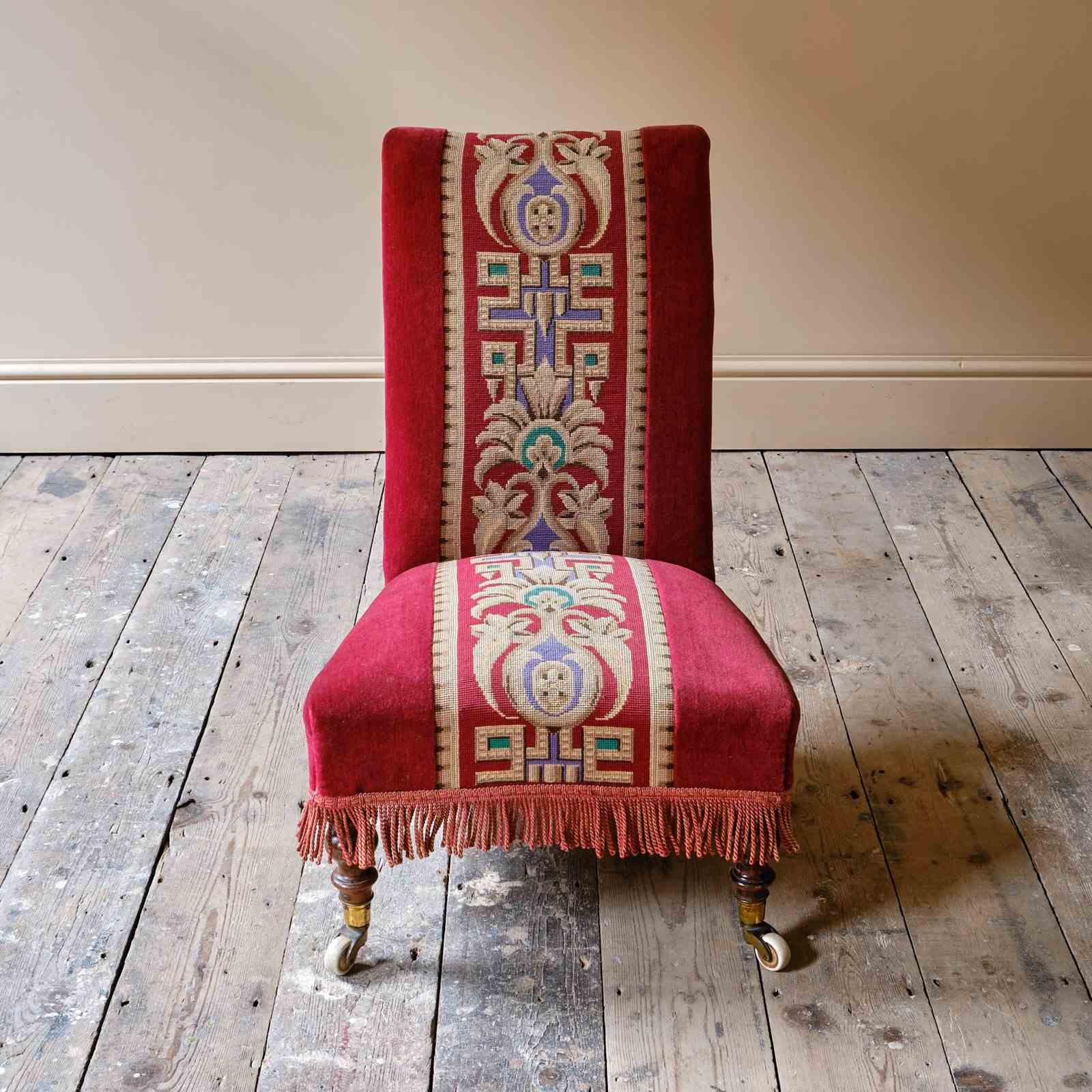 A good quality late 19th century slipper chair upholstered in red velvet and needlework Raised on walnut legs and the original casters.