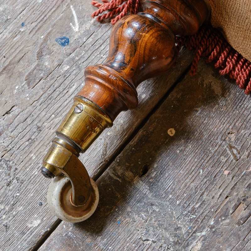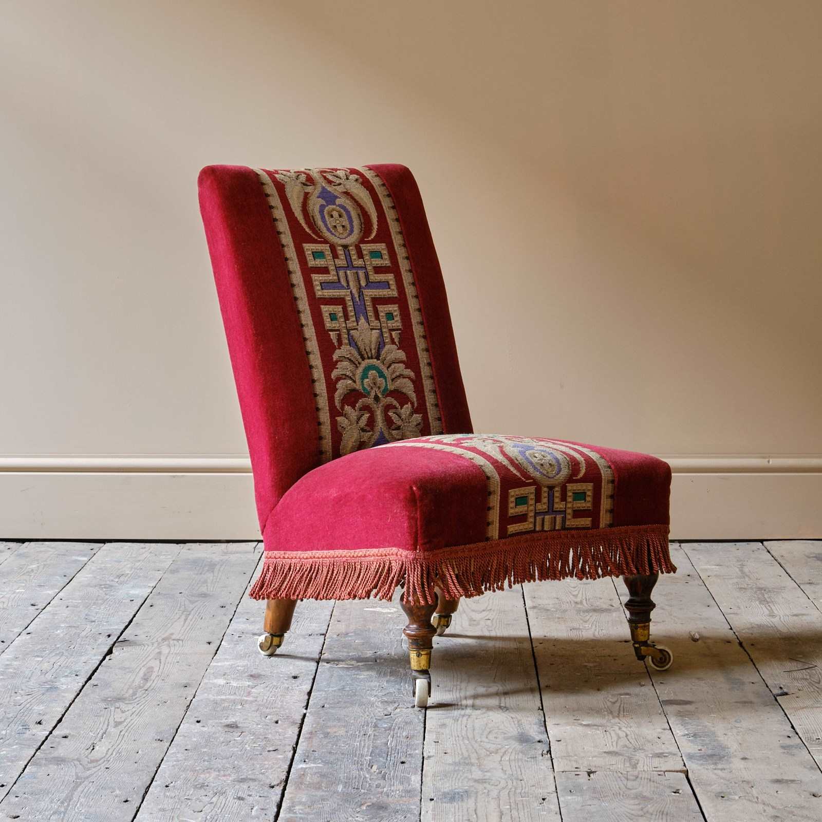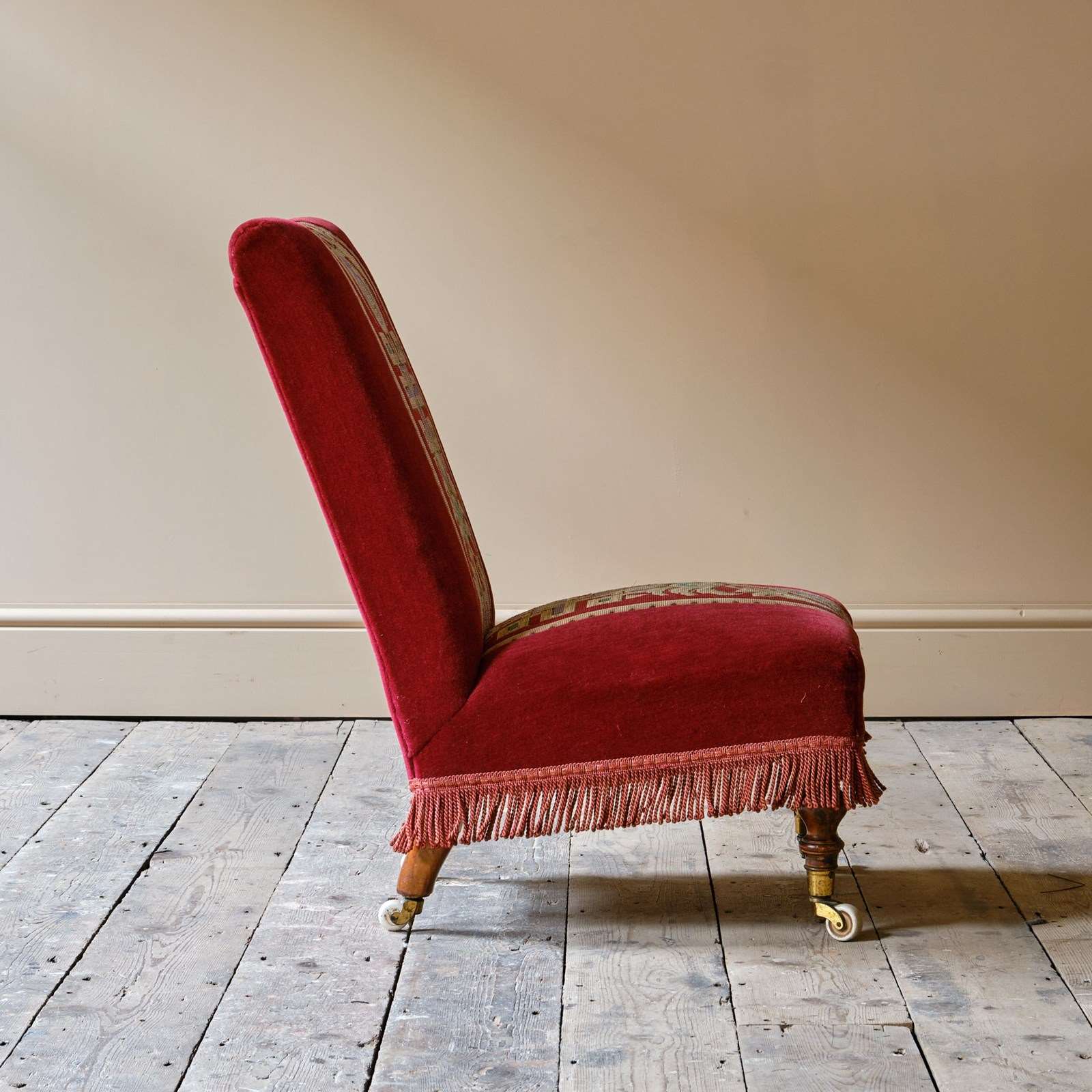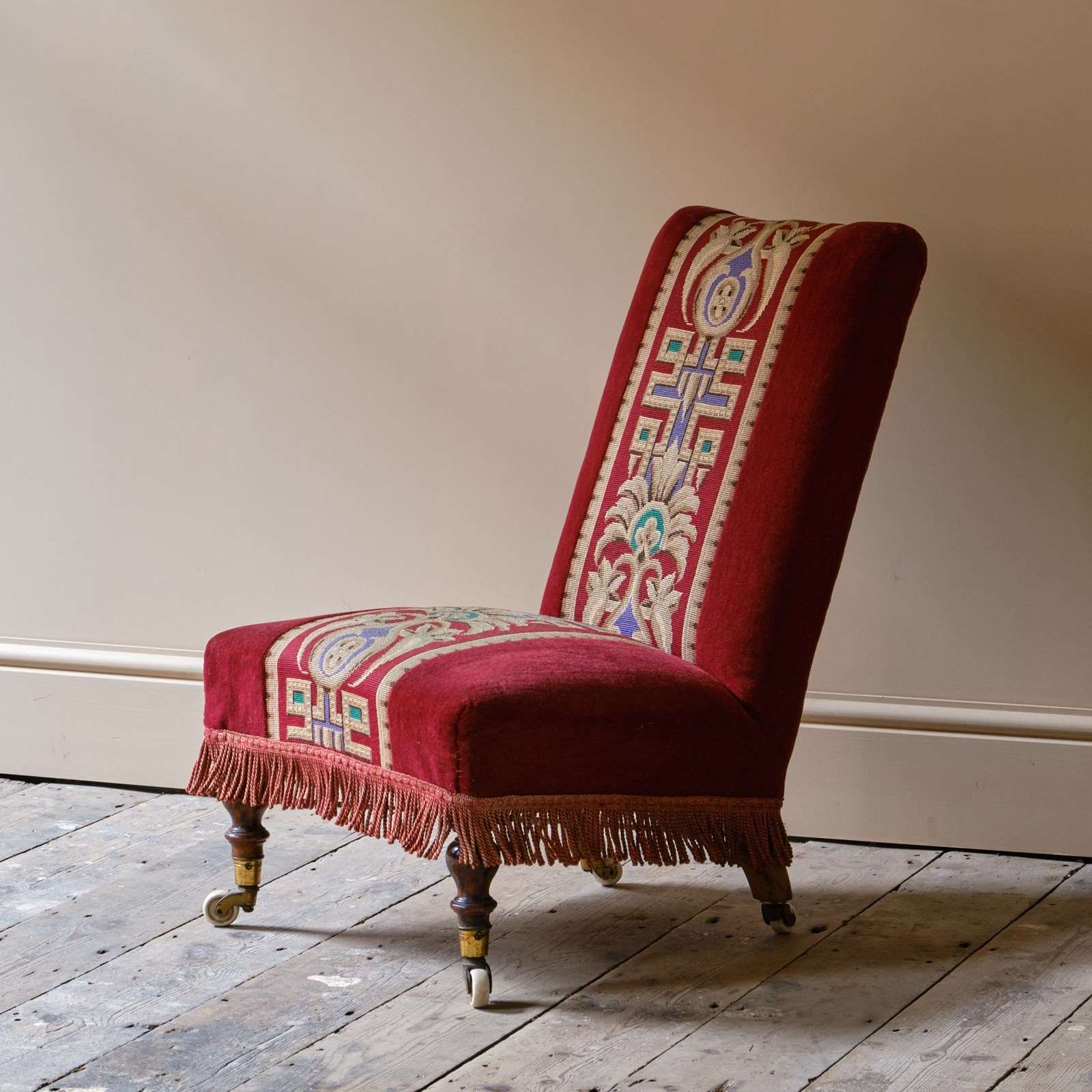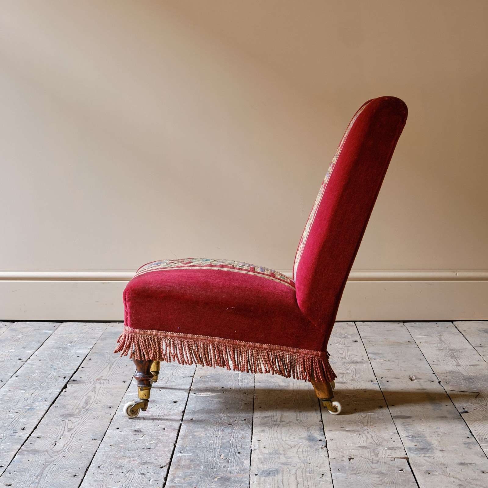 A good quality late 19th century slipper chair upholstered in red velvet and needlework Raised on walnut legs and the original casters.