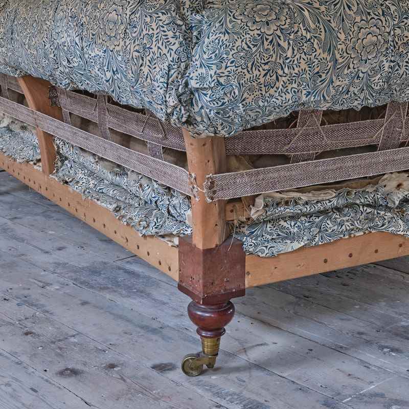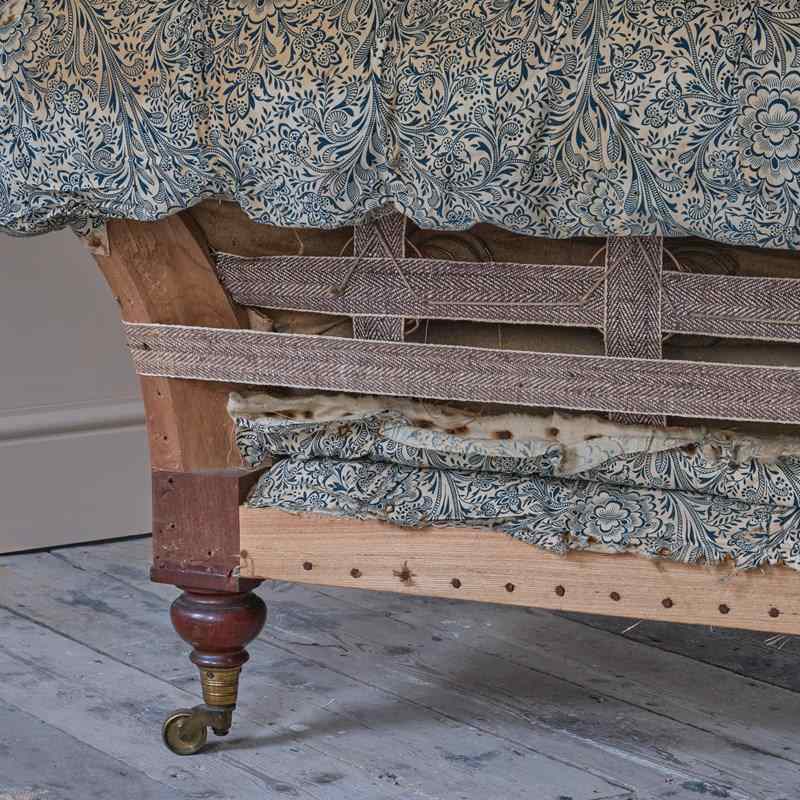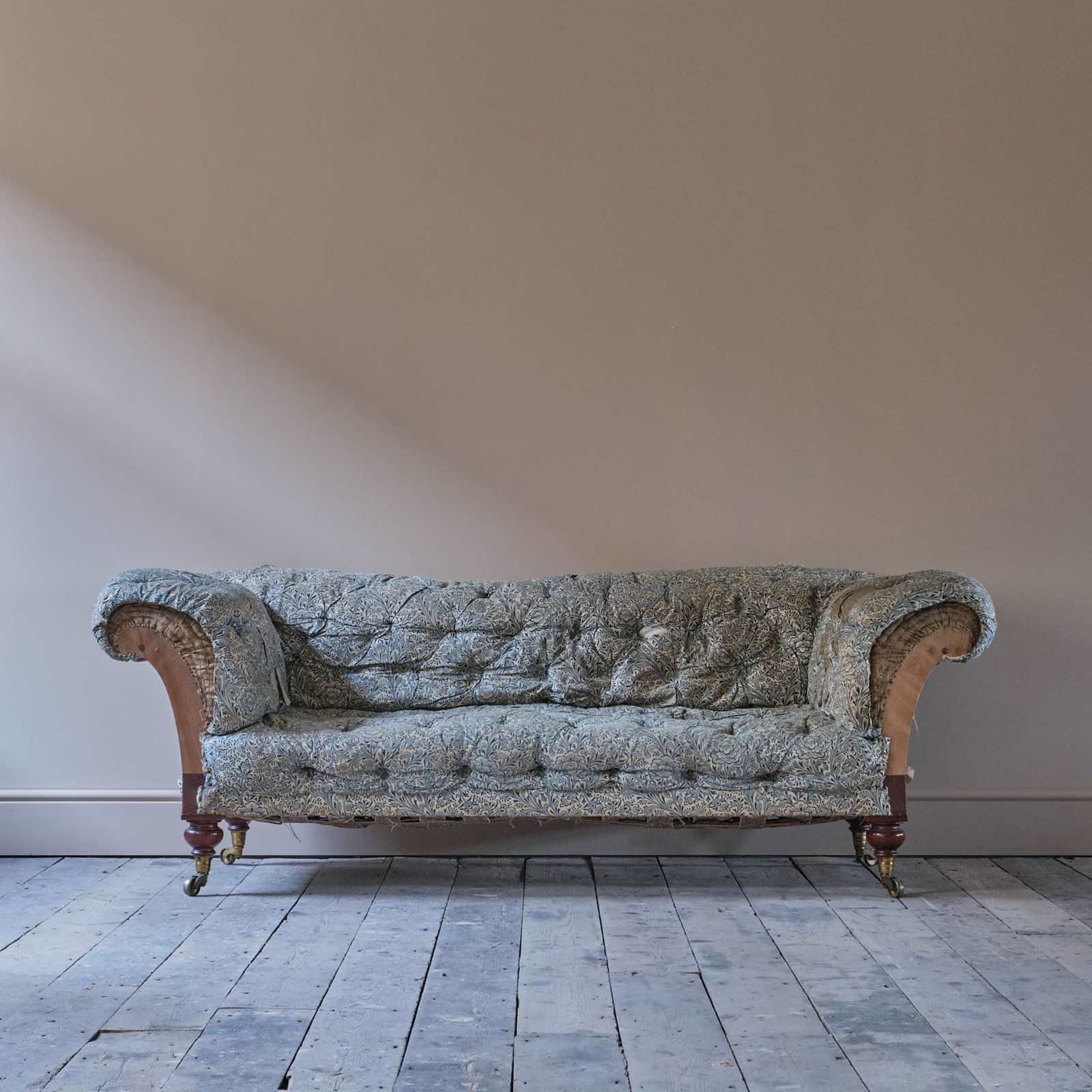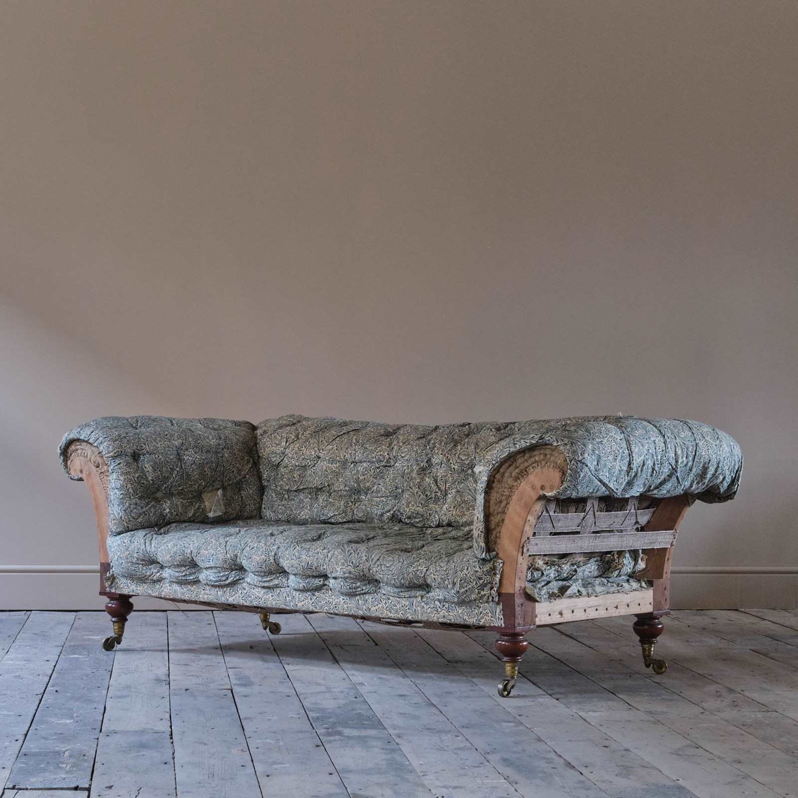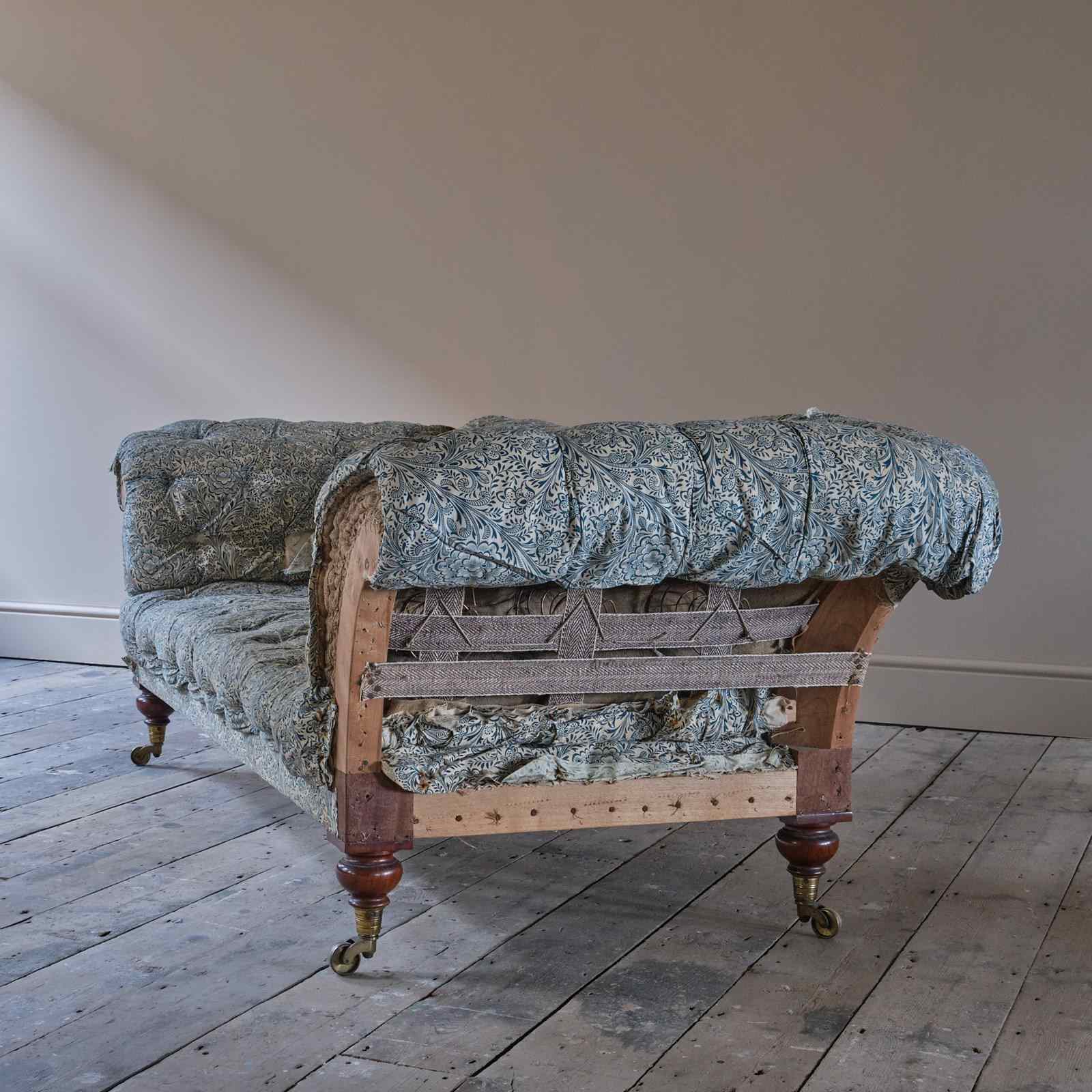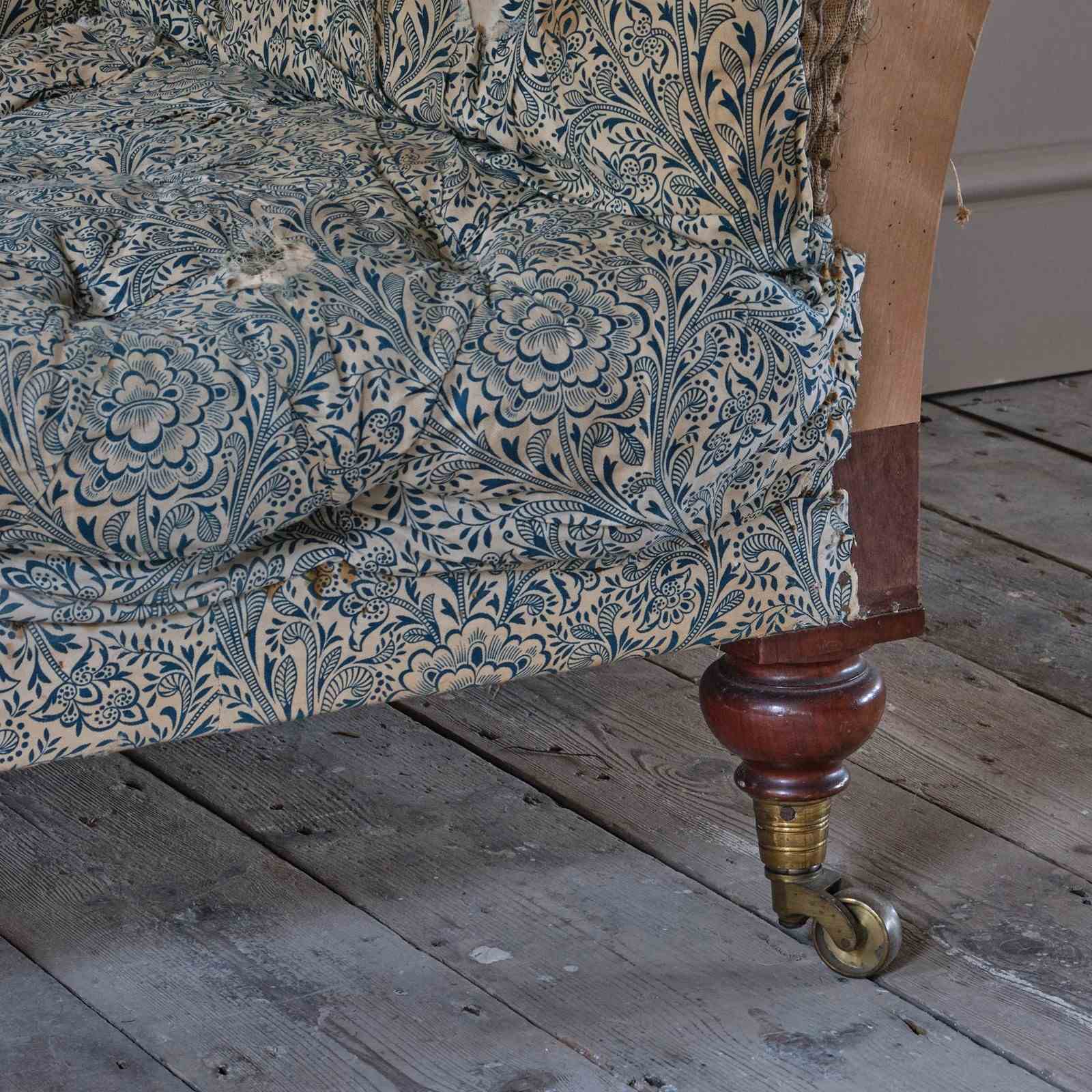 A well drawn mid 19th century country house chesterfield sofa which retains its original fabric, buttoned and sprung fillings to the arms, back and seat which all remain in comfortable condition. We believe this sofa has only had one additional covering which we have removed. The frame is constructed in Oak and Birch with 4 turned mahogany legs and all retain the original brass casters. The timber which is in remarkably well preserved condition is in good solid order with tight joint.