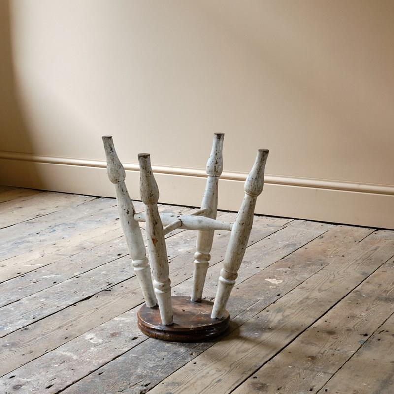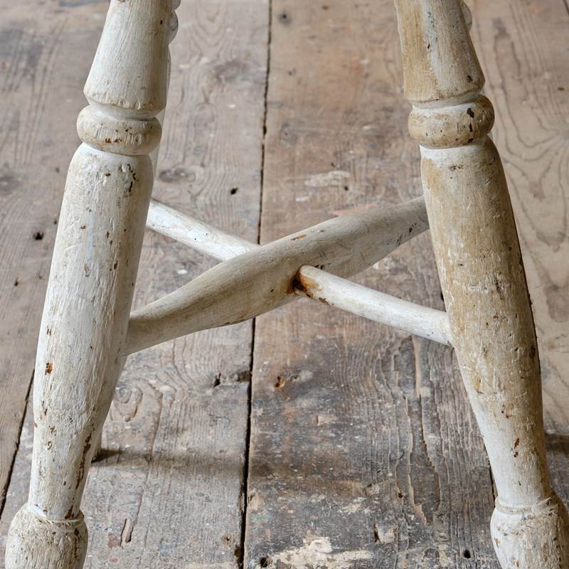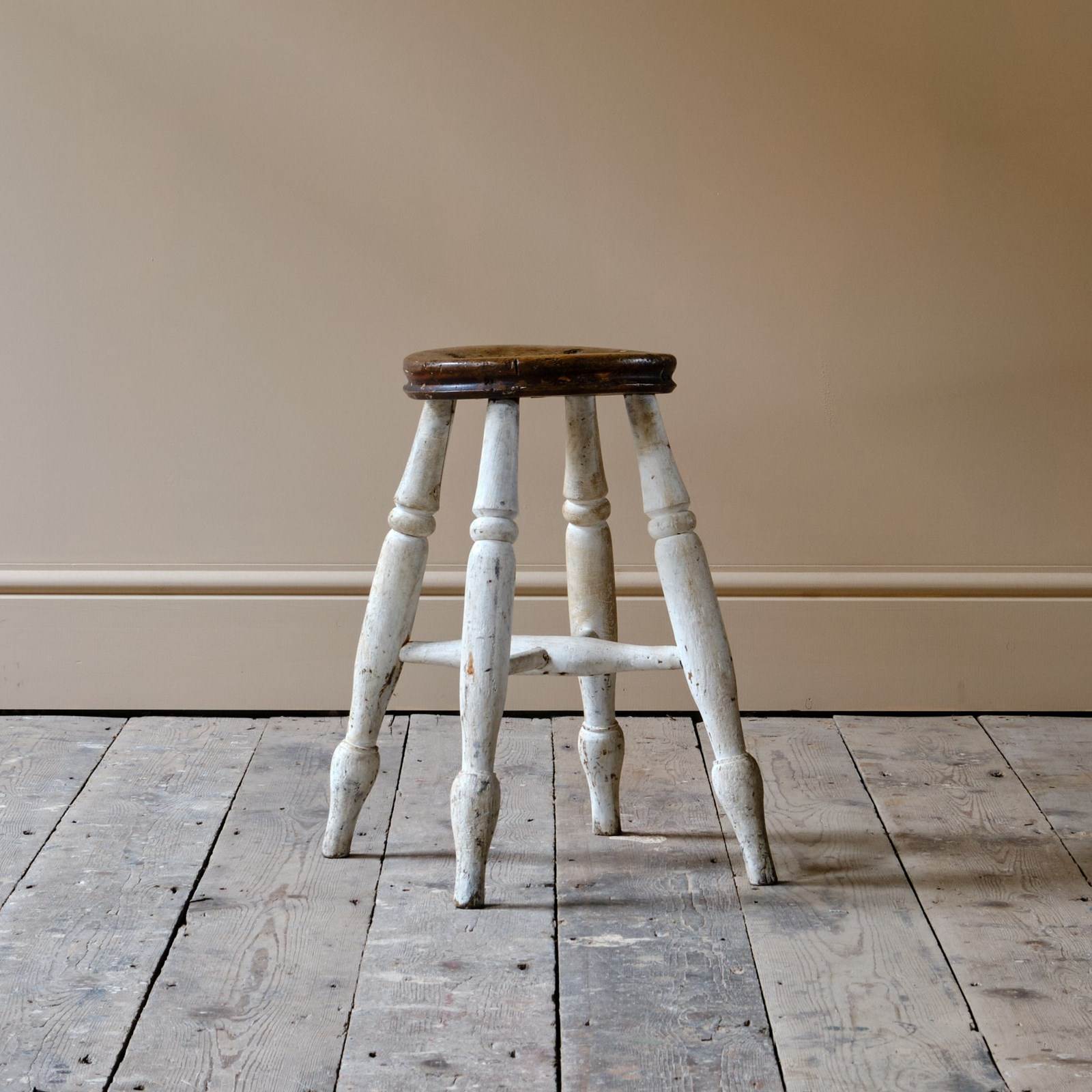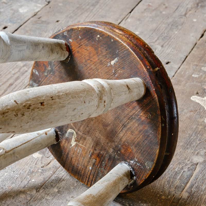 A mid 19th century dairy stool in later white paint and a Sycamore top.