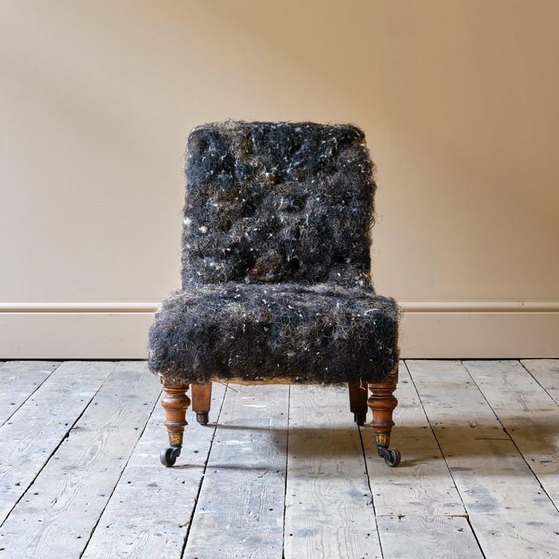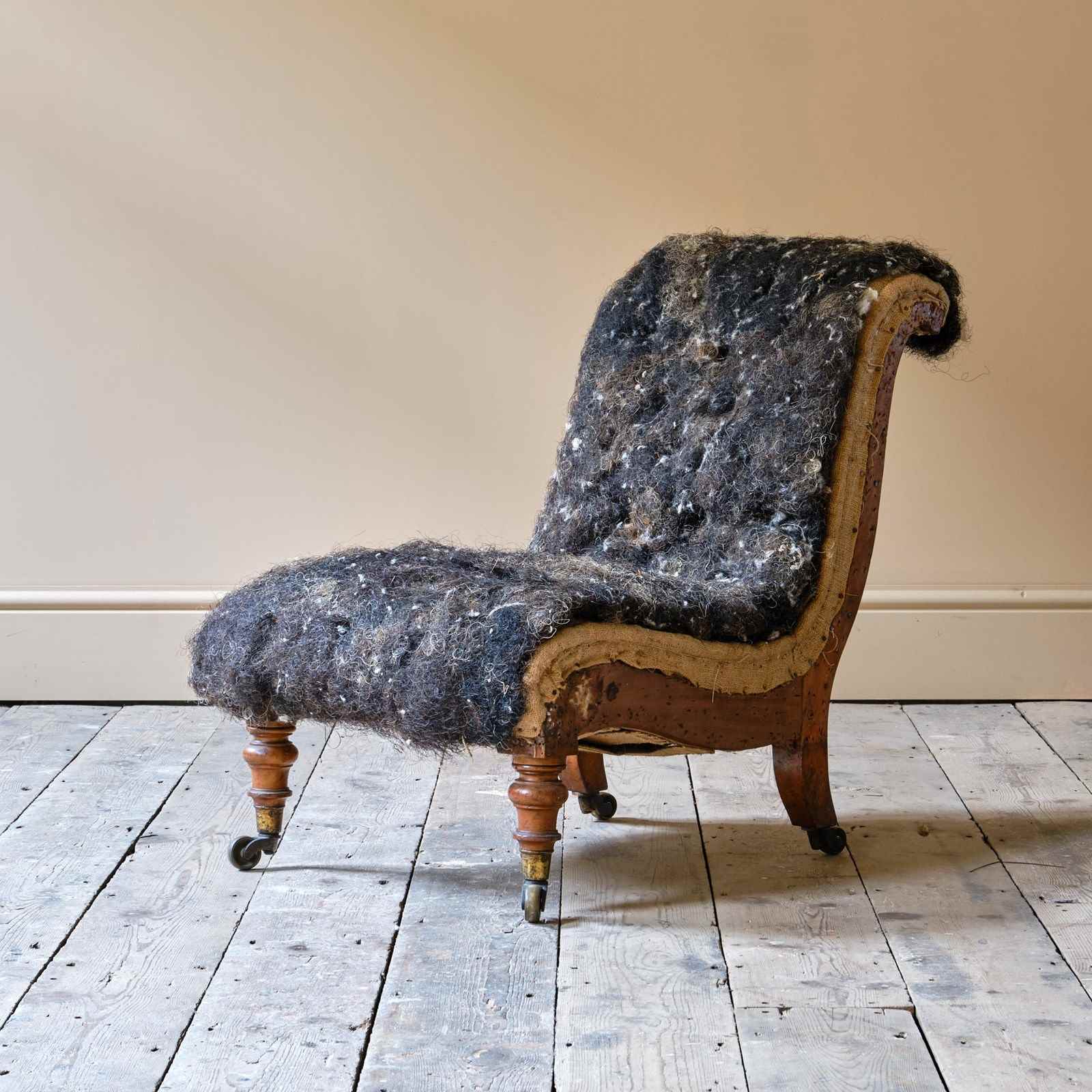 The chair retains its original horse hair buttoned top layer. Overall in good solid order with slight play to the back where it joins the seat. This will be restored by our upholsterer should you use us for the upholstery.