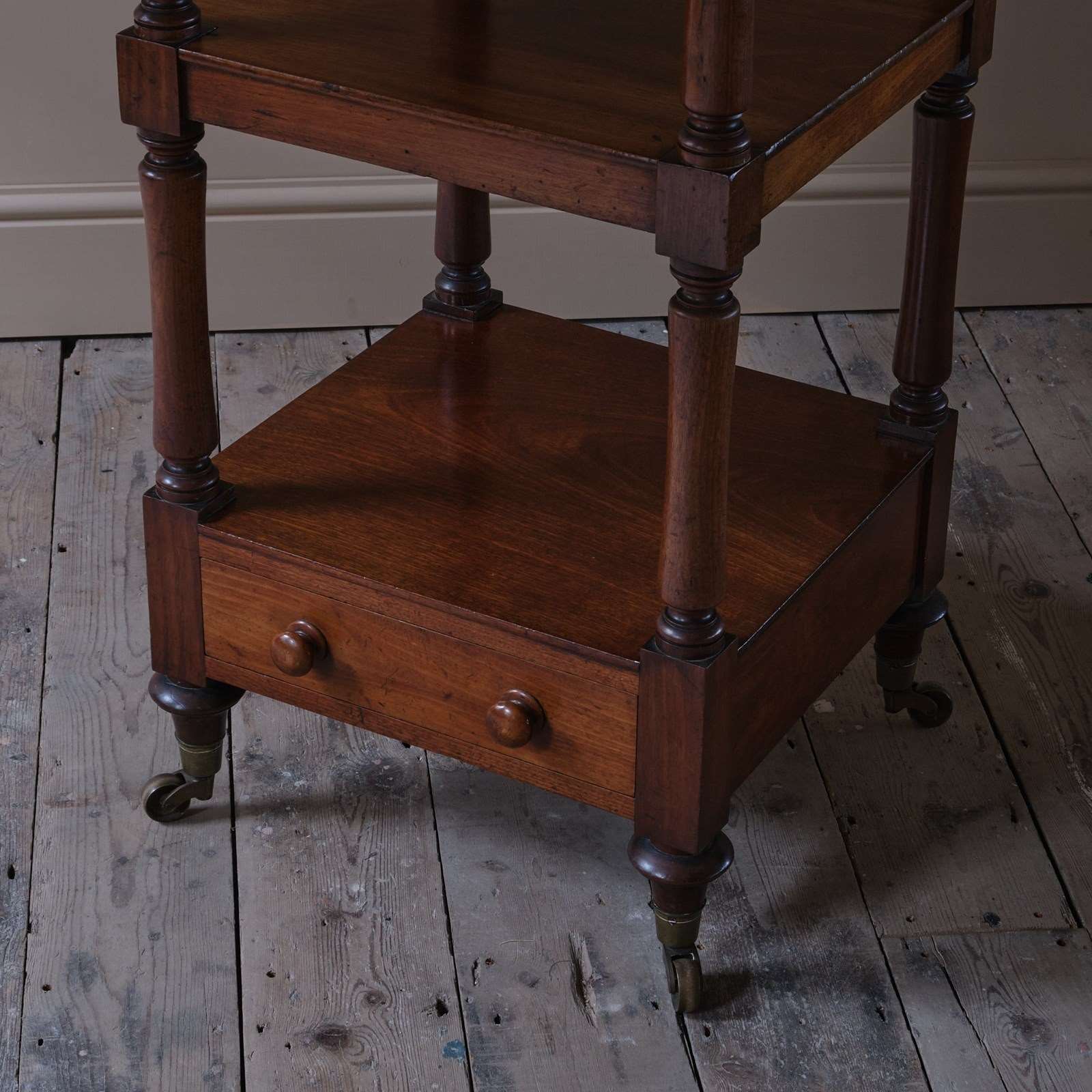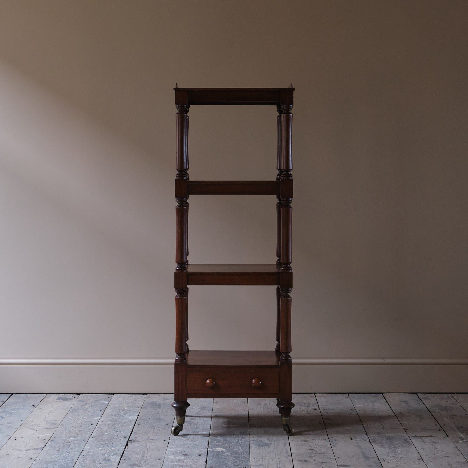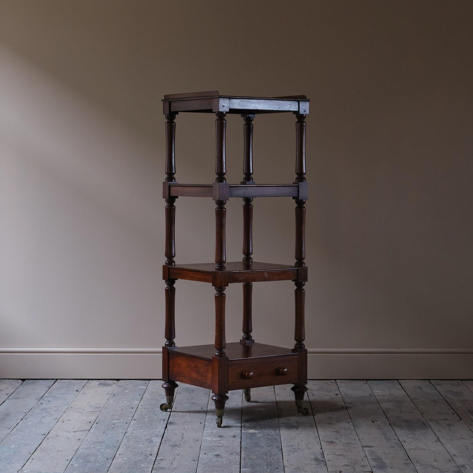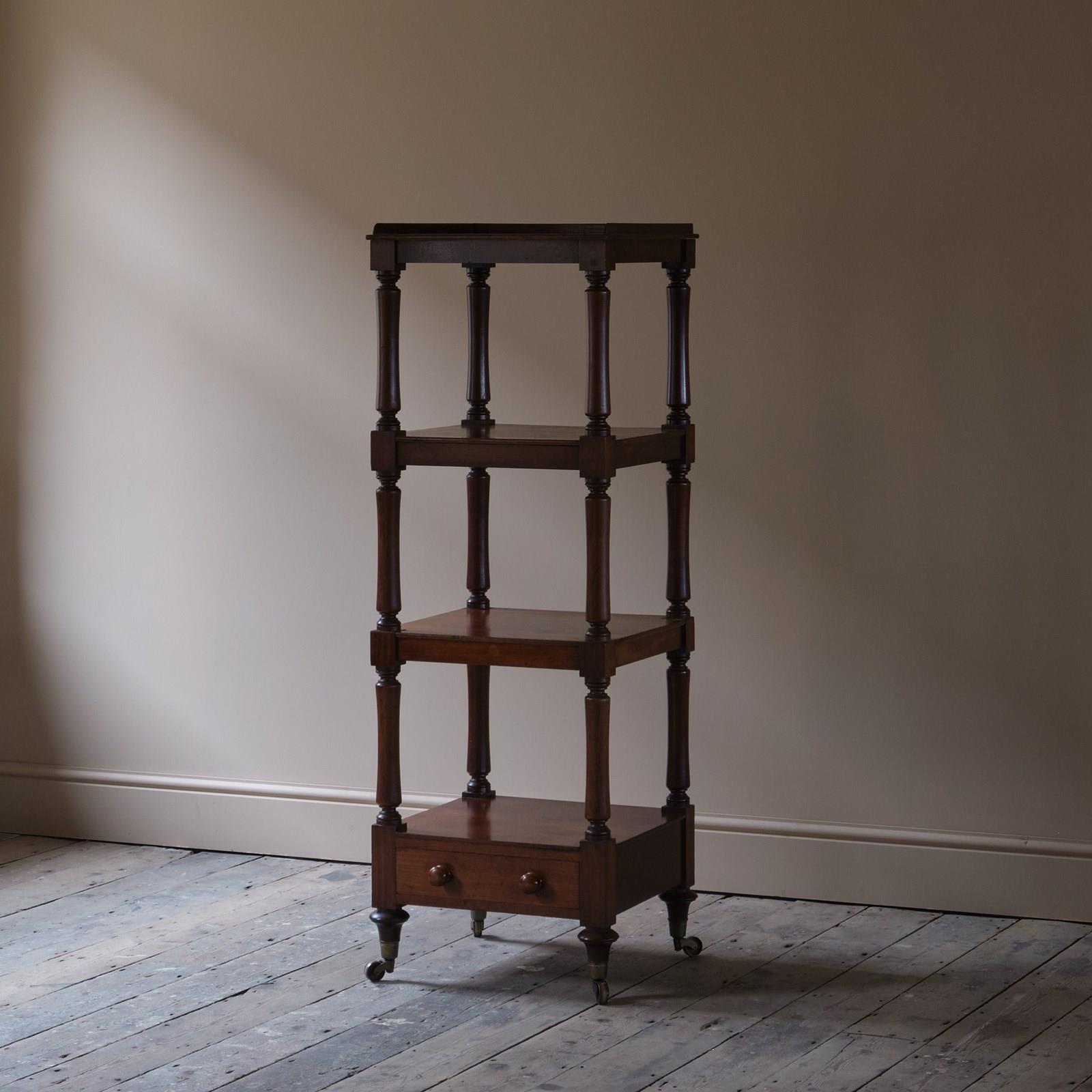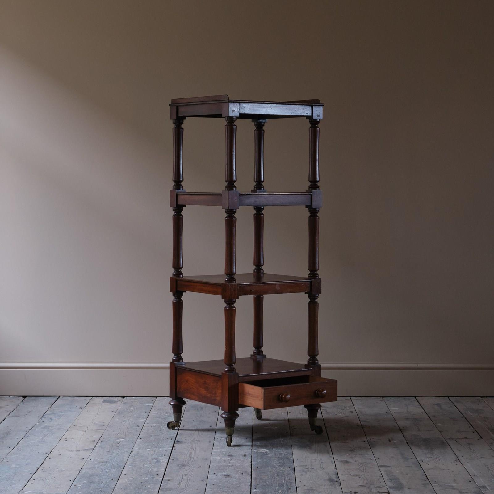 A good quality mid 19th century English 4 tier whatnot. Raised on short turned legs and the original brass casters. c1840