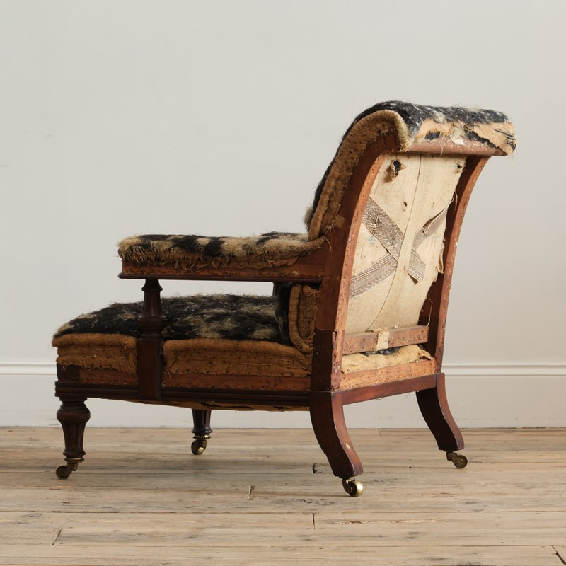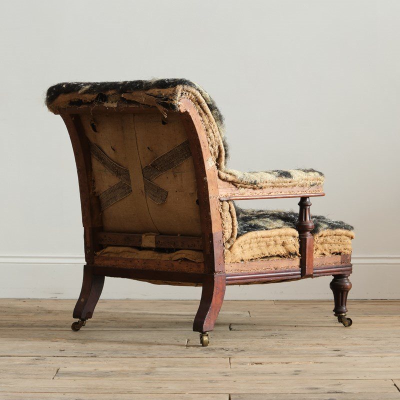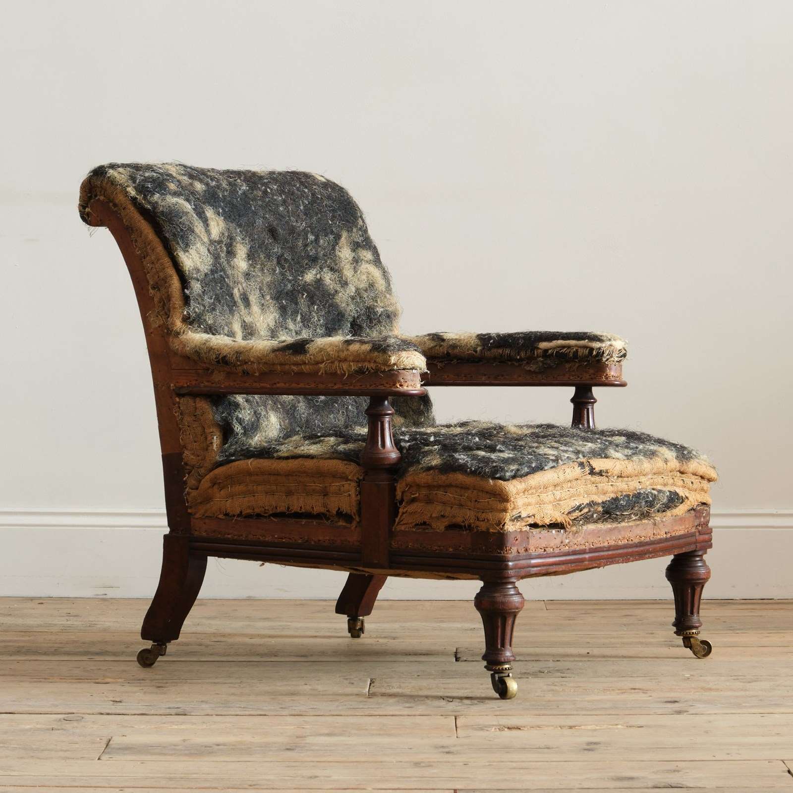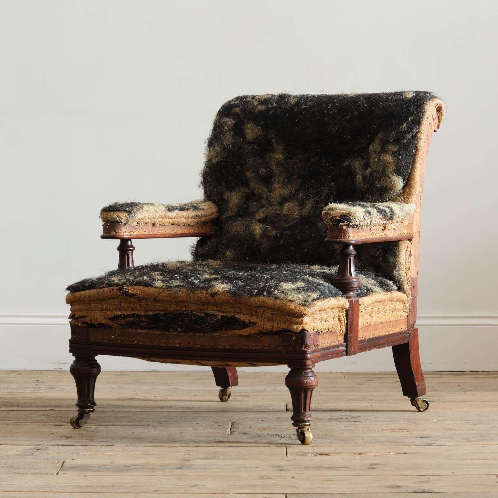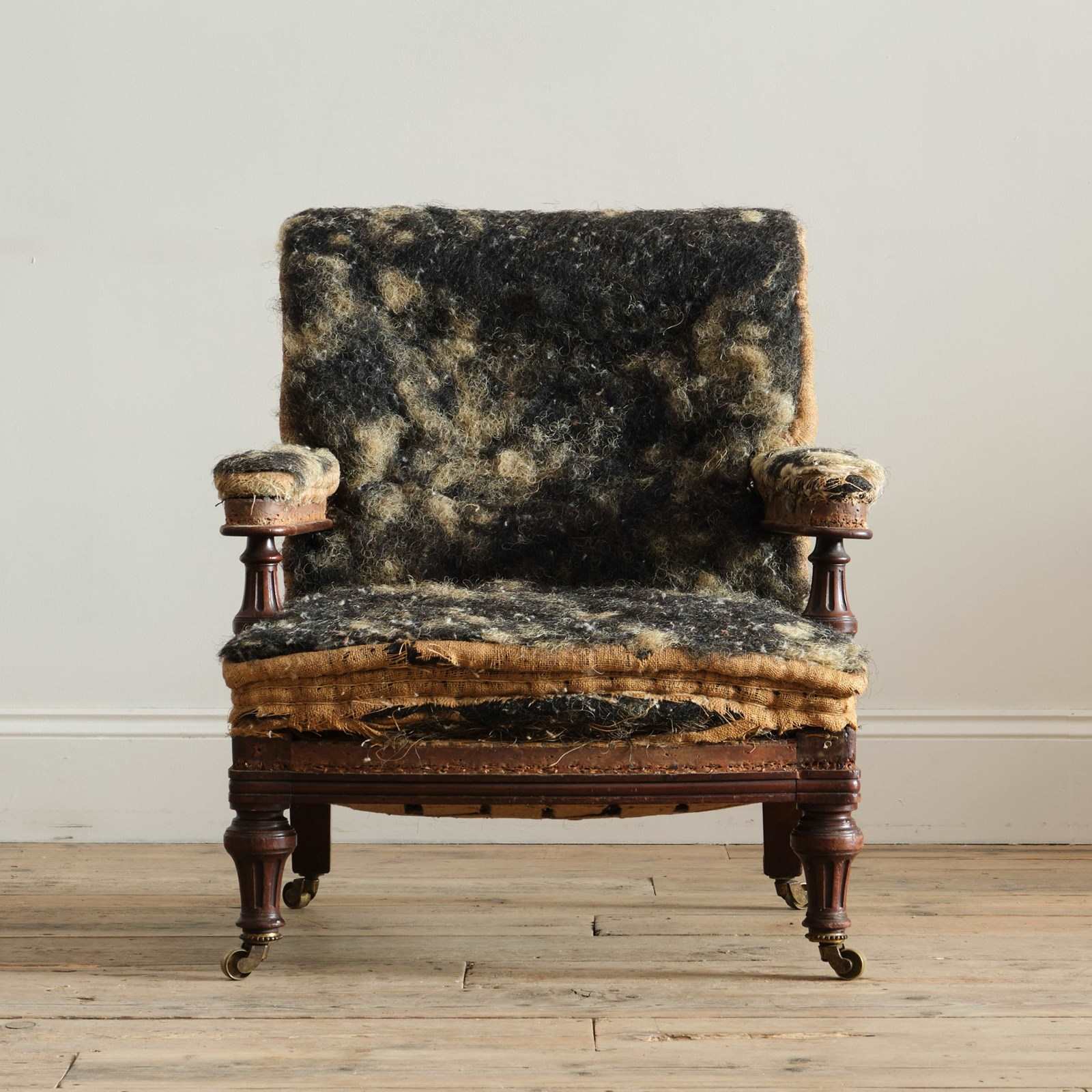 A superb little mid 19th century open armchair by Holland & Sons - London. C 1860. Raised on walnut turned and fluted legs and arm supports with splayed rear legs. One back leg bearing the makers stamp.