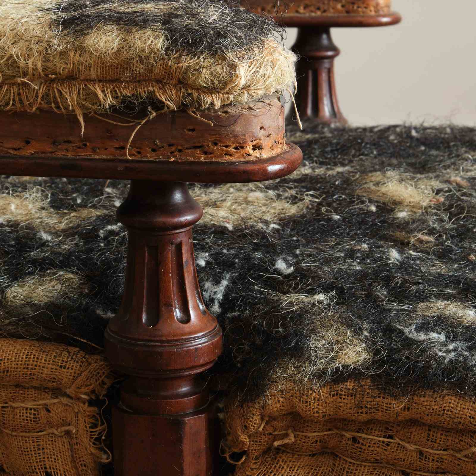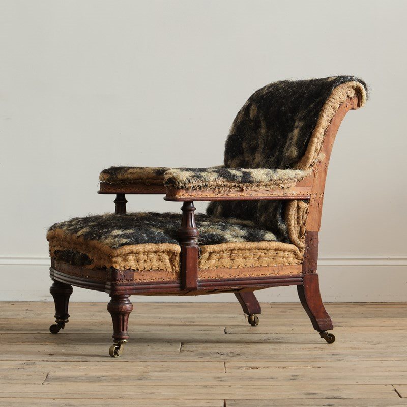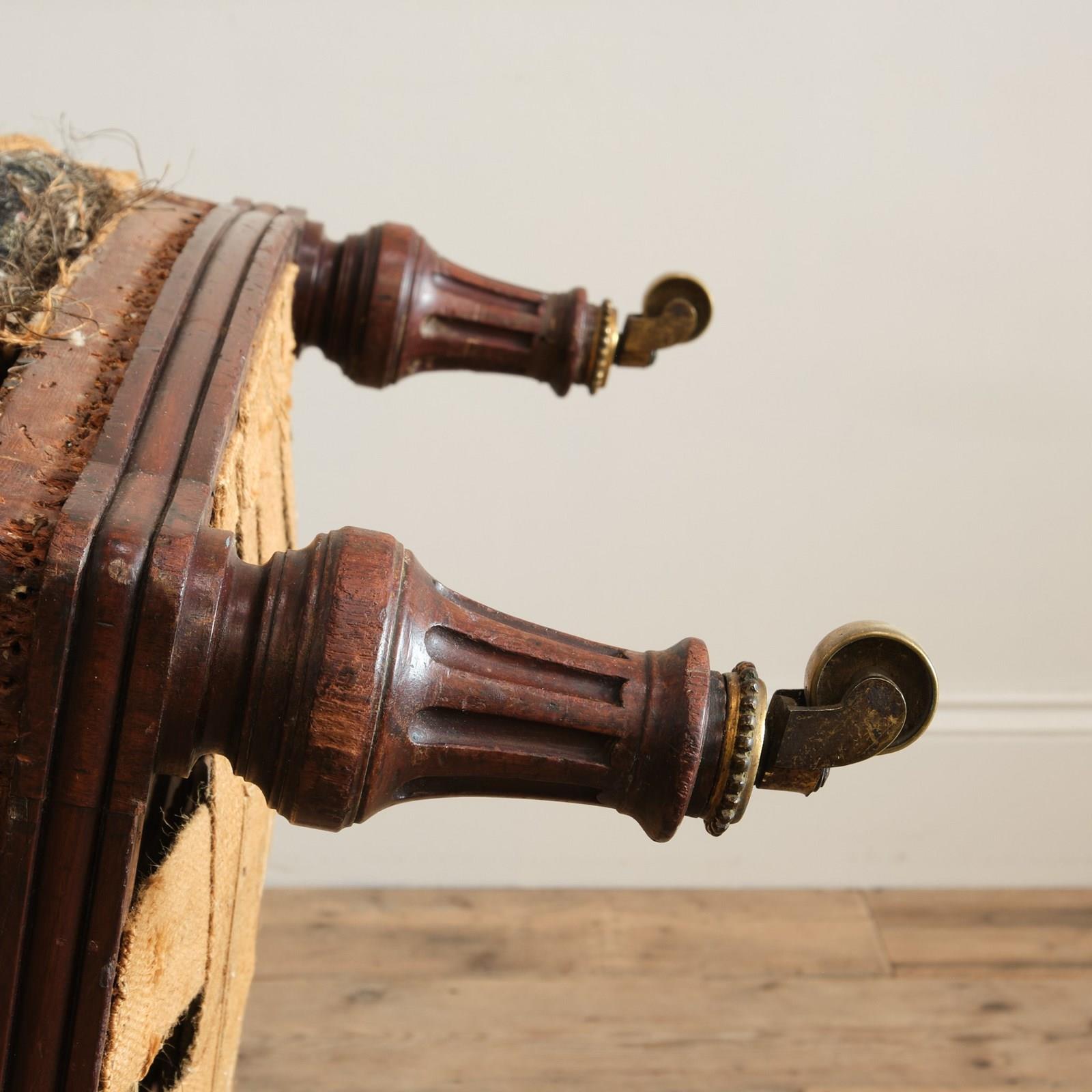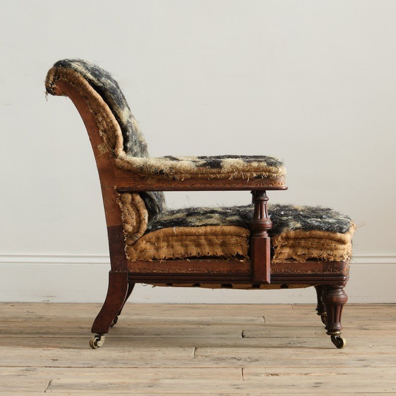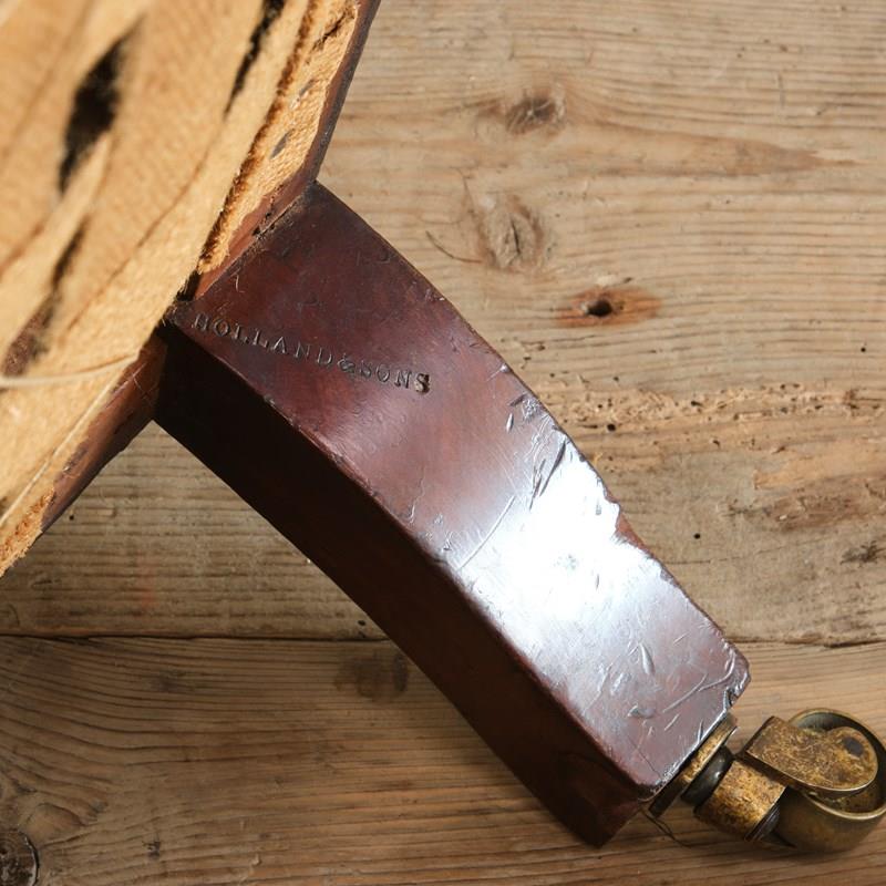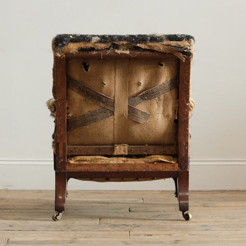 A superb little mid 19th century open armchair by Holland & Sons - London. C 1860. Raised on walnut turned and fluted legs and arm supports with splayed rear legs. One back leg bearing the makers stamp.