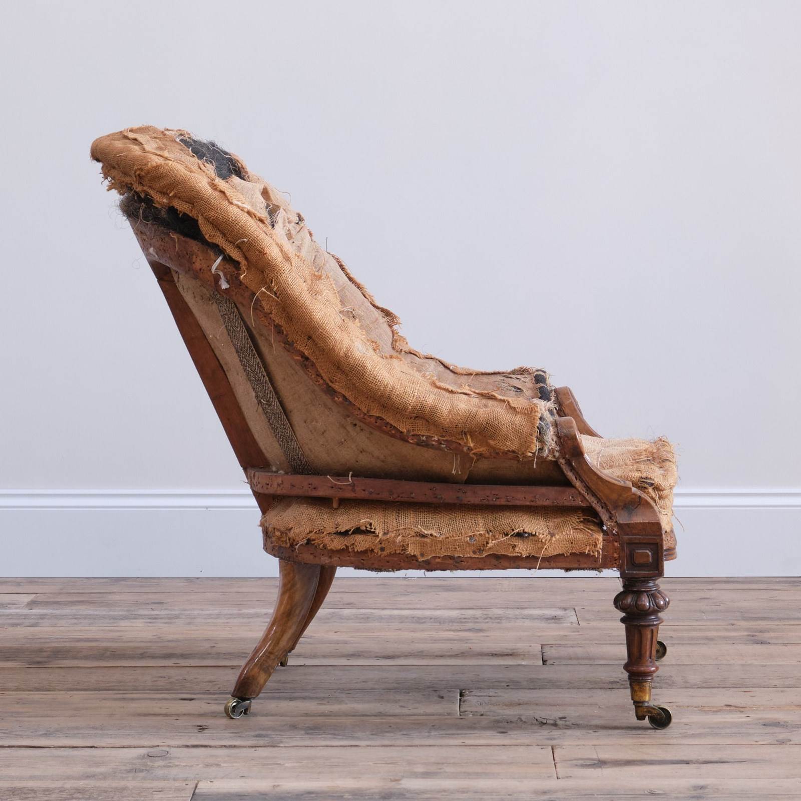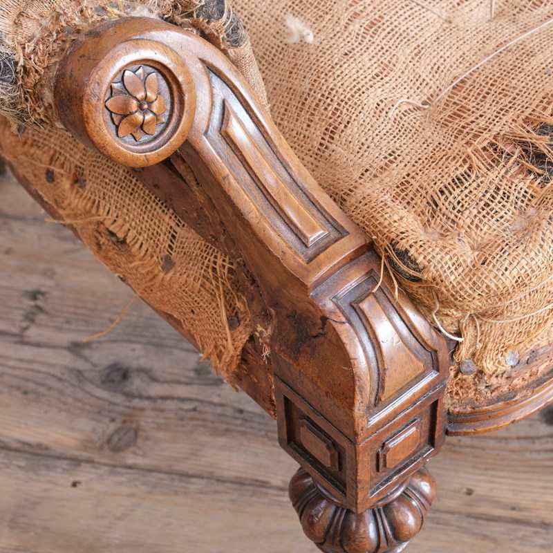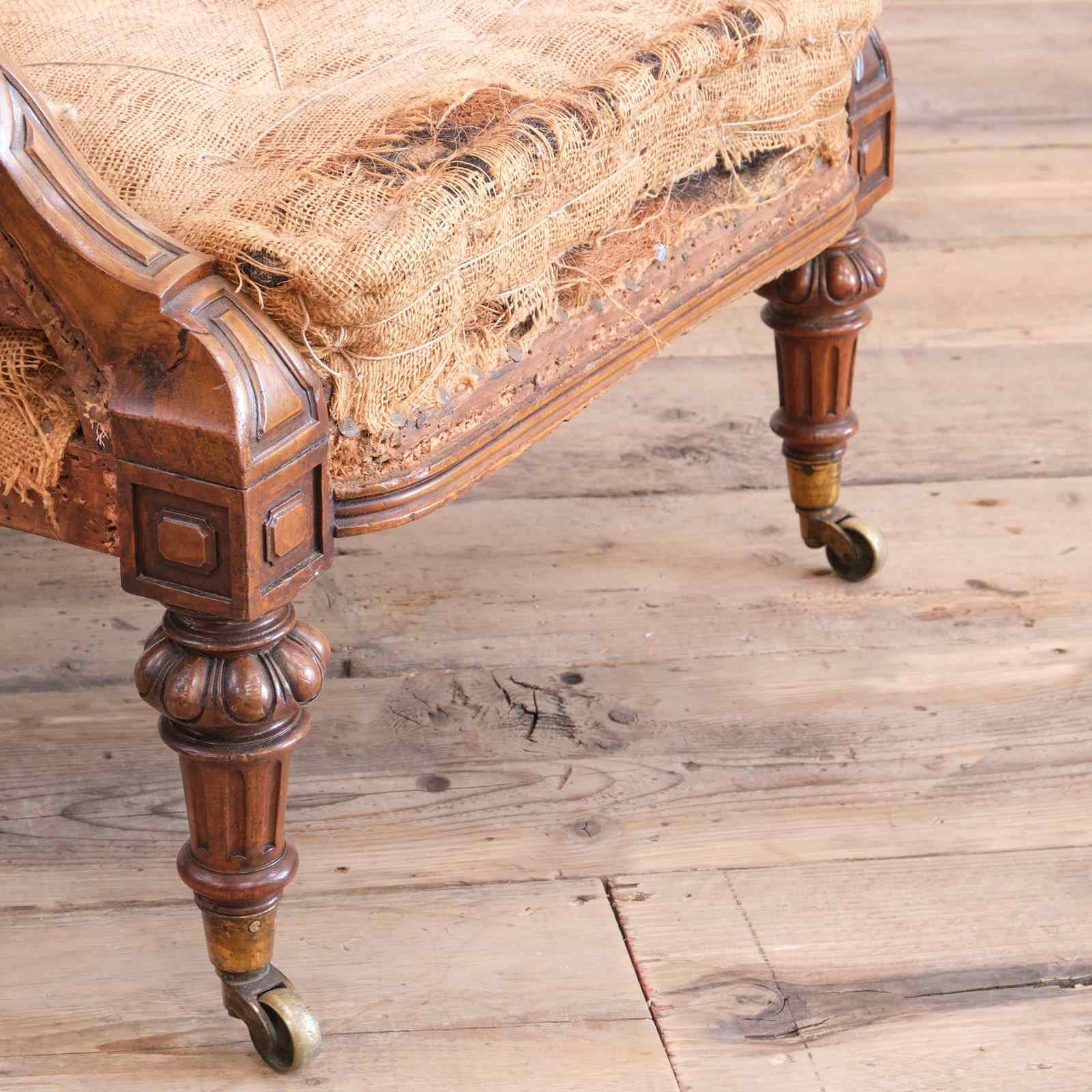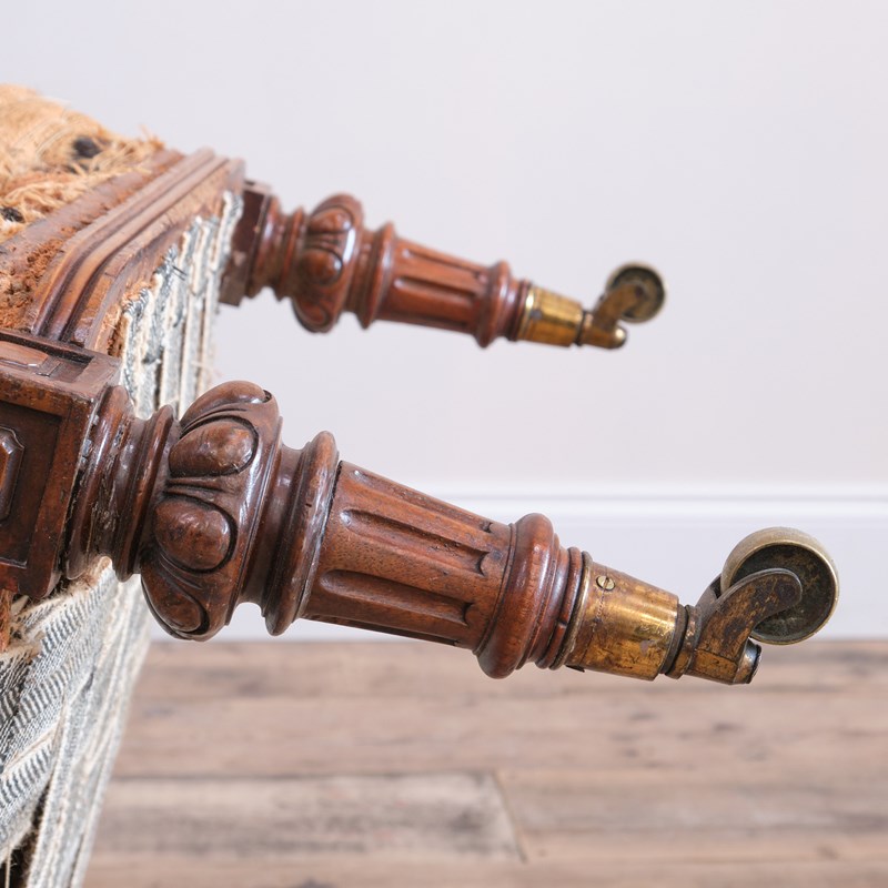 A superb quality mid 19th century armchair raised on turned and carved walnut legs and the original Cope & Collinson gilt brass cup casters.