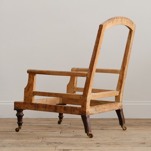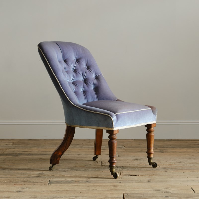 An early 19th century Regency slipper chair raised on turned front legs with the original brass casters and thick splayed veneered legs to the rear (casters have been changed). Upholstered in a pale blue drayon velvet with contrasting piping. Structurally in good solid order and very much ready for use. Small loss to the veneer on the back leg as shown.