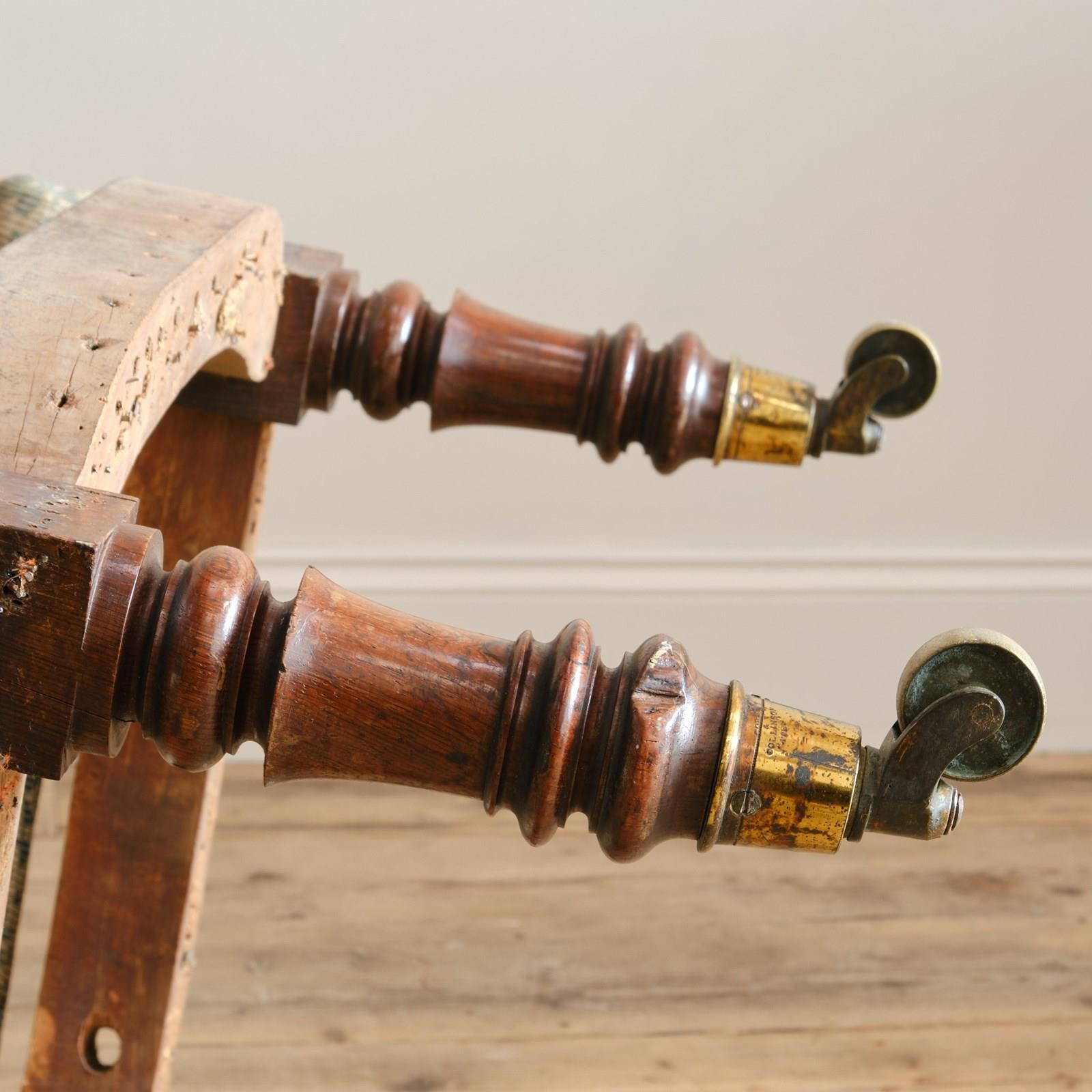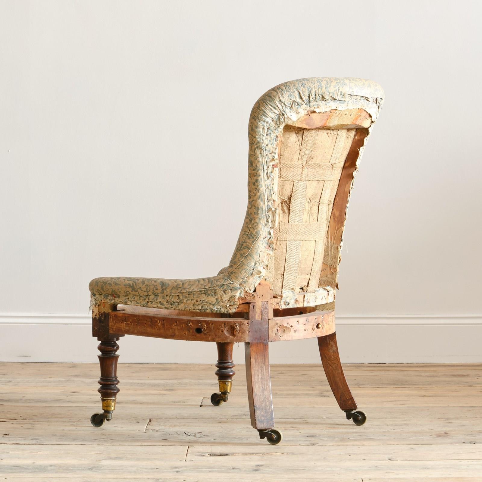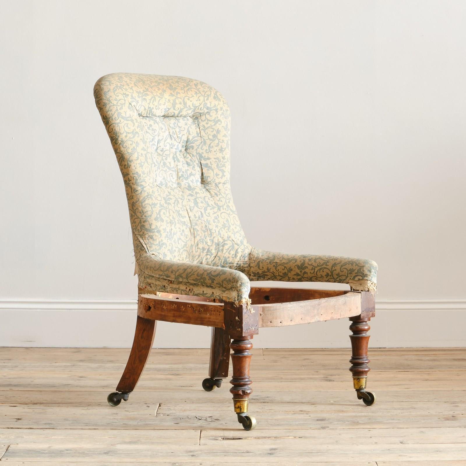 An early 19th century Regency slipper chair of generous proportions. Raised on nicely turned tall Rosewood front legs with splayed rear legs all capped with brass casters. English c1830