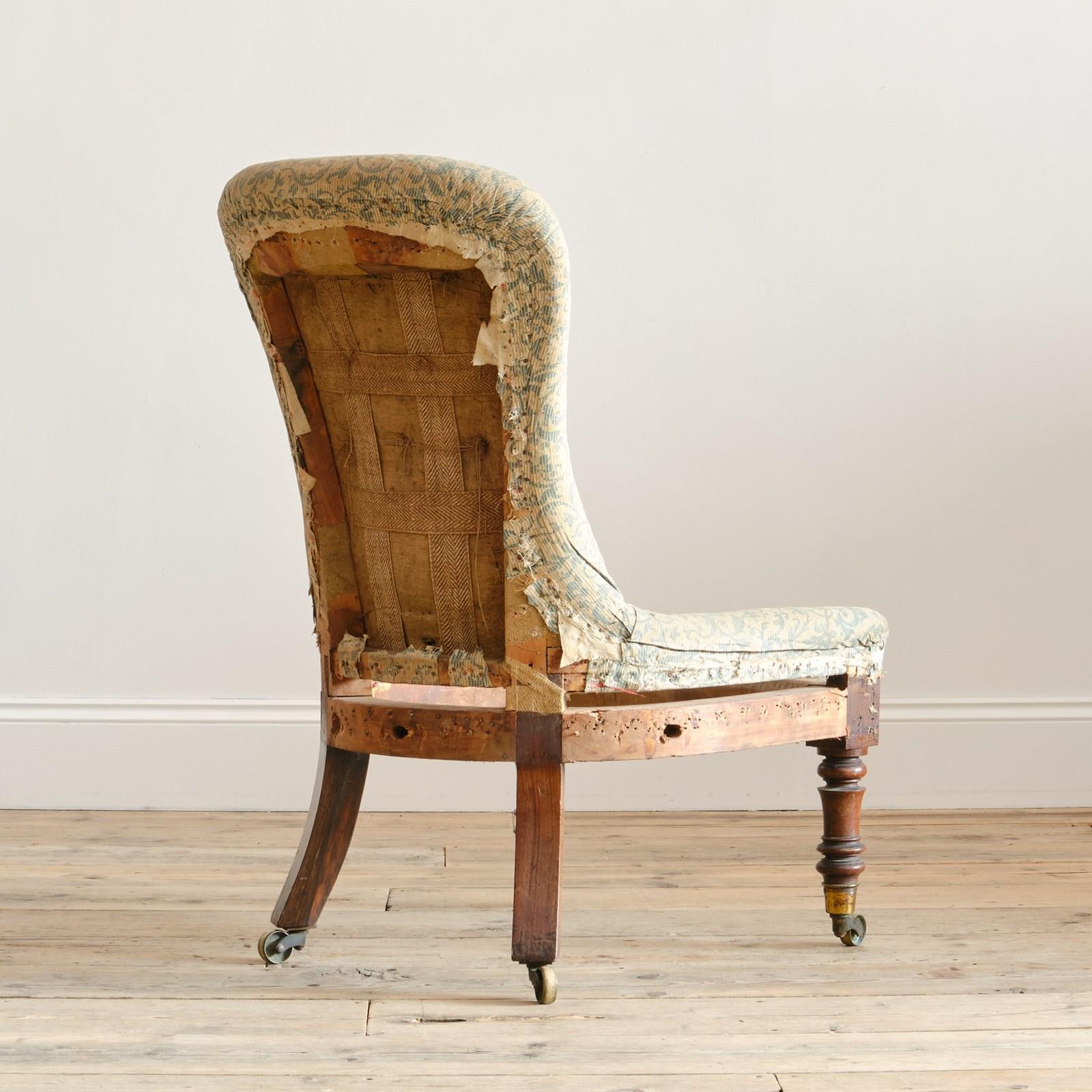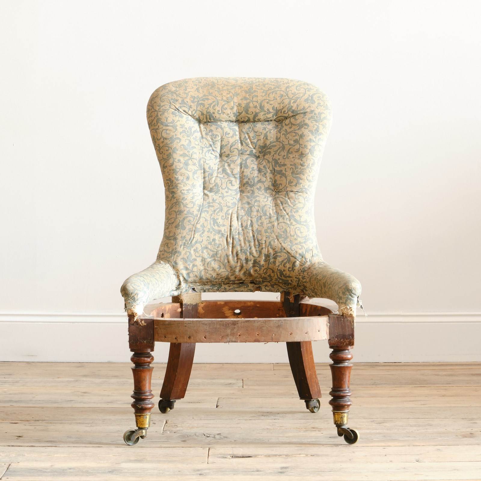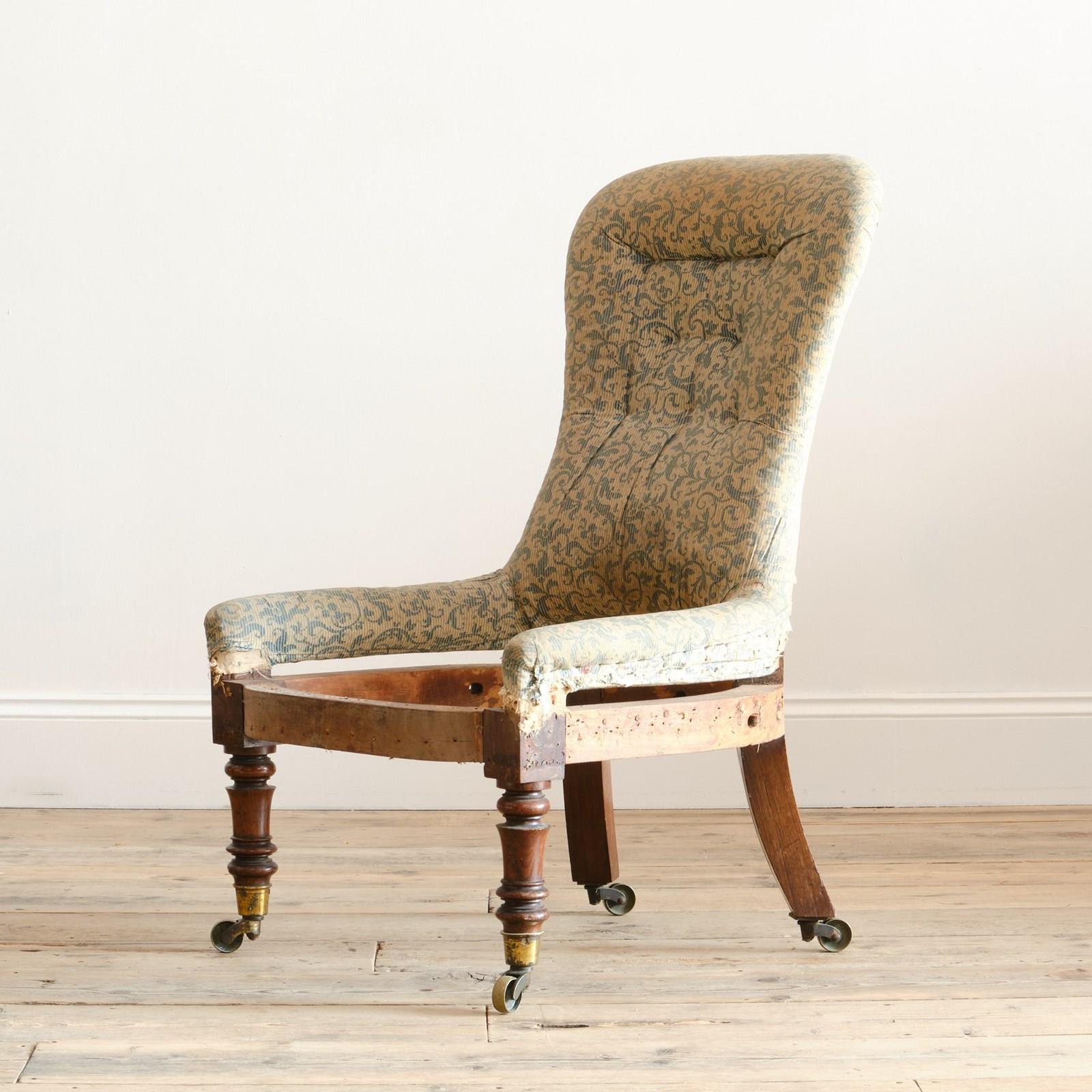 An early 19th century Regency slipper chair of generous proportions. Raised on nicely turned tall Rosewood front legs with splayed rear legs all capped with brass casters. English c1830