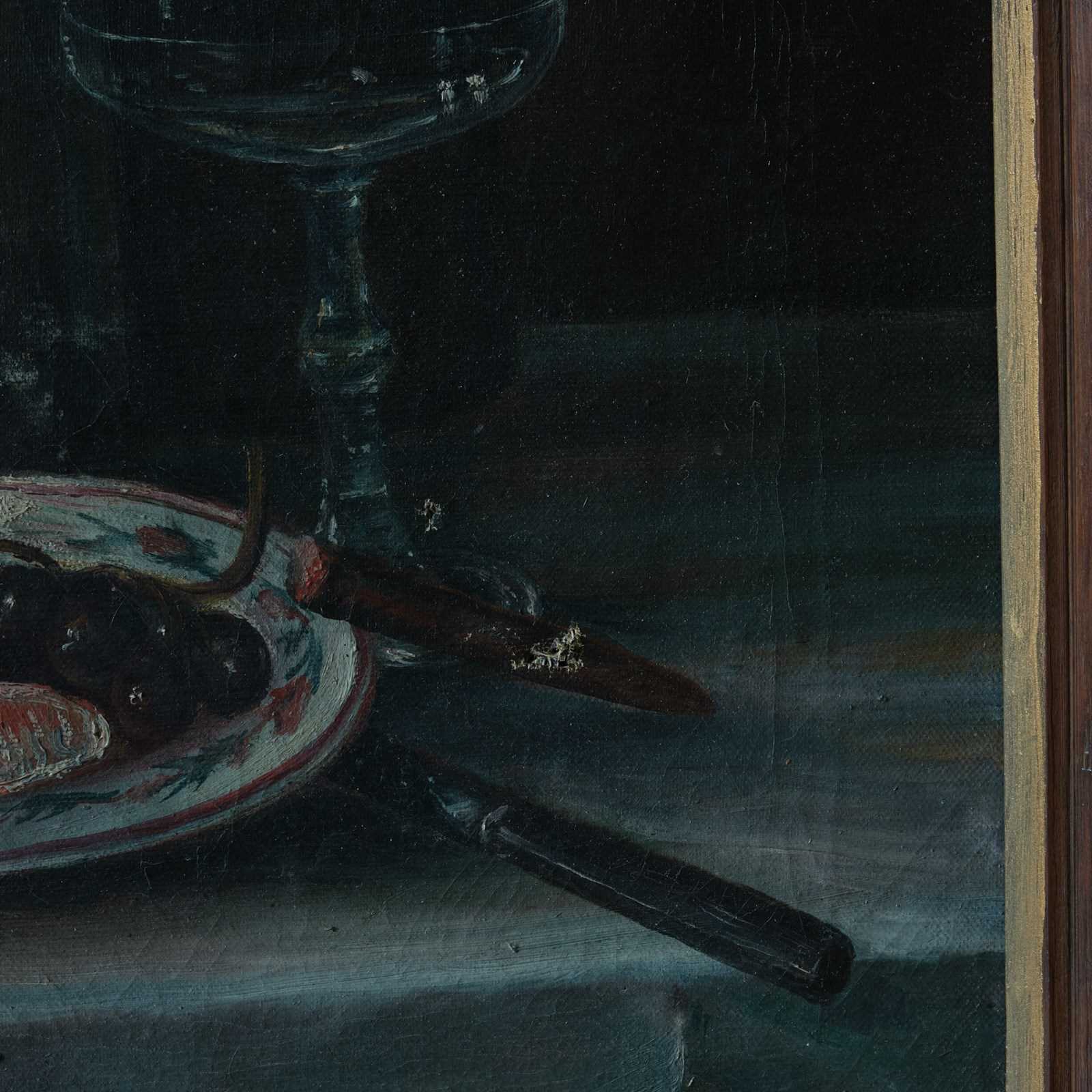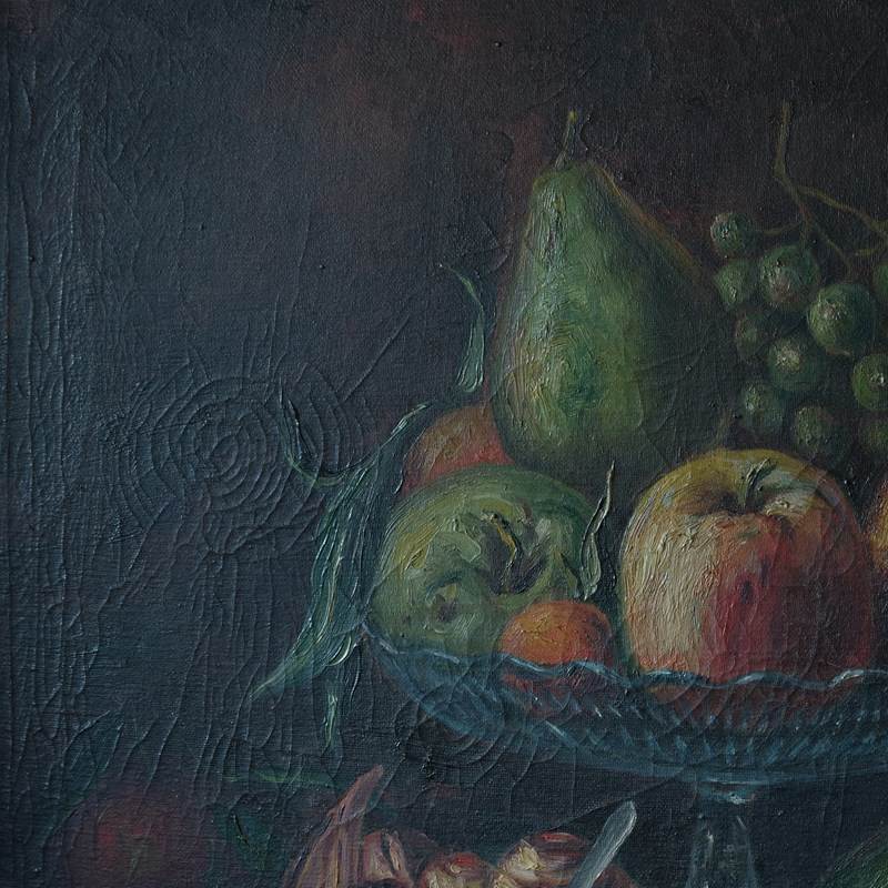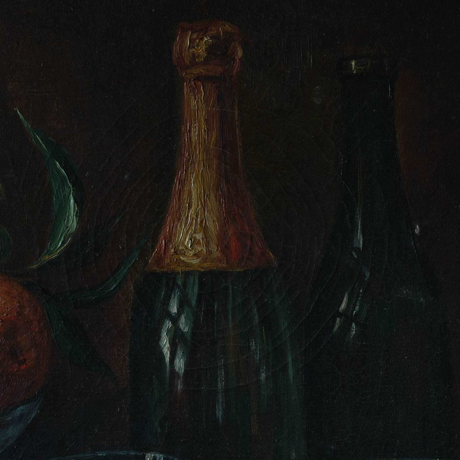 A mid 20th century signed still life oil on canvas in its original pine frame. Painted by by an experienced hand depicting a table of wines and fruit. c1947