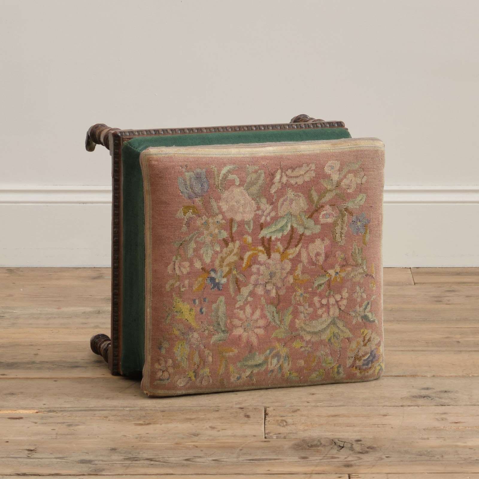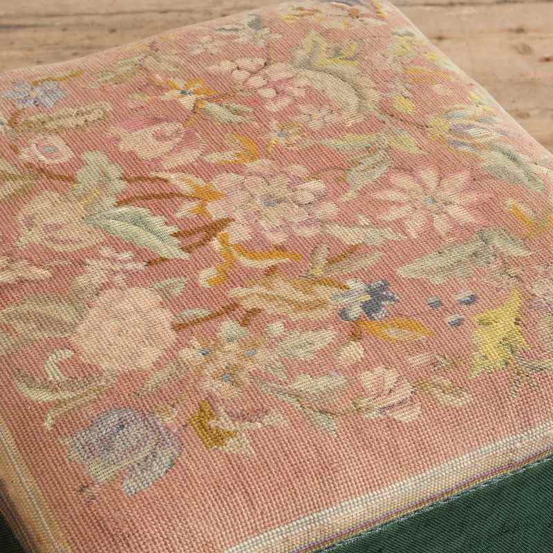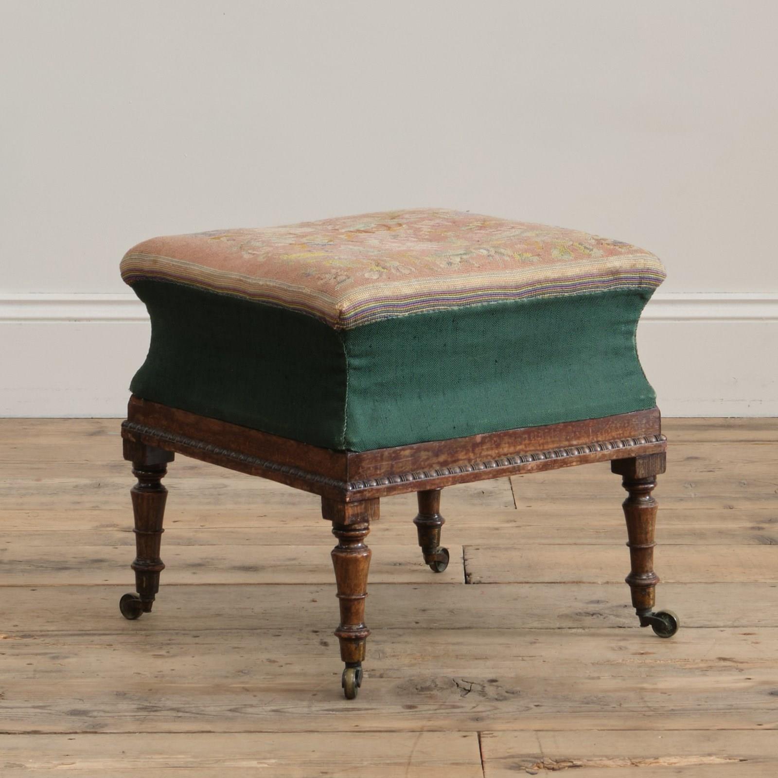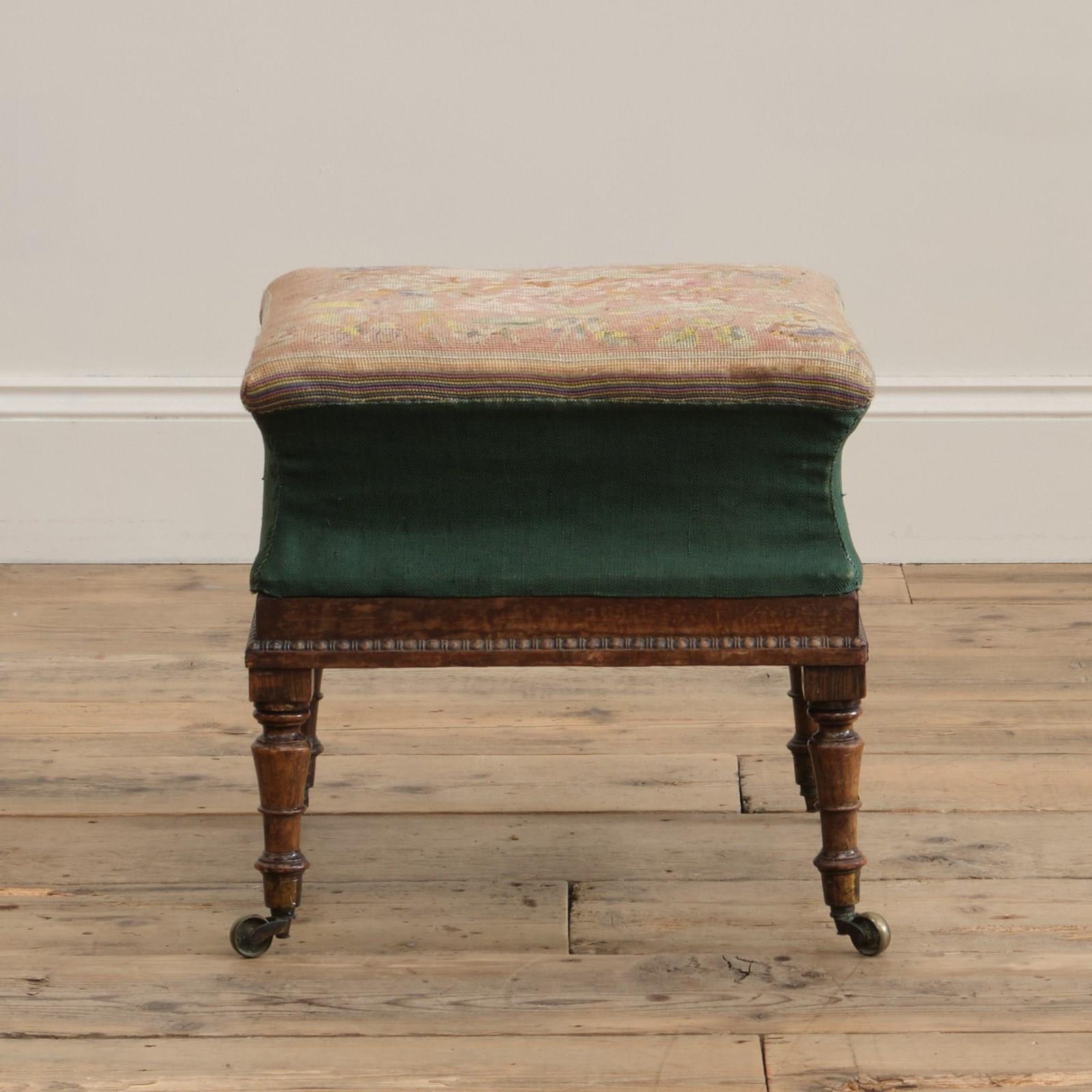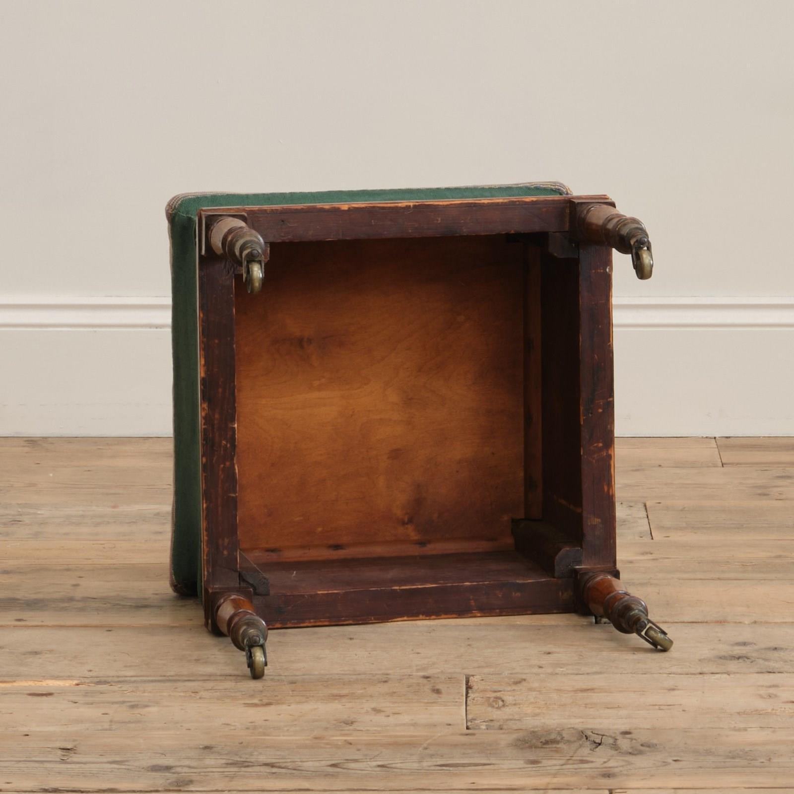 A cute little country house footstool raised on simulated Rosewood legs with the original brass casters. The pine sarcophagus shaped upper with egg and dart trim, green linen boarder and a needlework top with a pink ground below a floral design. c1835