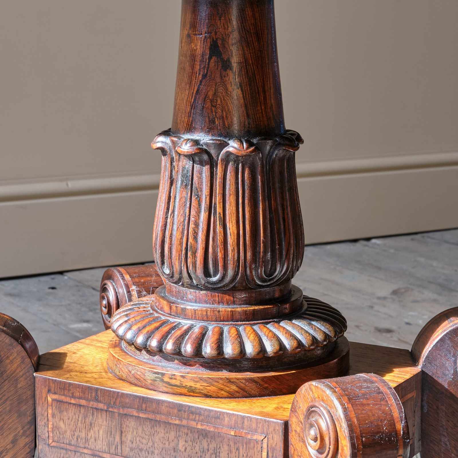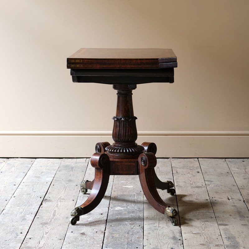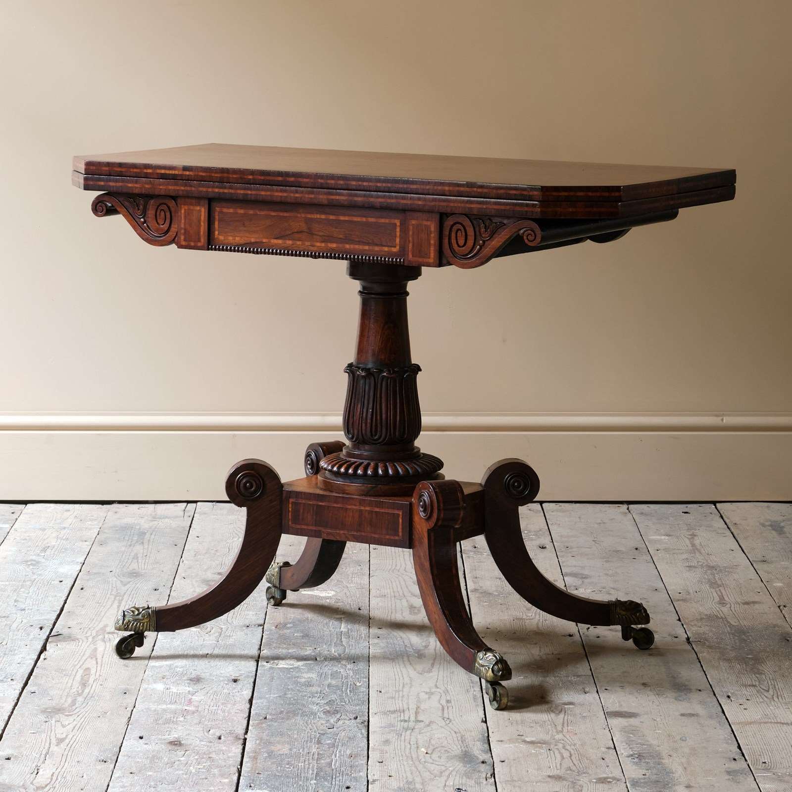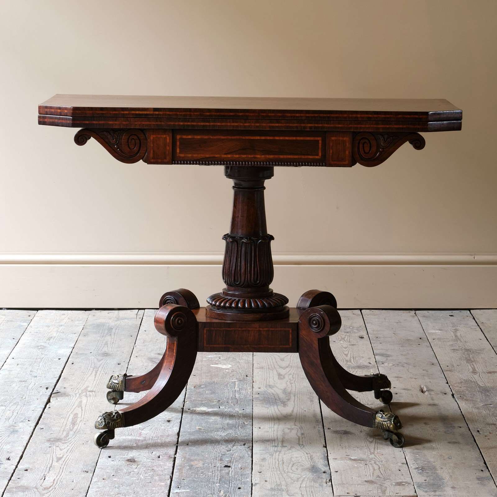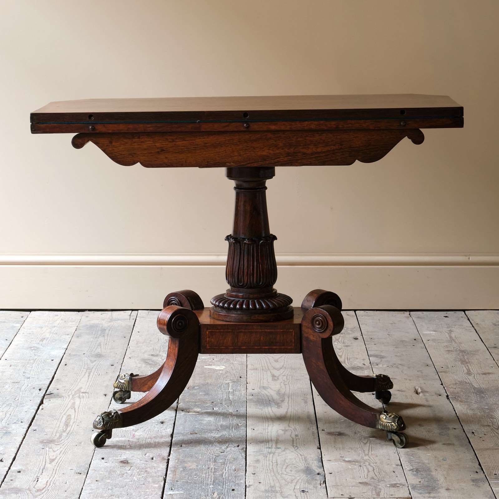 A well drawn William IV Rosewood card table. The top with nicely figured grain above a turned and carved column raised on 4 shaped legs capped with Acanthus leaf brass casters. The whole in good antique country house condition.