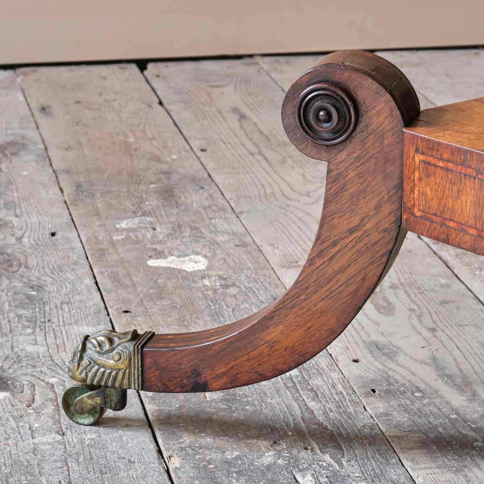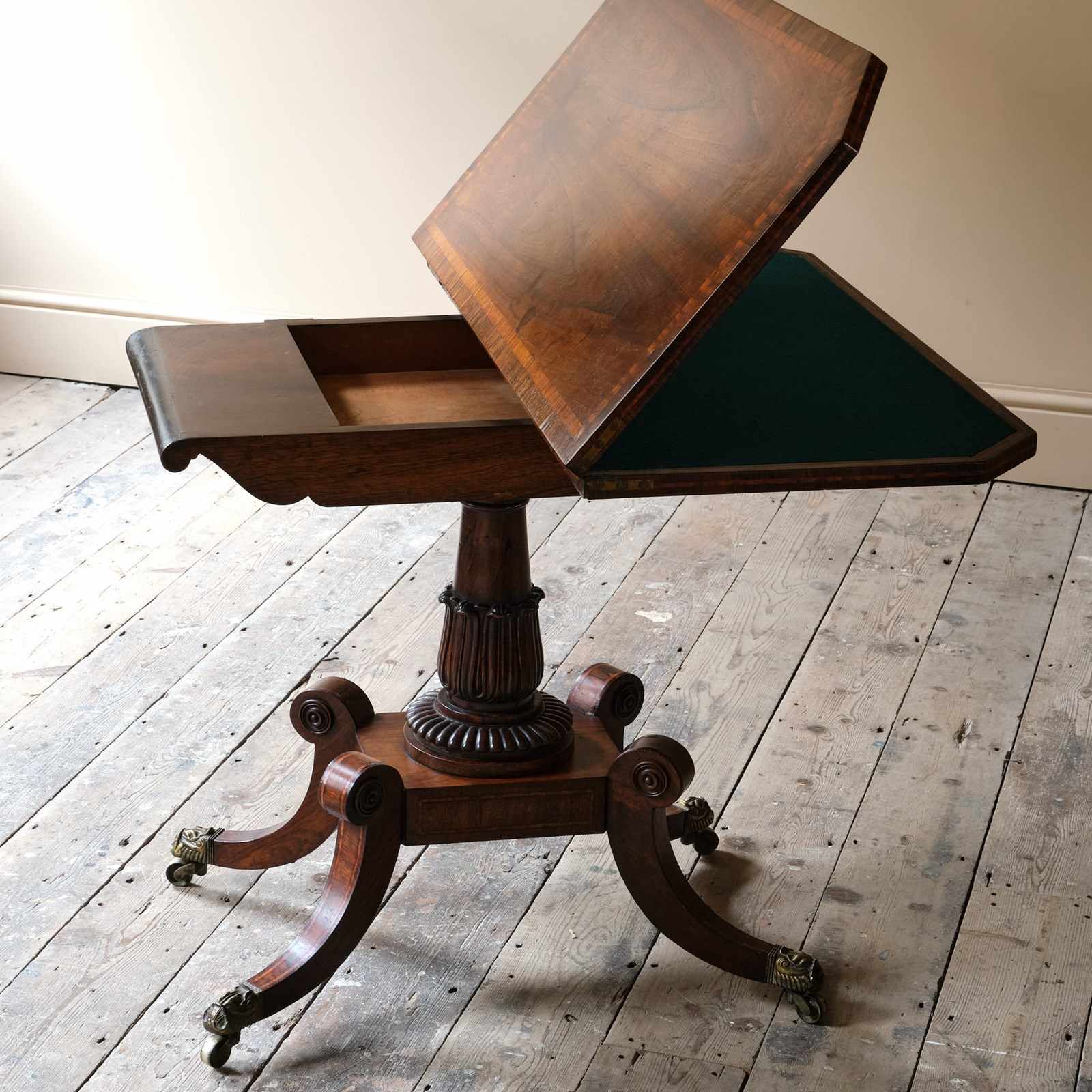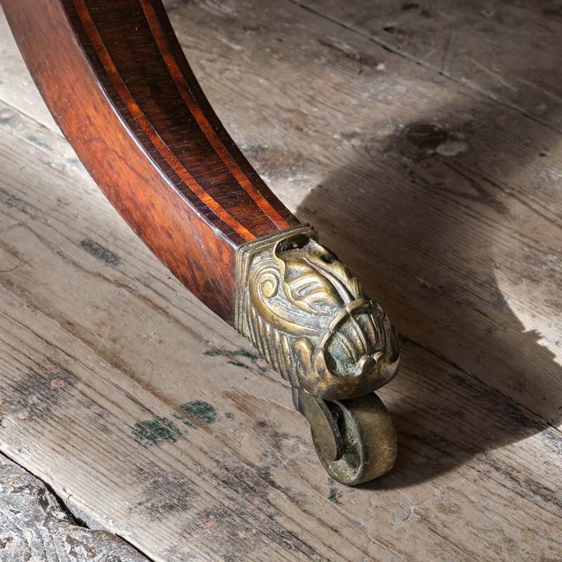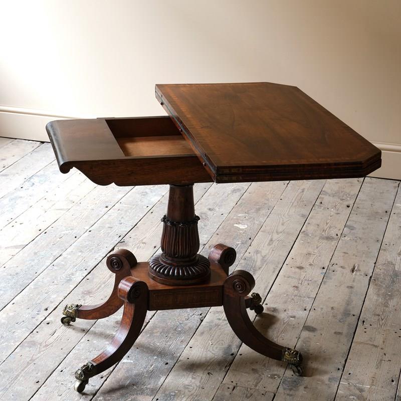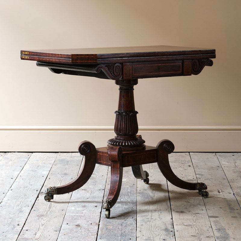 A well drawn William IV Rosewood card table. The top with nicely figured grain above a turned and carved column raised on 4 shaped legs capped with Acanthus leaf brass casters. The whole in good antique country house condition.