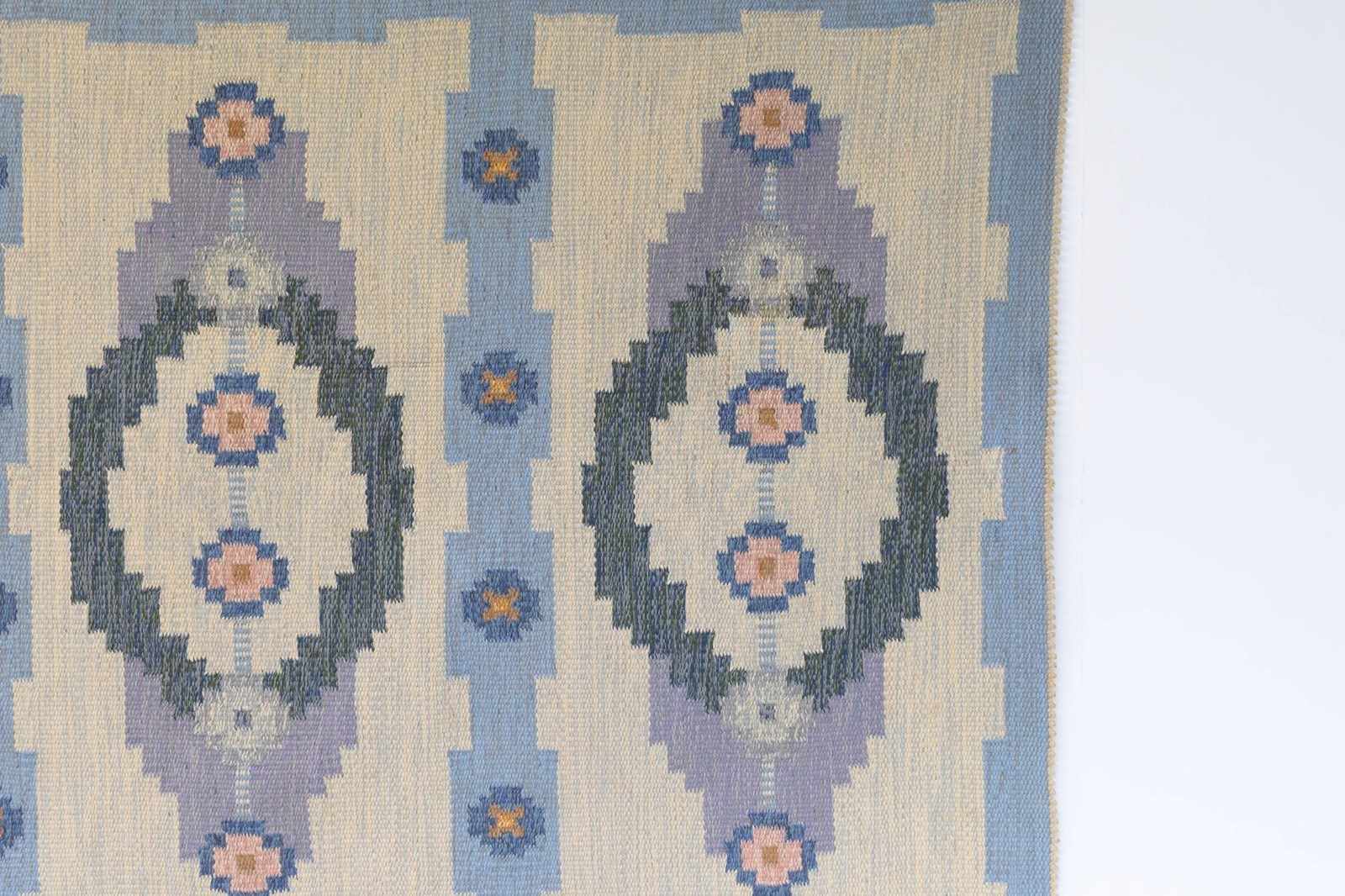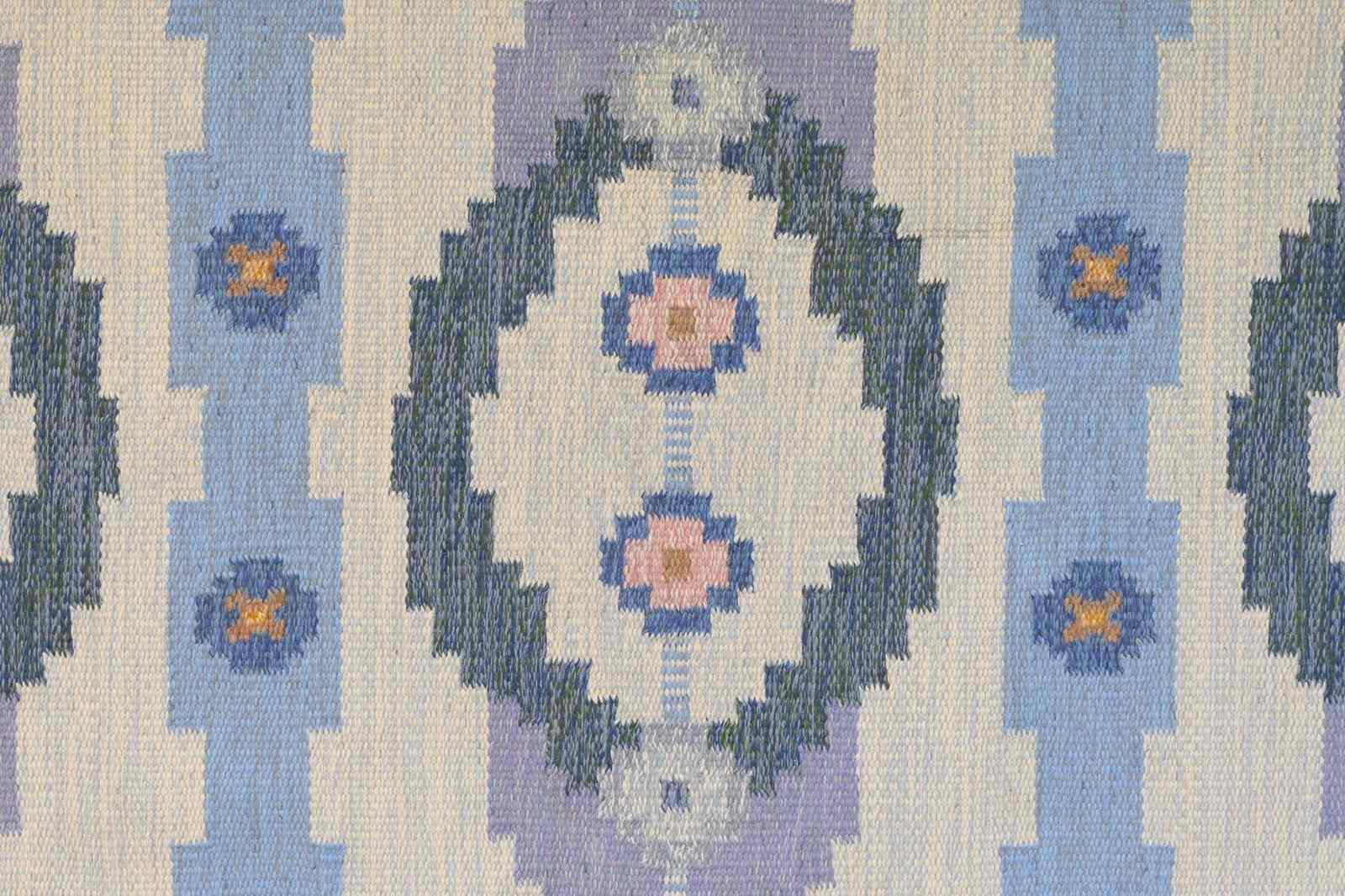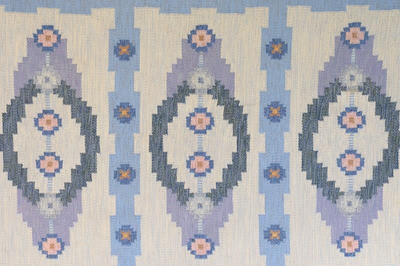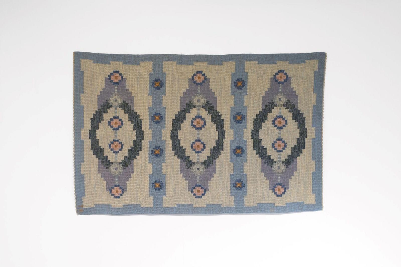Mid-Century Swedish kilim in tones of blues, creams and purples, with a three panel geometric design. Signed TA.