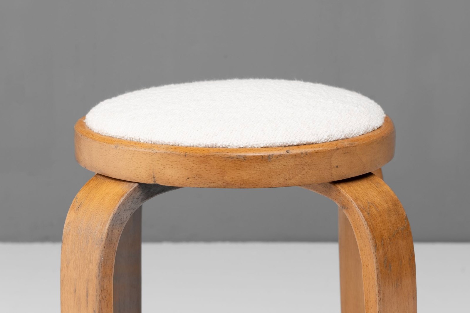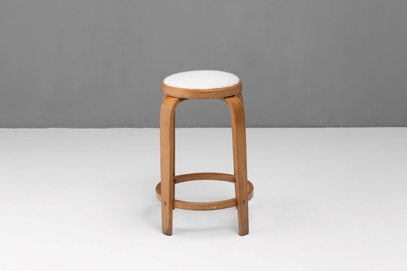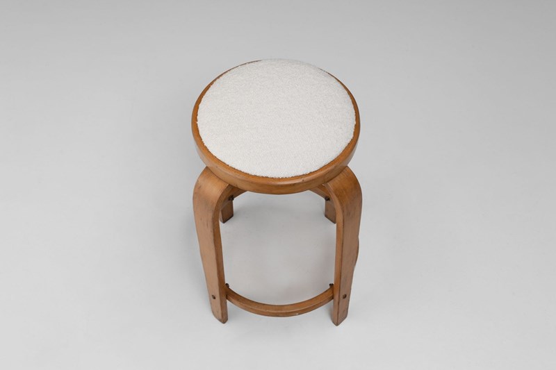 Bent-Ply single stool in the manner of Alvar Alto. Covered seat pad in boucle. U.K circa 1960.