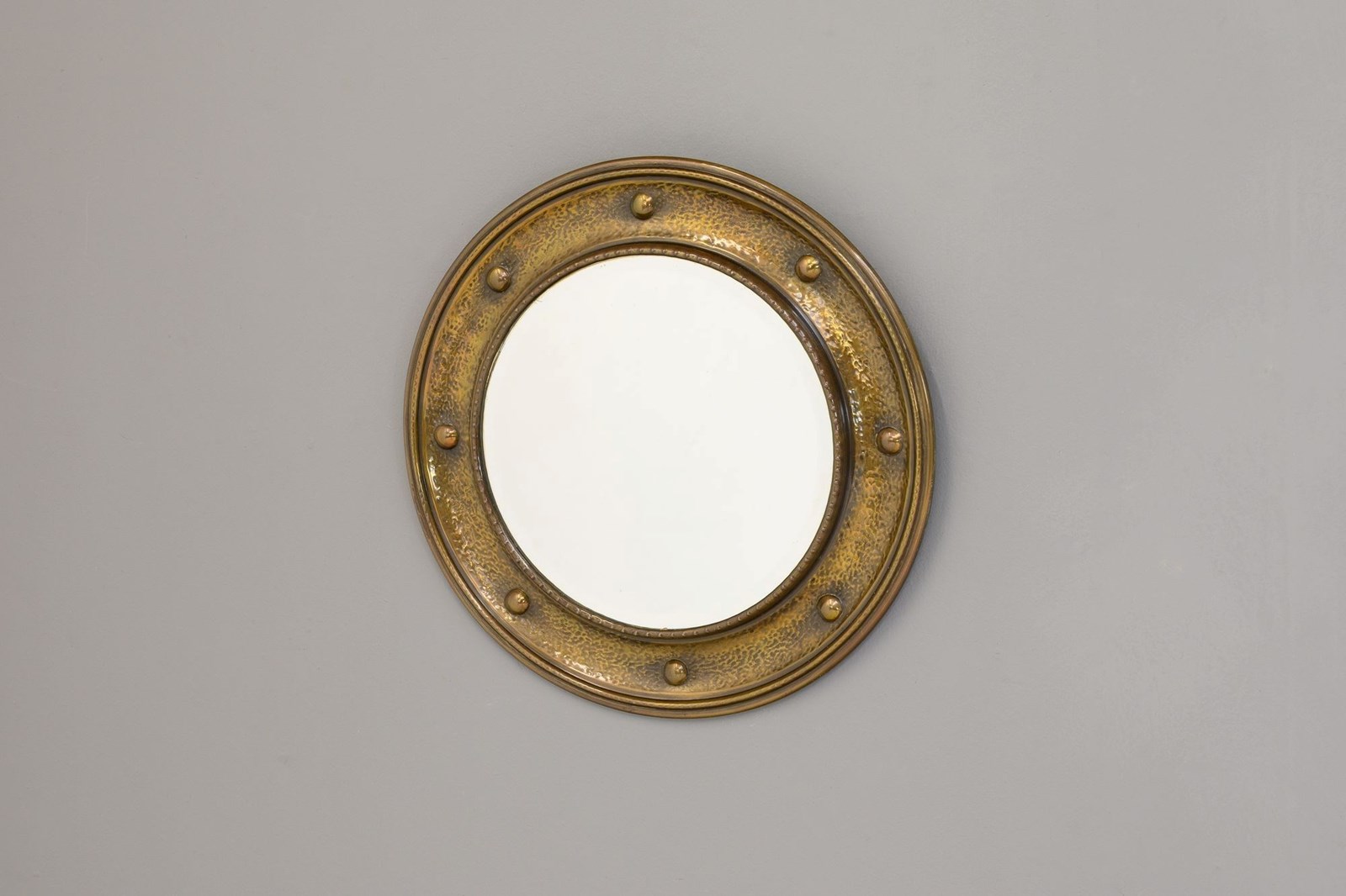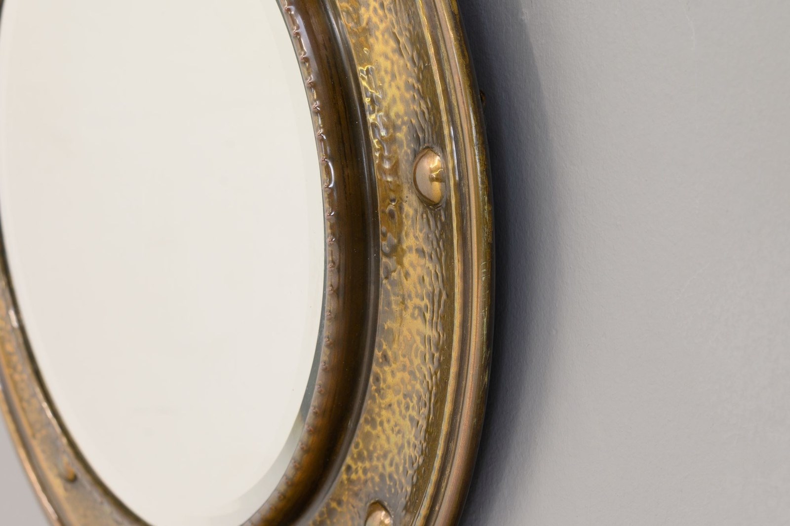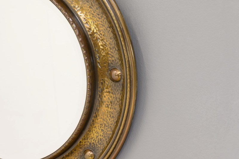 Circular bevelled mirror in spun brass frame with aged lacquer finish. Circa 1930