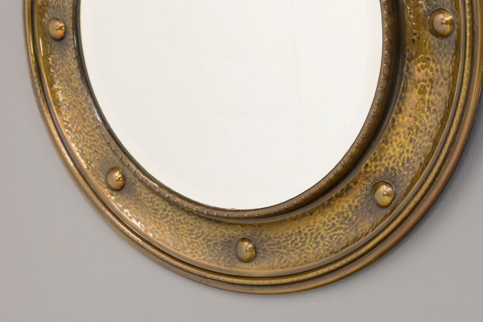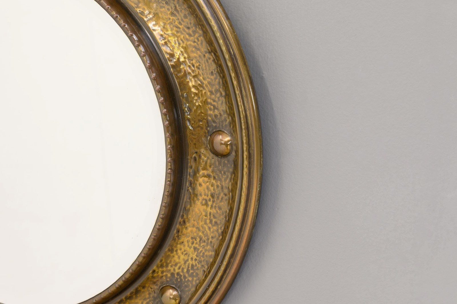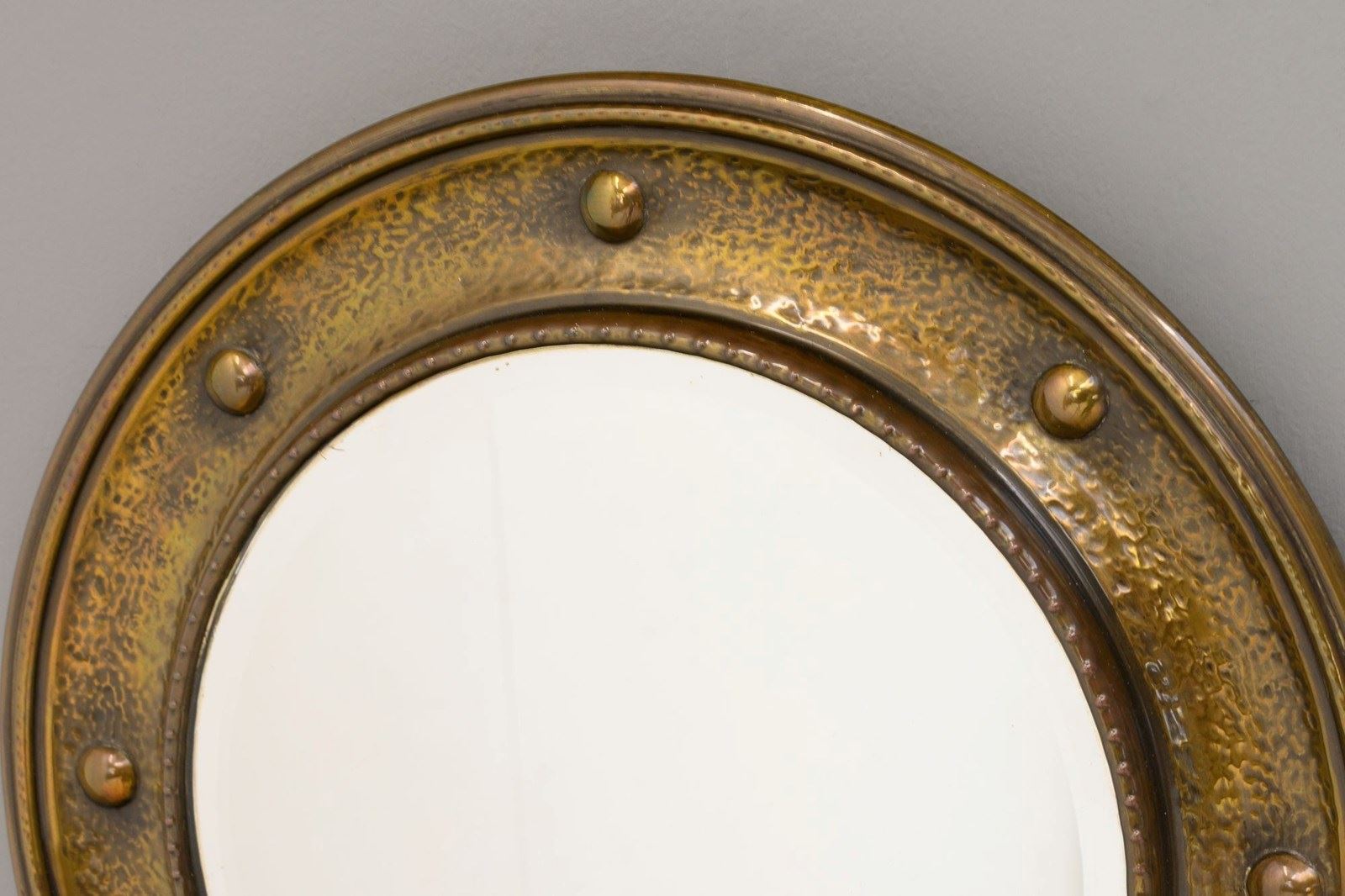 Circular bevelled mirror in spun brass frame with aged lacquer finish. Circa 1930
