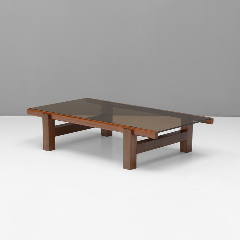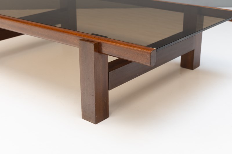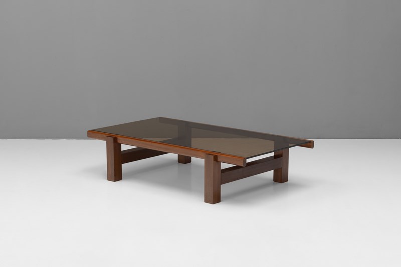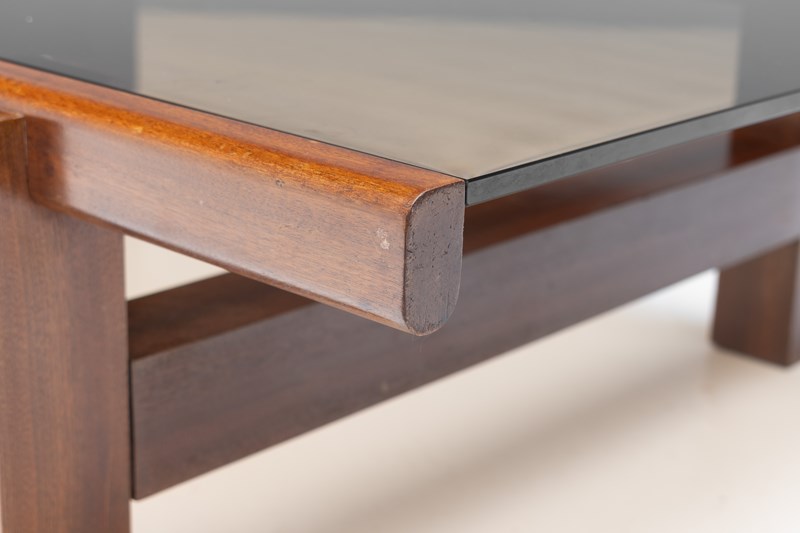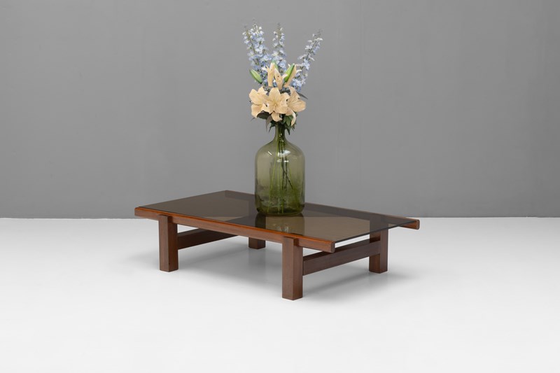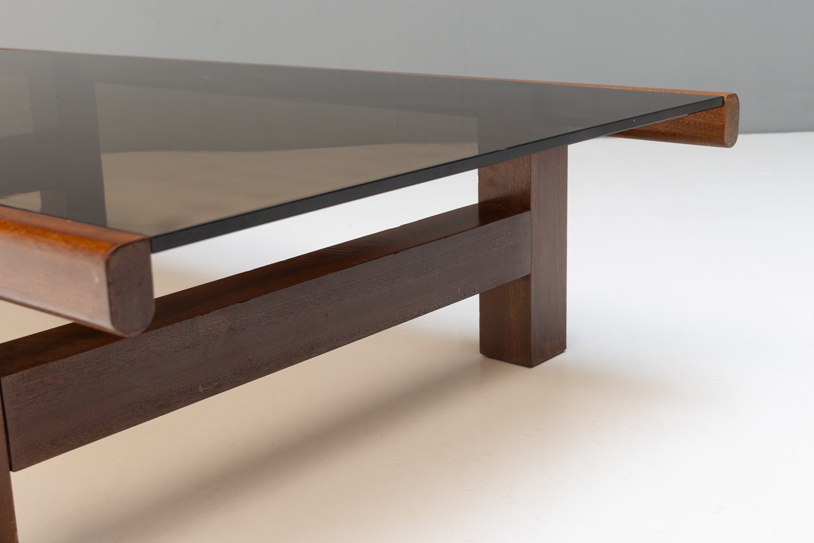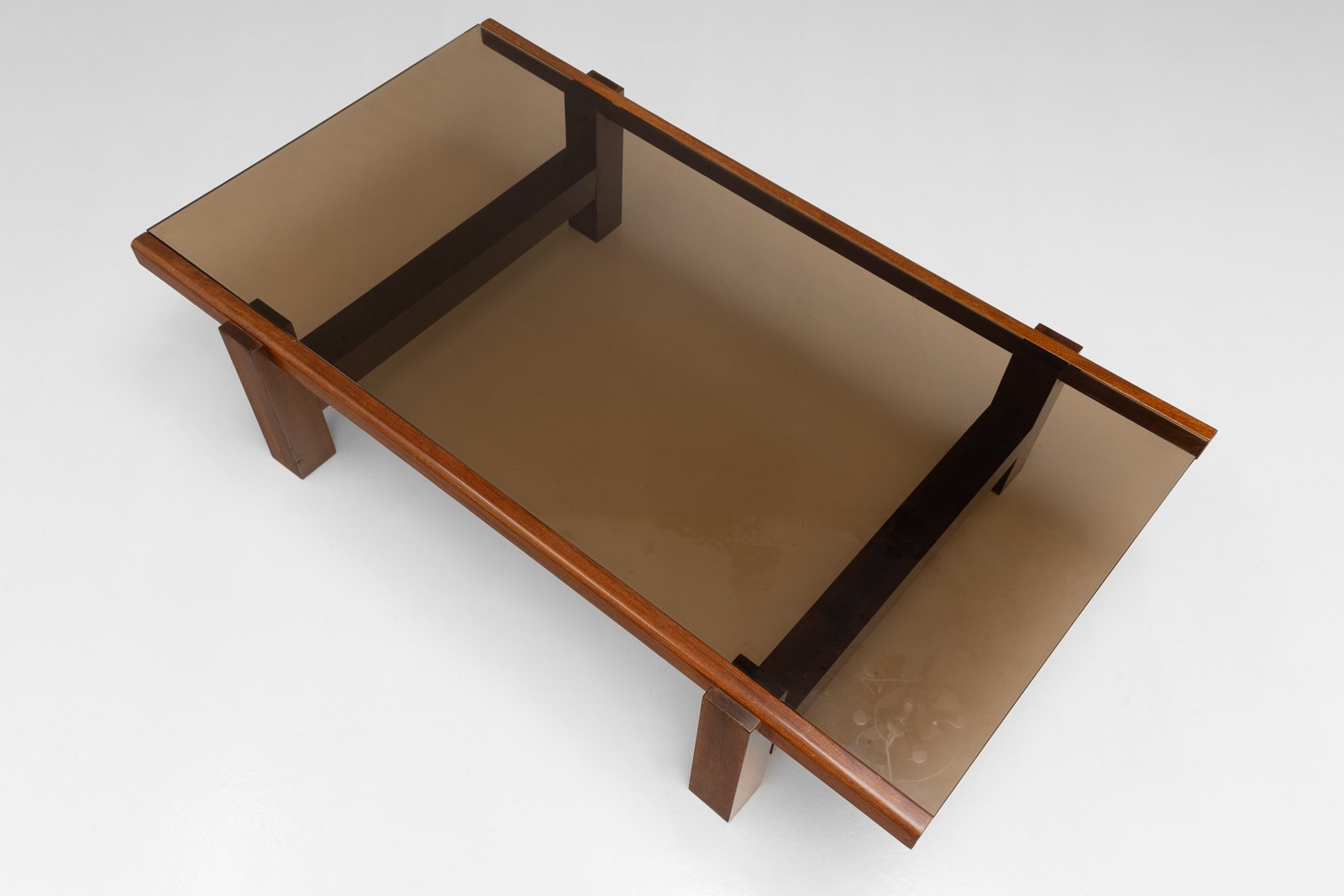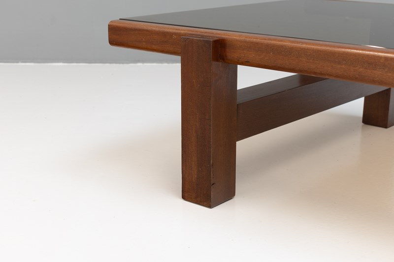 Brutalist mid-century glass top coffee table on solid teak base. Re-finished and new toughened smoked glass. France circa 1970.