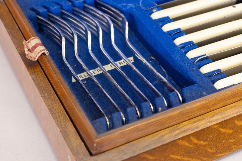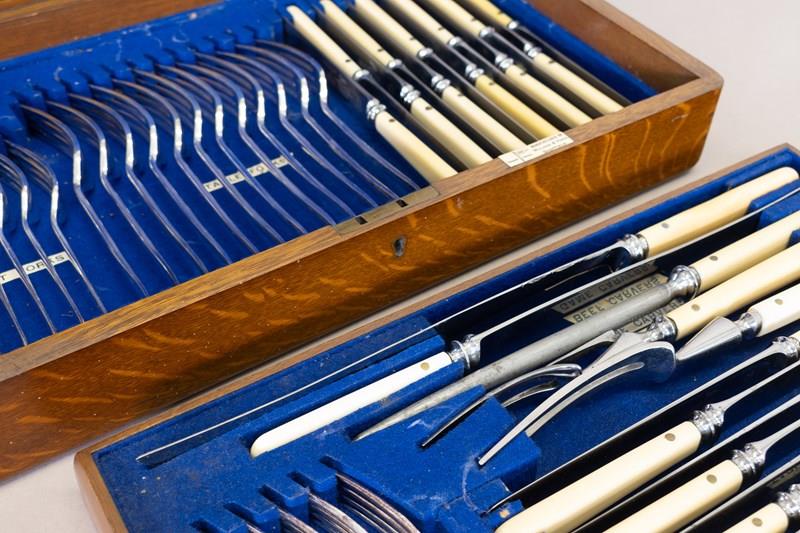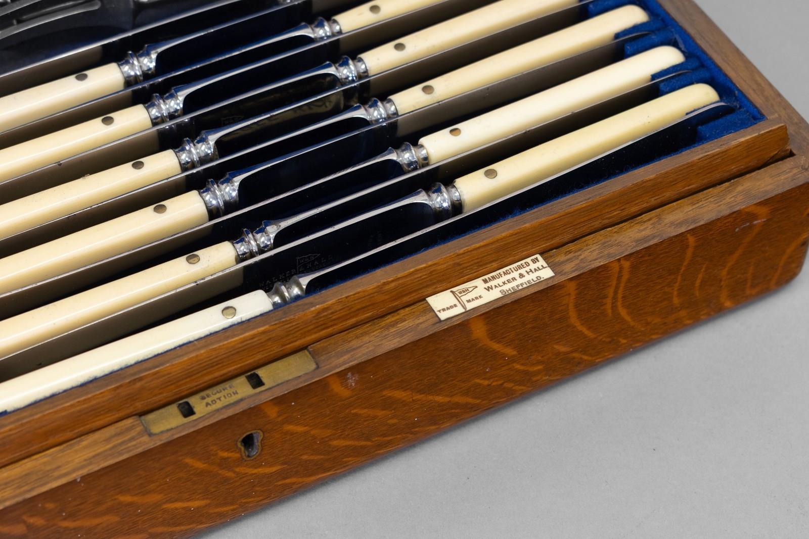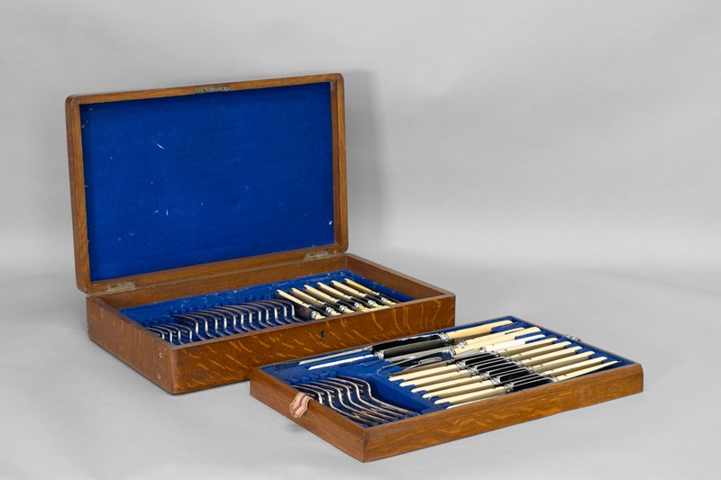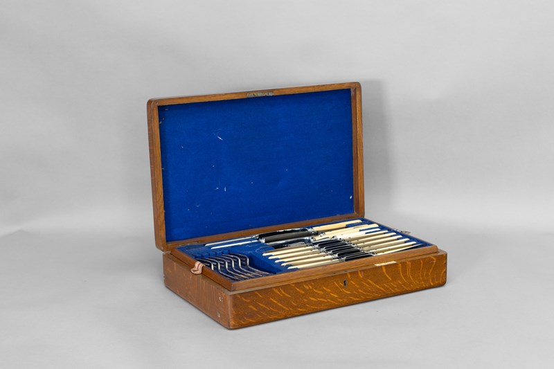 Oak cased 12 person cutlery canteen by Walker and Hall of Sheffield. Circa 1920