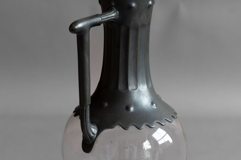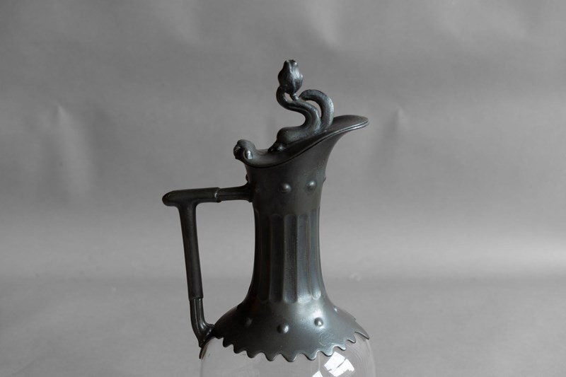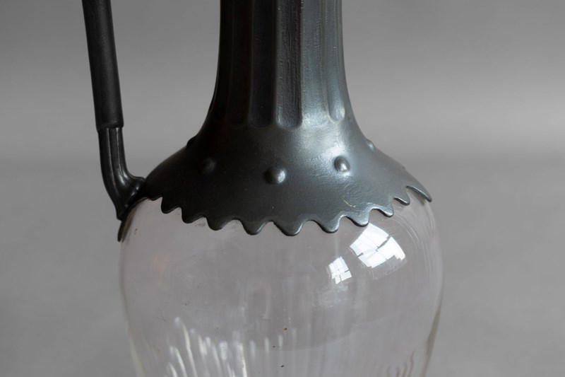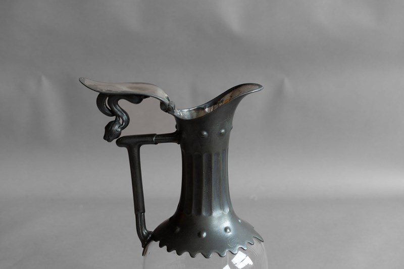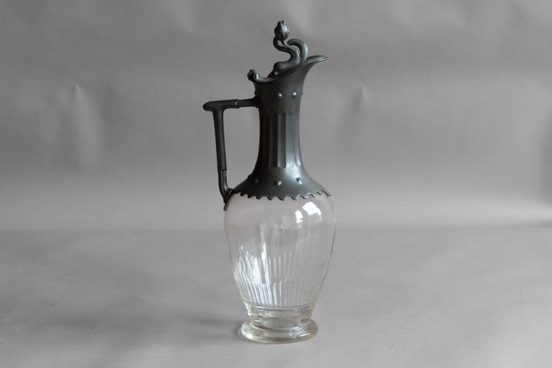 Glass claret jug with decorative pewter spout and lid. Circa 1880.