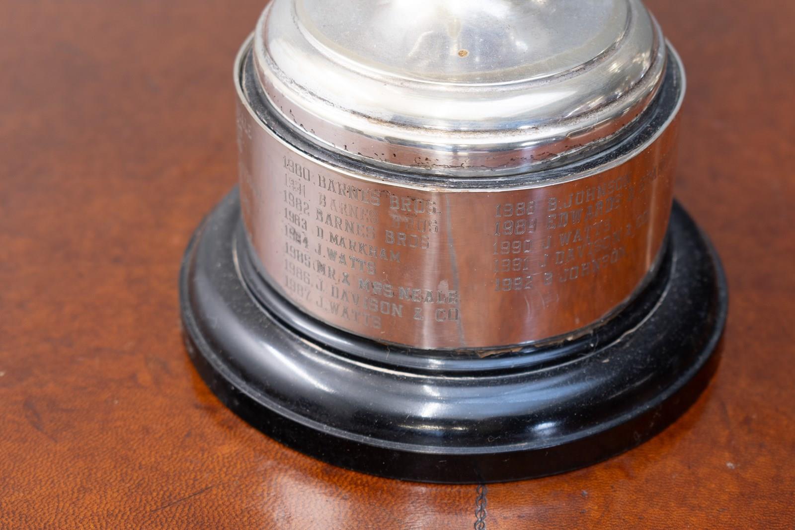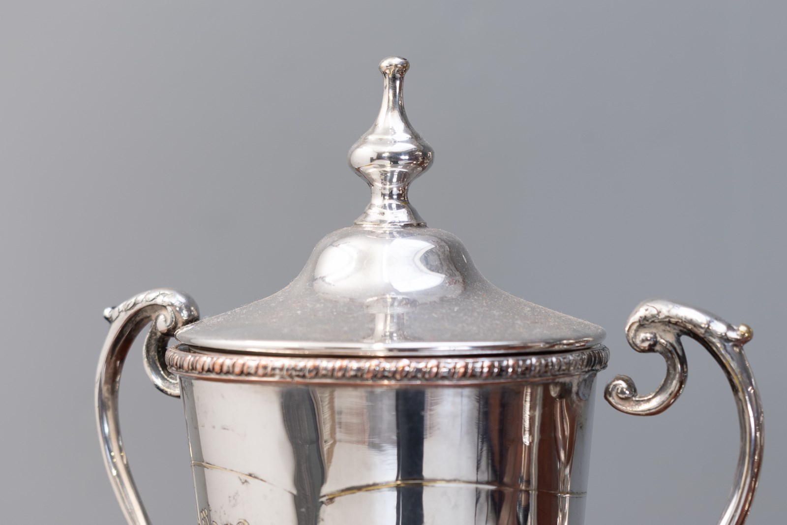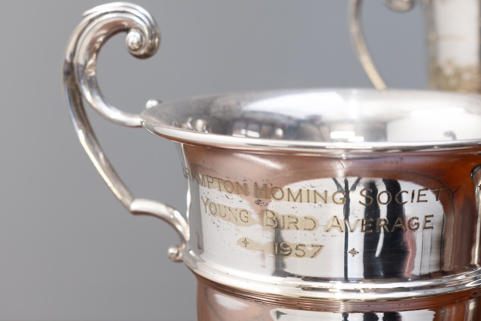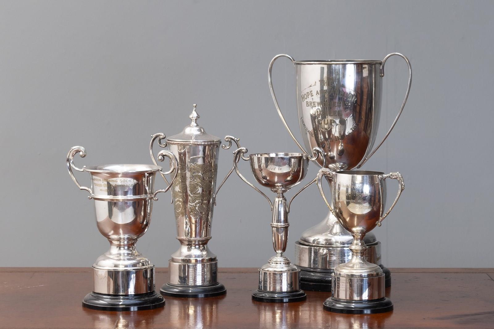 Collection of five 20th century silver plated trophies, re-polished with pine bases. Measurements to the largest. U.K circa 1950.