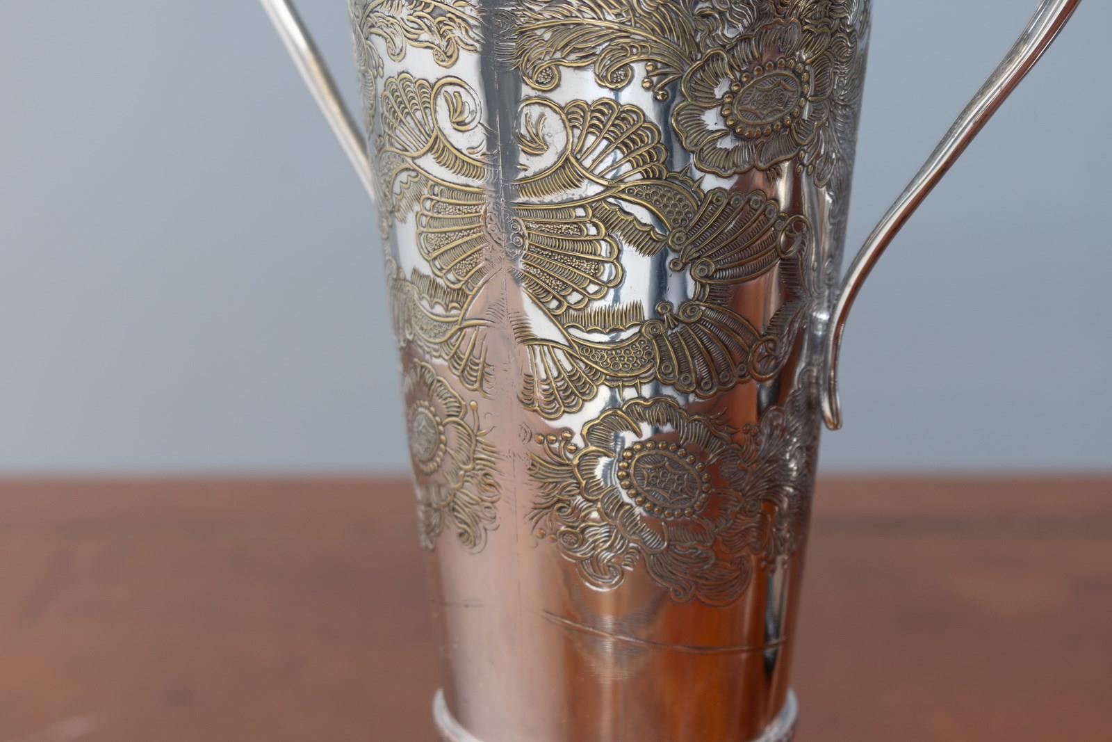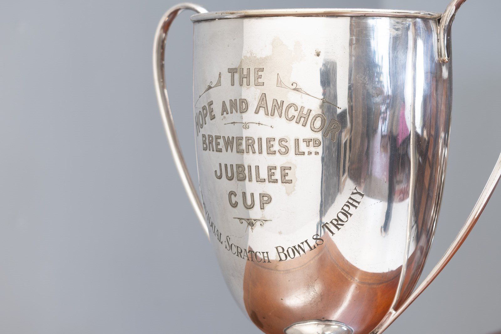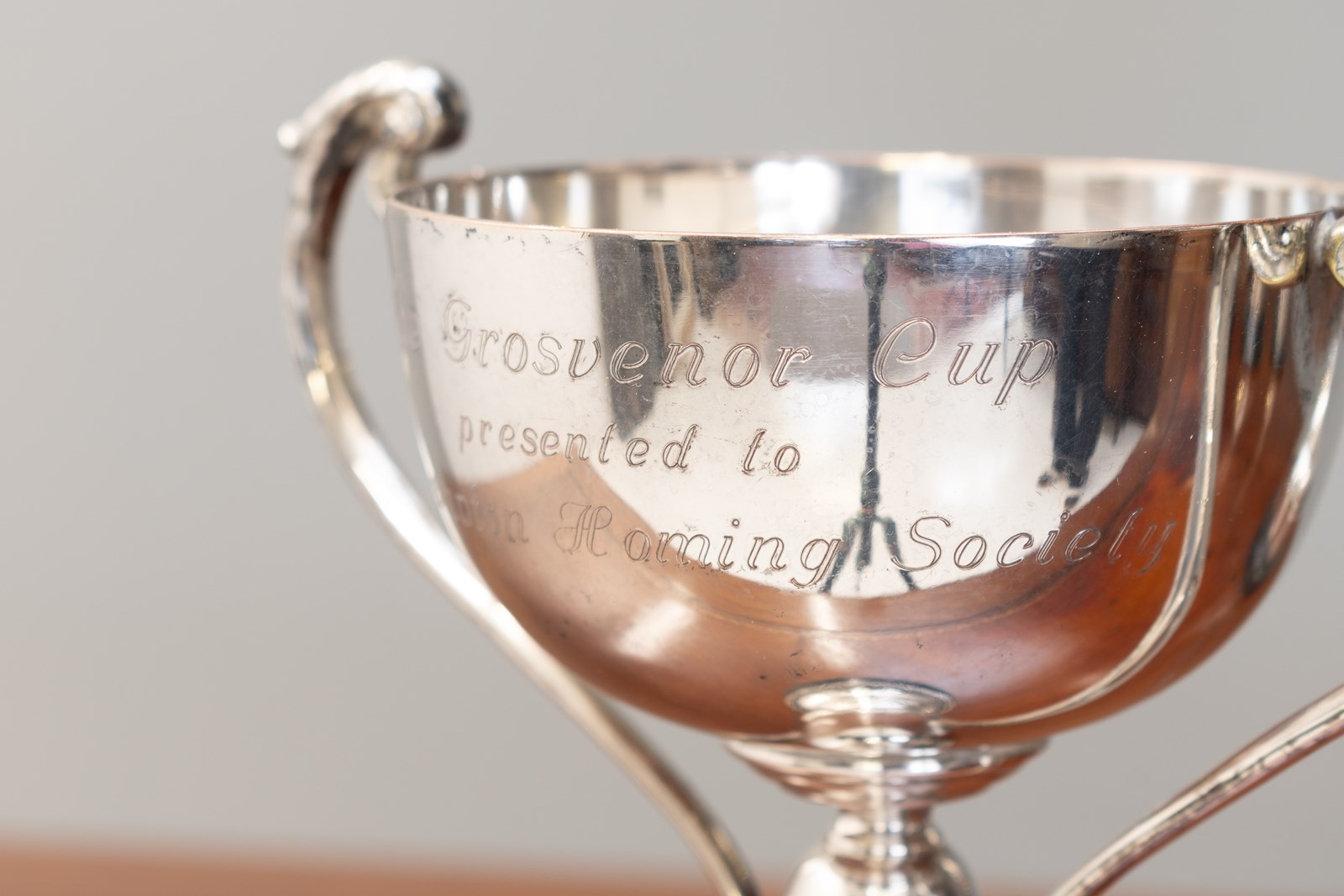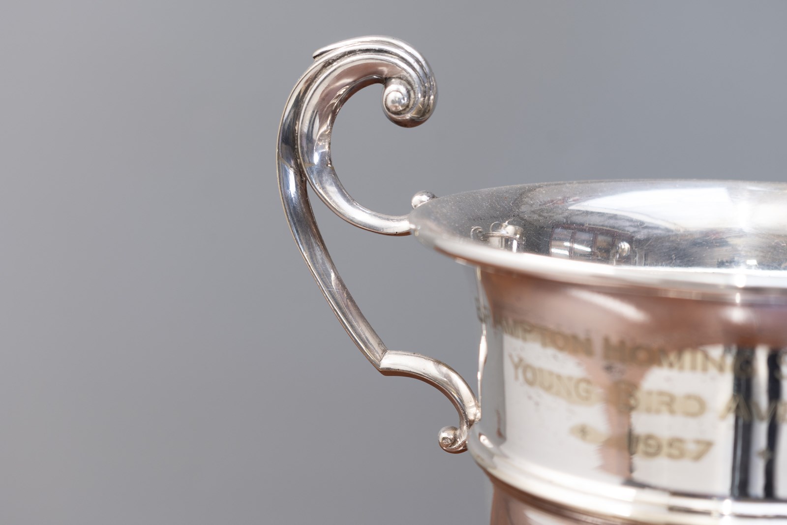 Collection of five 20th century silver plated trophies, re-polished with pine bases. Measurements to the largest. U.K circa 1950.