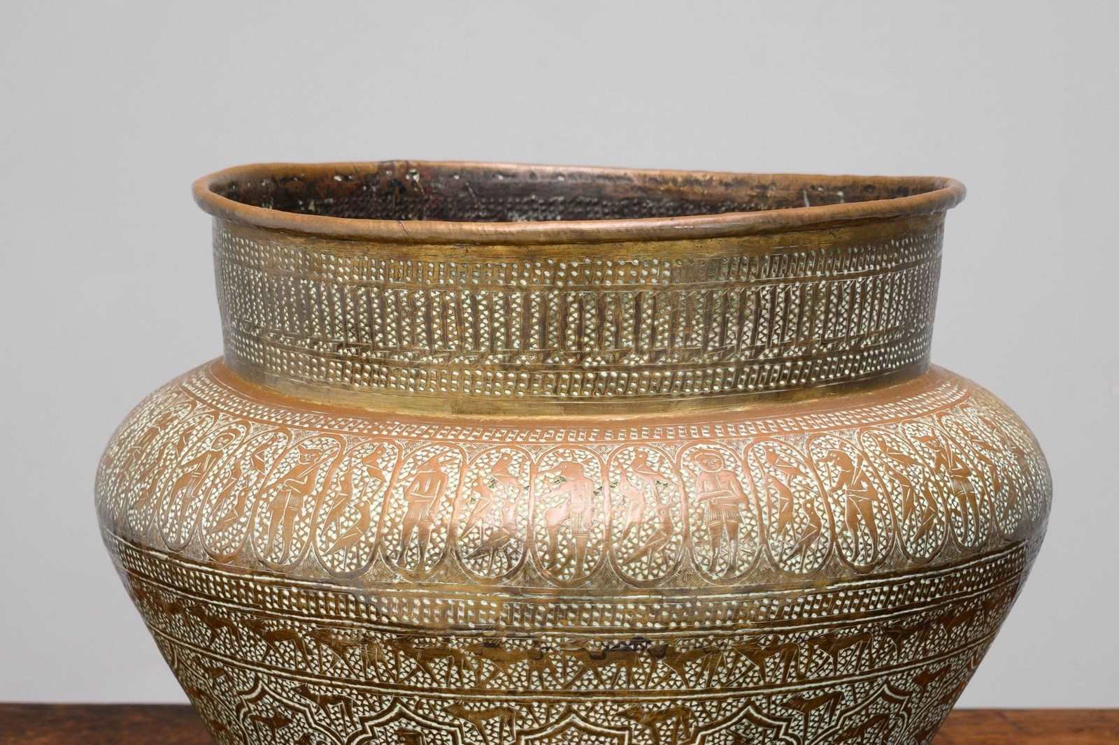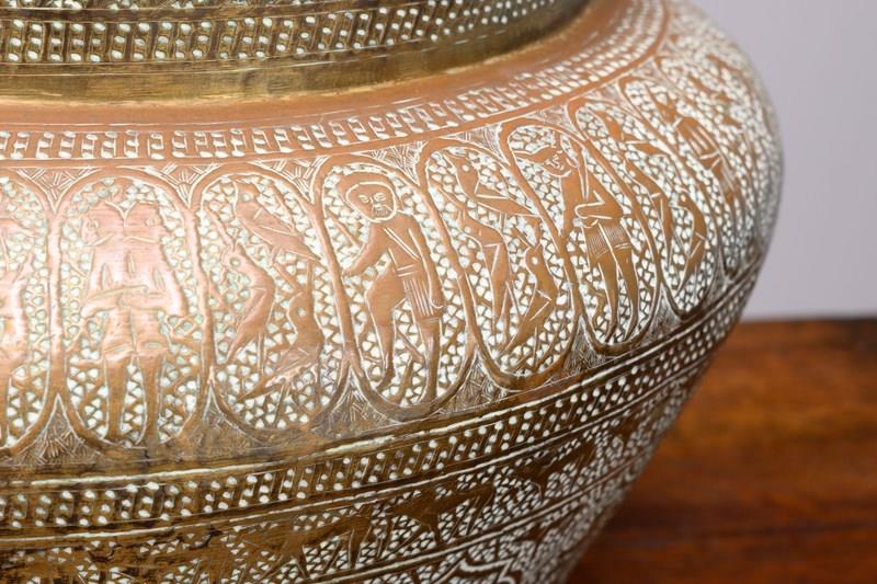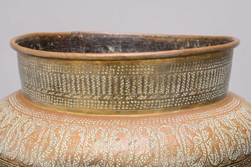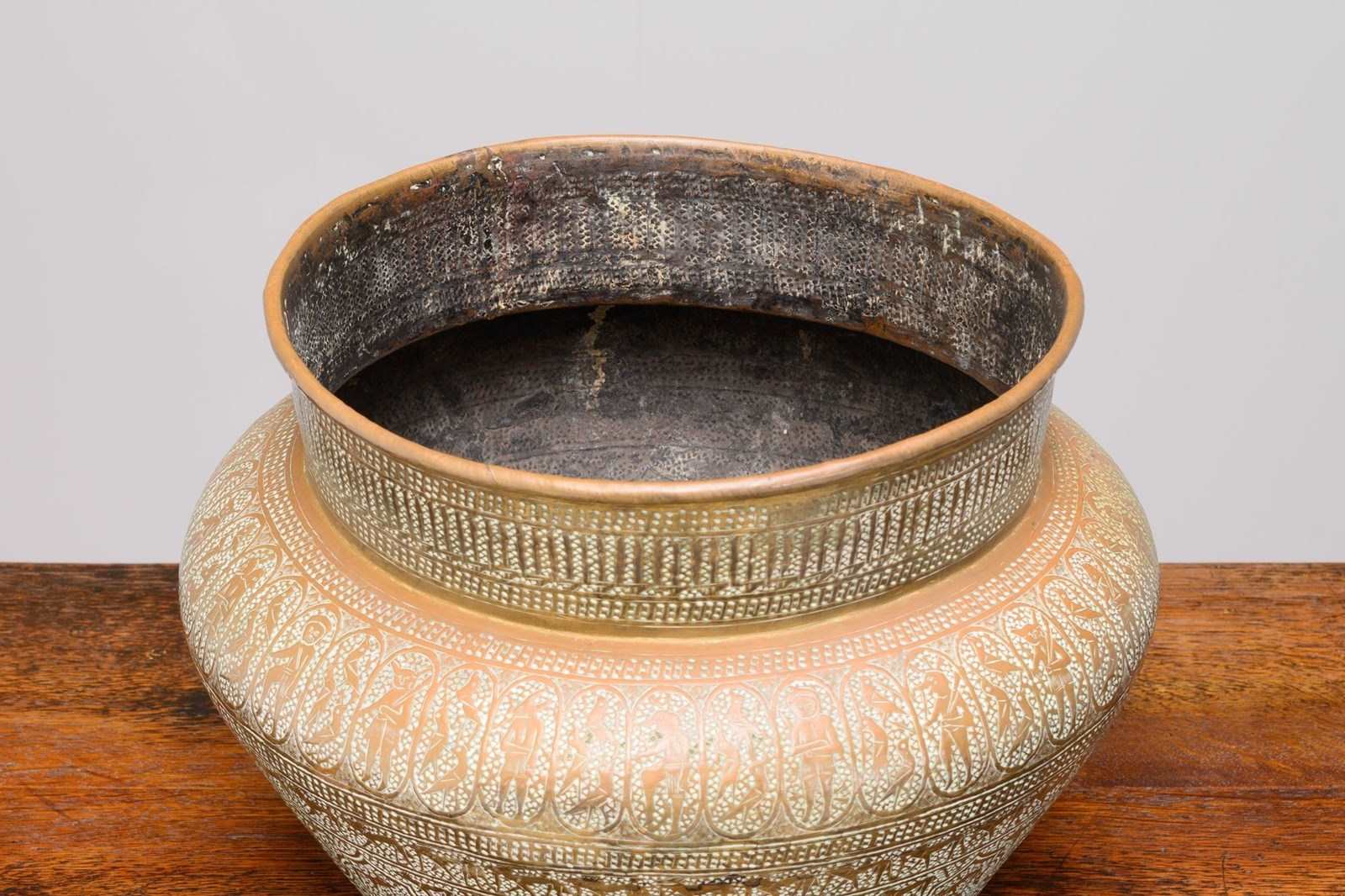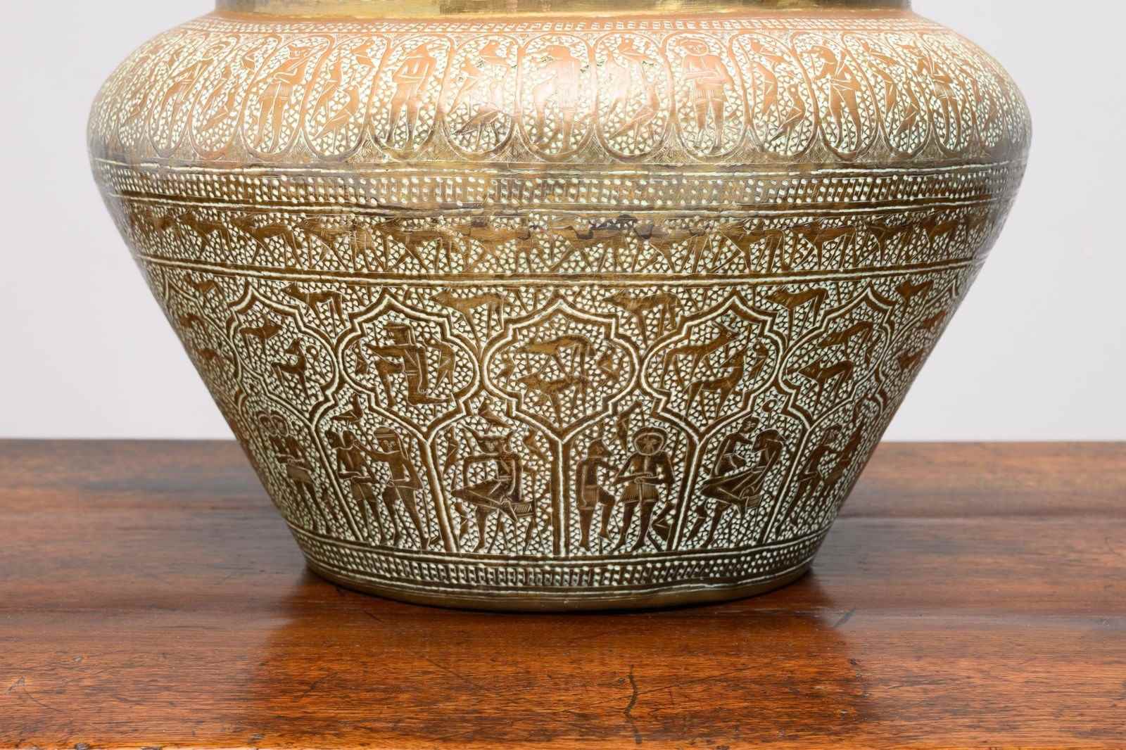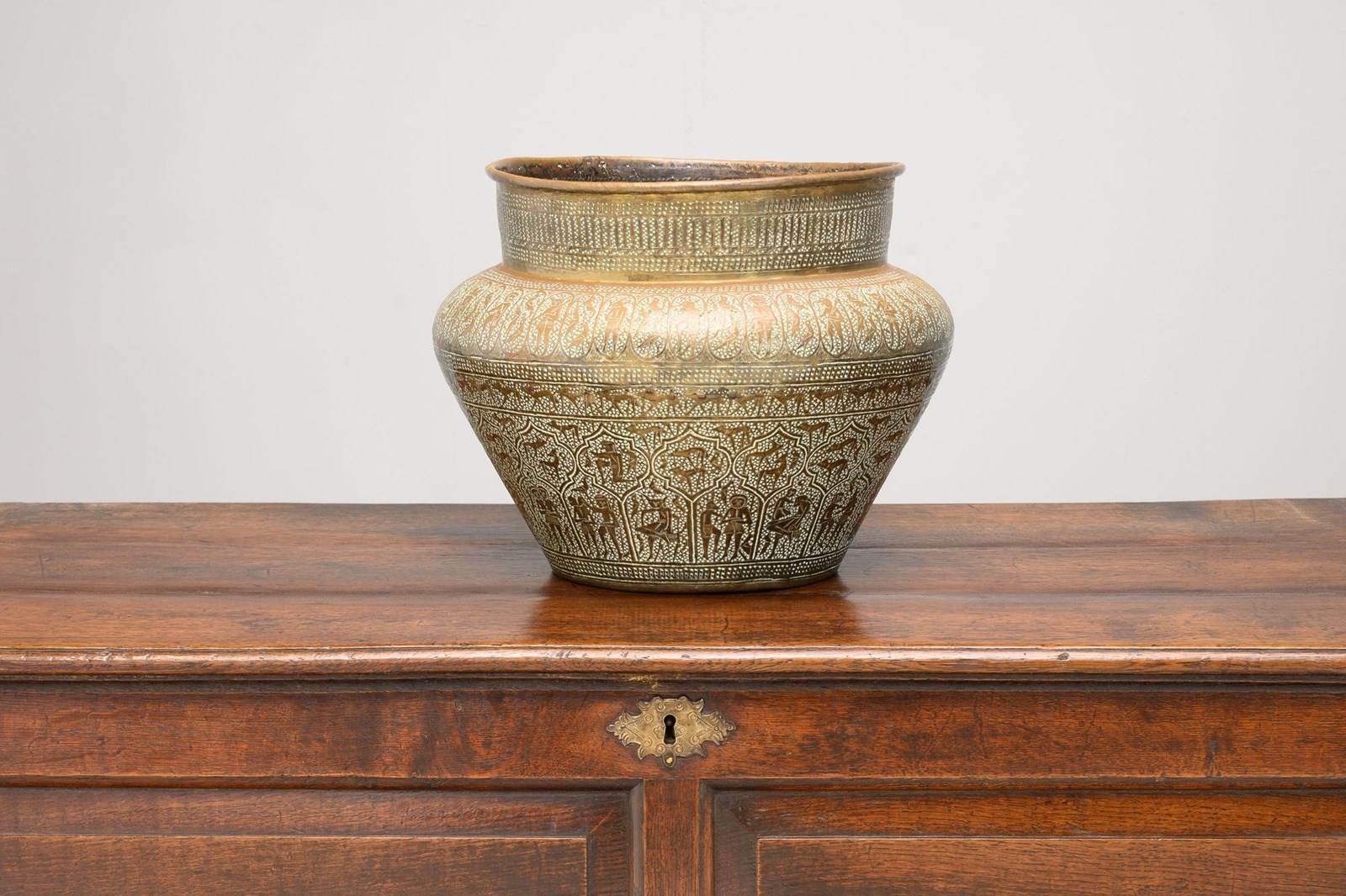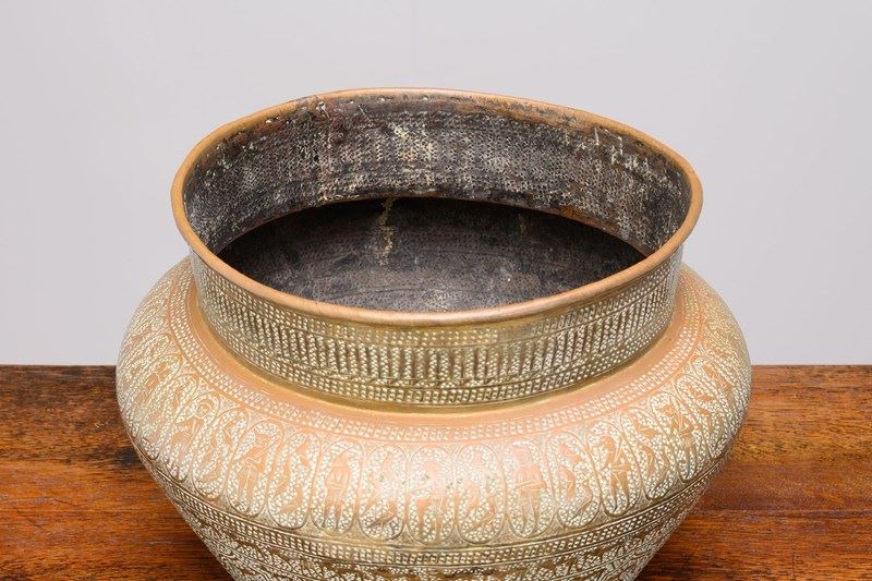 Brass jardiniere with decorative engraving. England circa 1930.