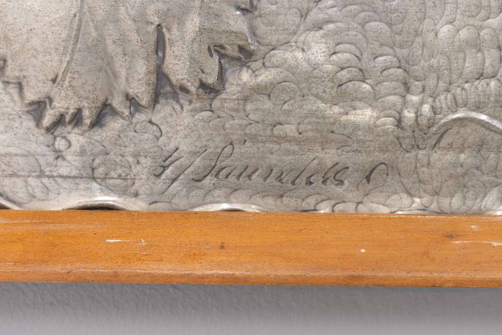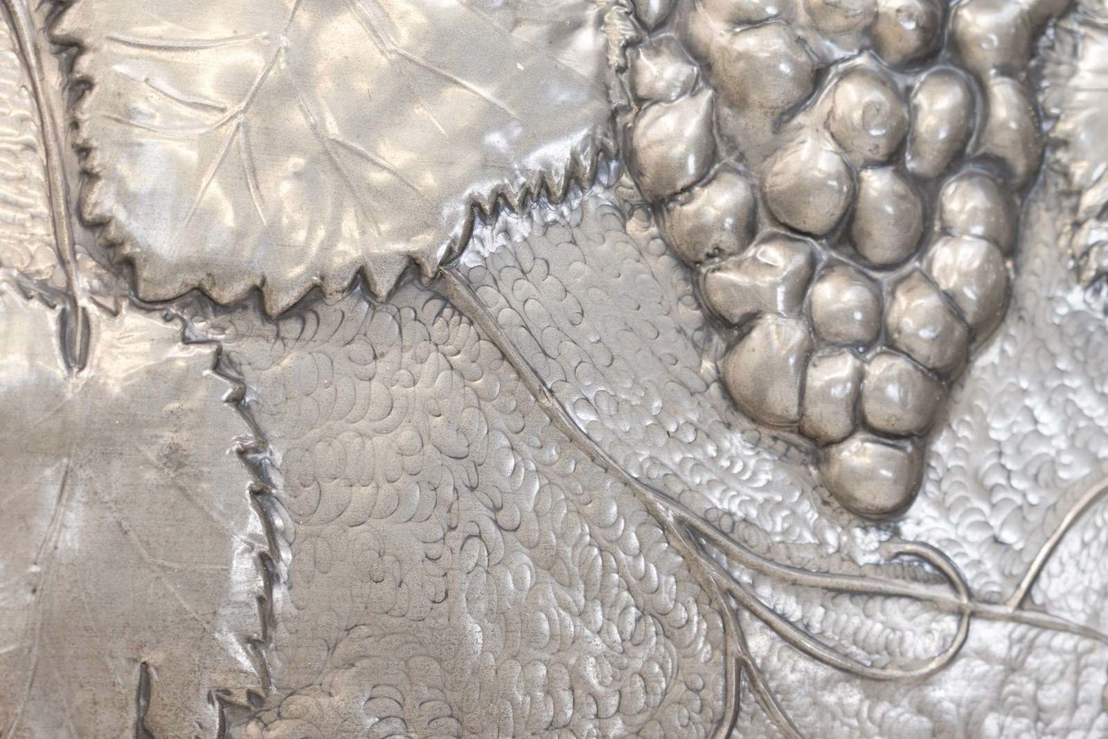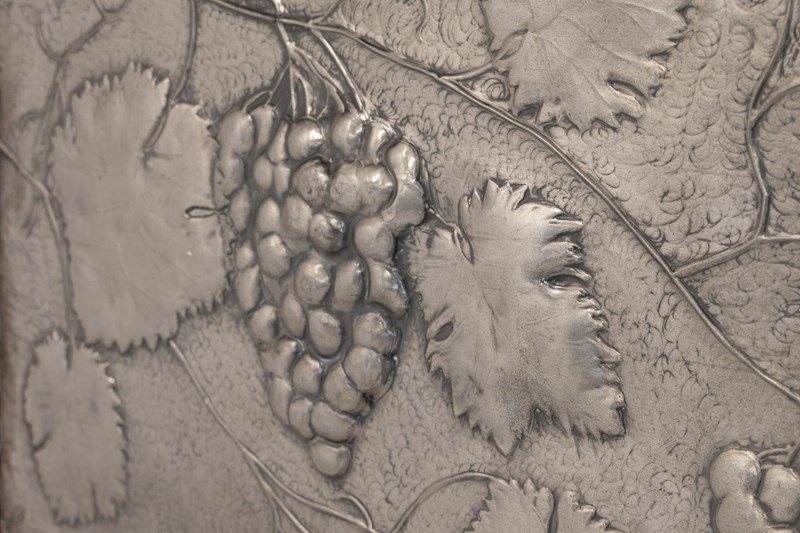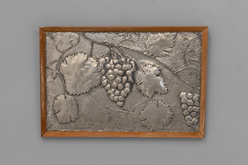 Decorative framed pressed pewter panel of grapes on a vine. Circa 1950. (Signed. Saunders?)