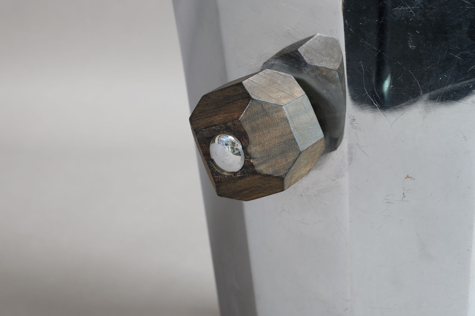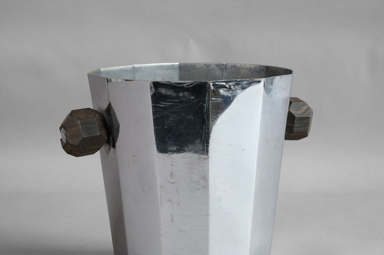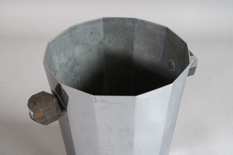Mid-Century dodecagon champagne bucket with wooden shaped handles. Aged finish.