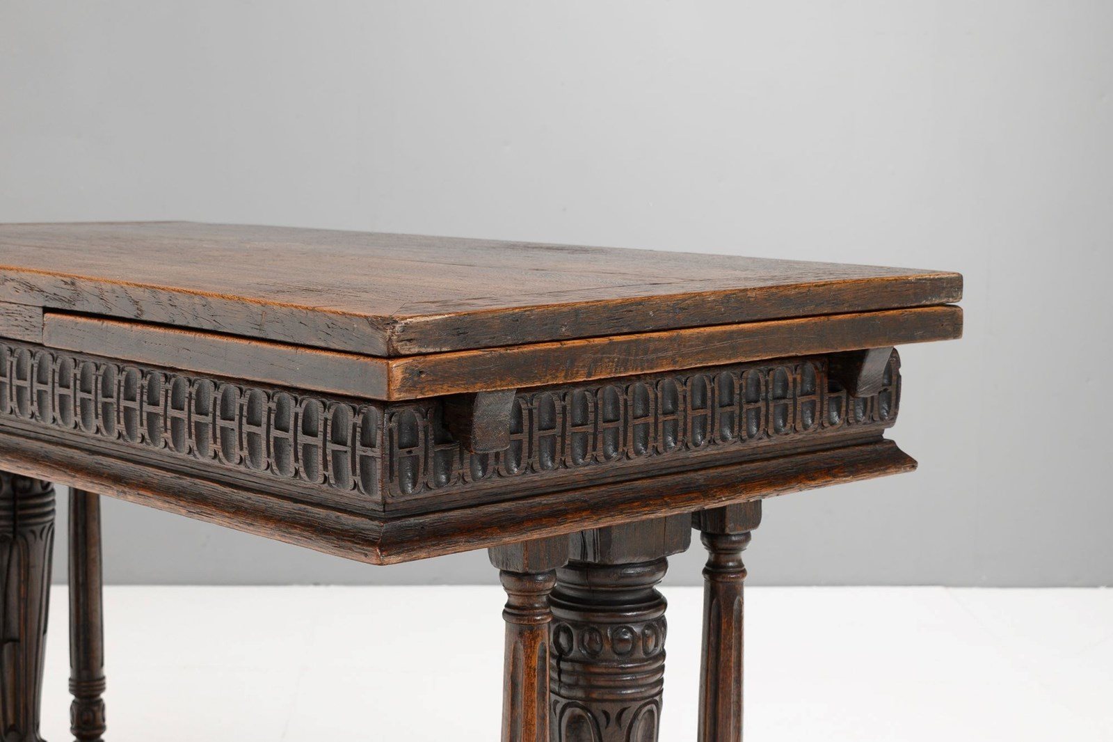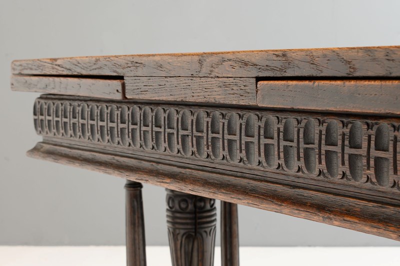 Oak draw leaf table on trestle base with pull out leaves. U.K circa 1900.