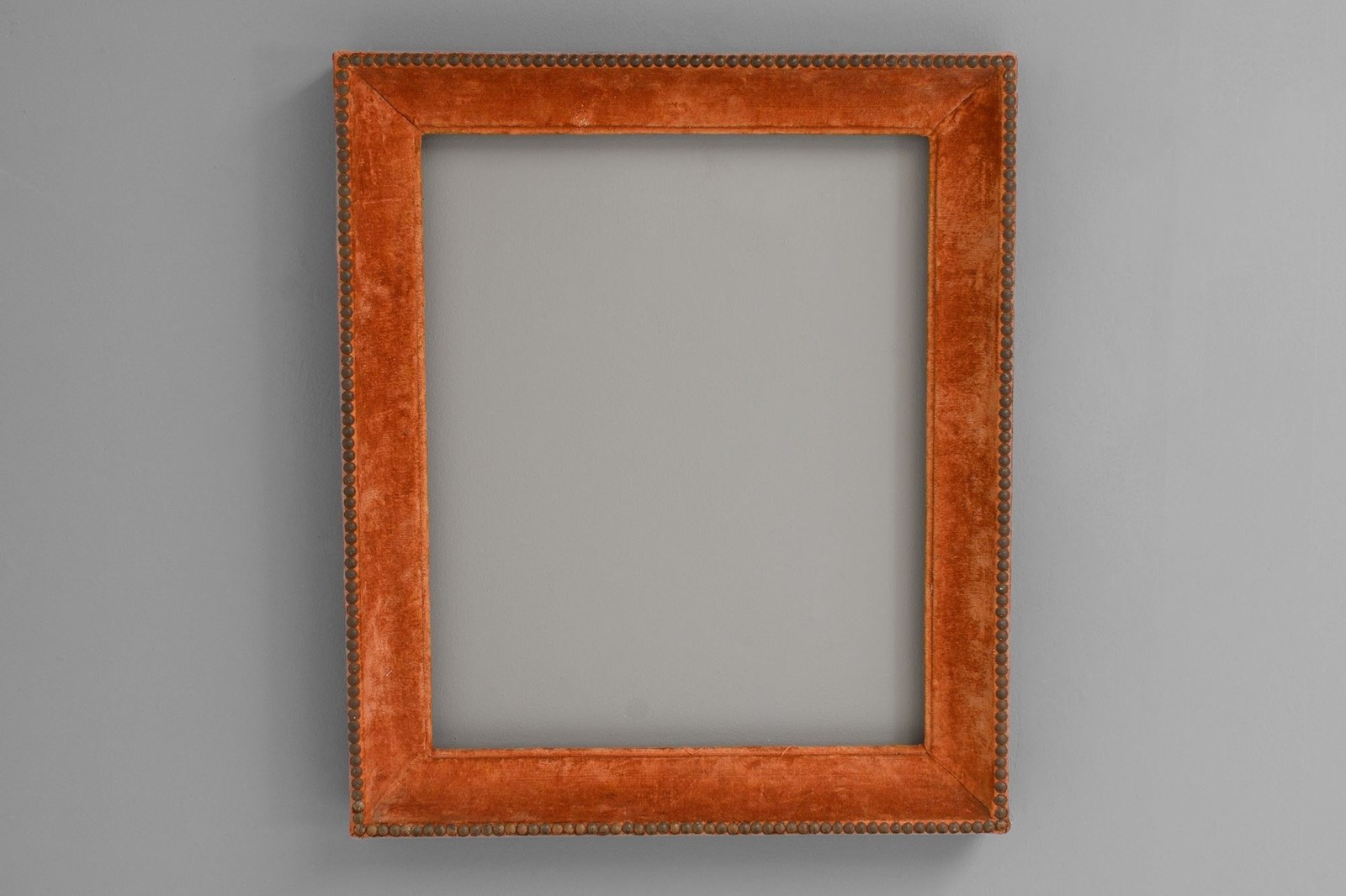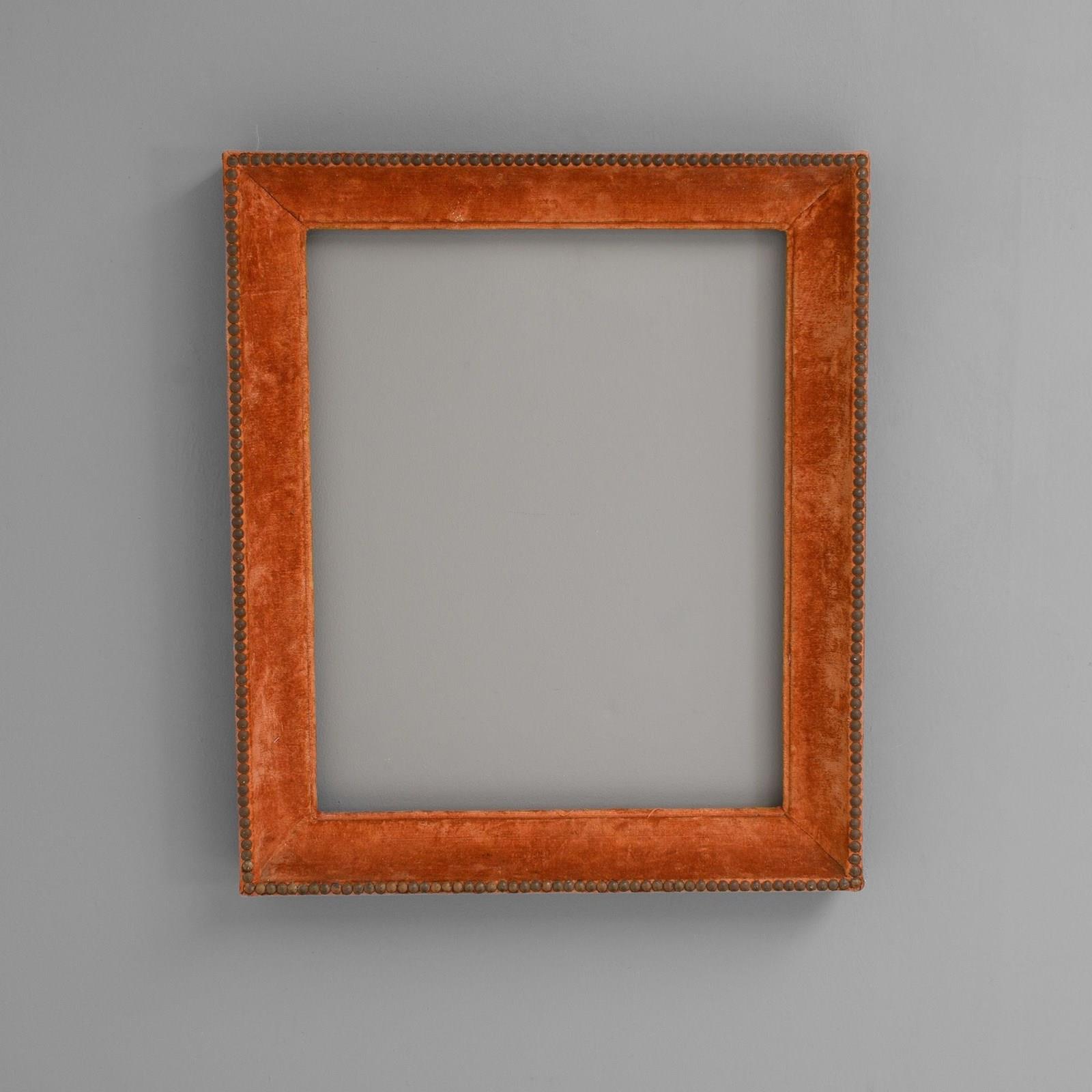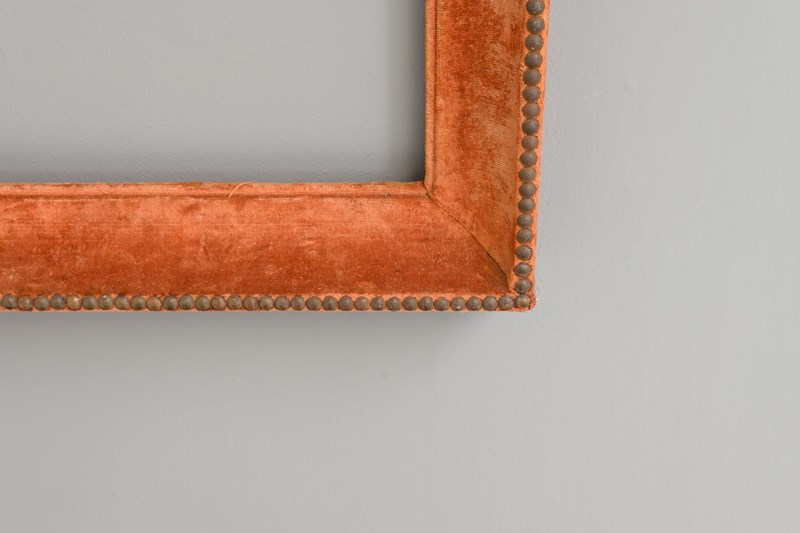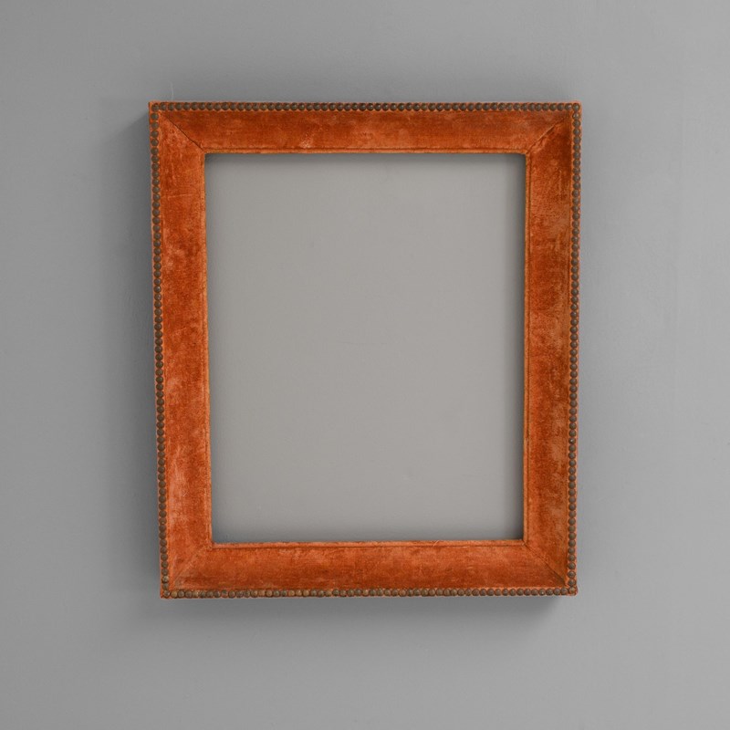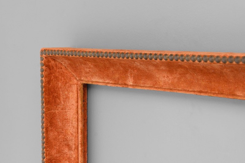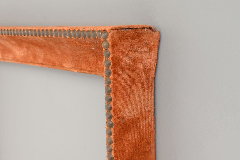 Large oak picture frame covered in original burnt orange velvet and brass studding.