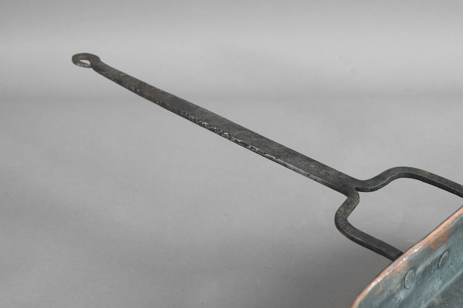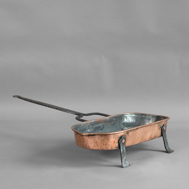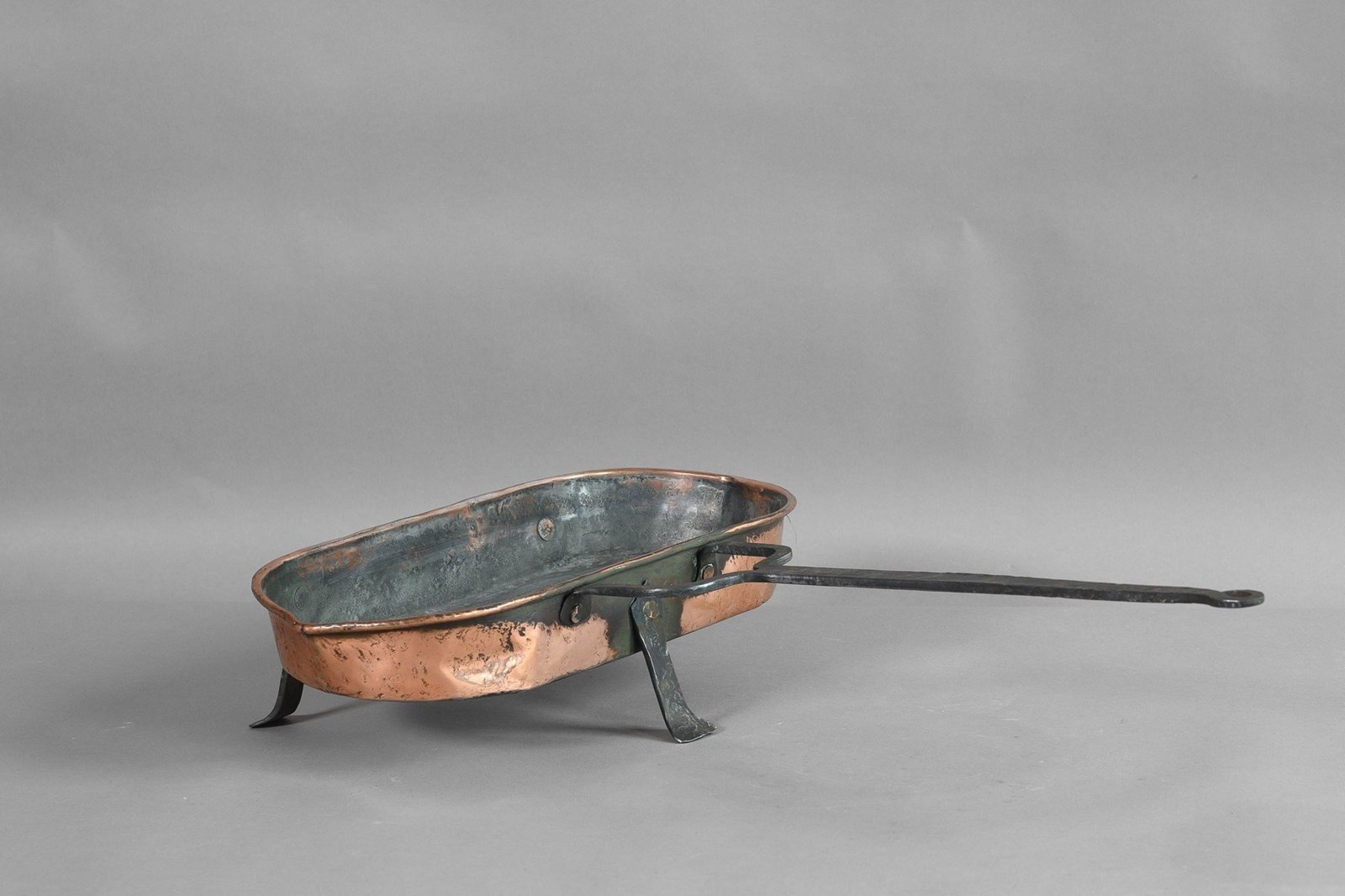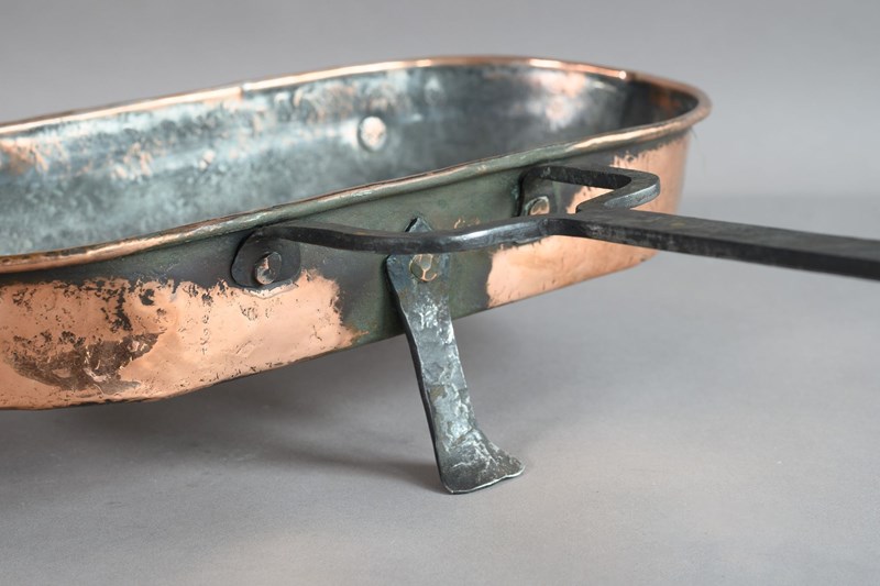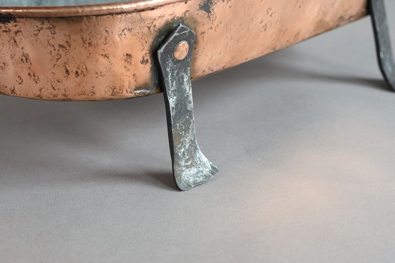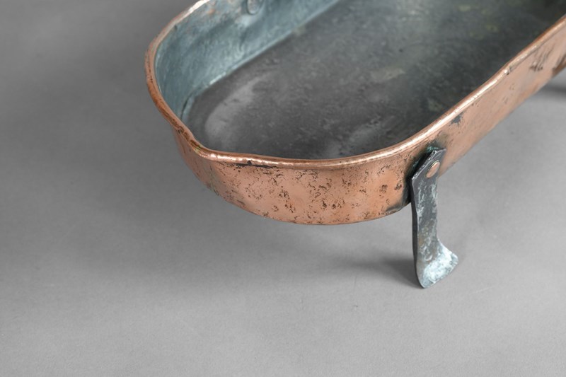 Copper fish kettle with steel handle and legs.