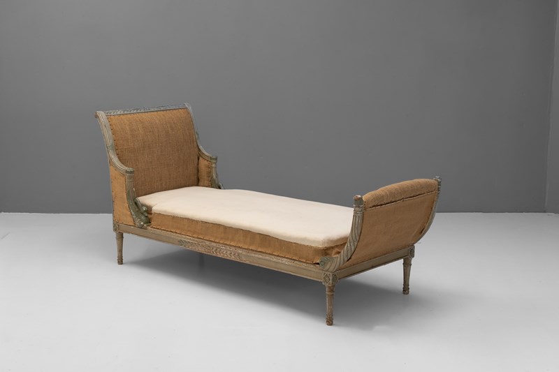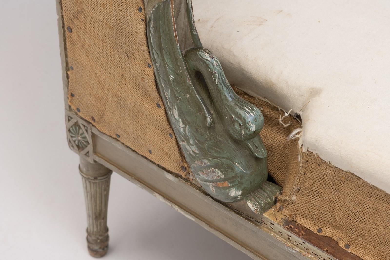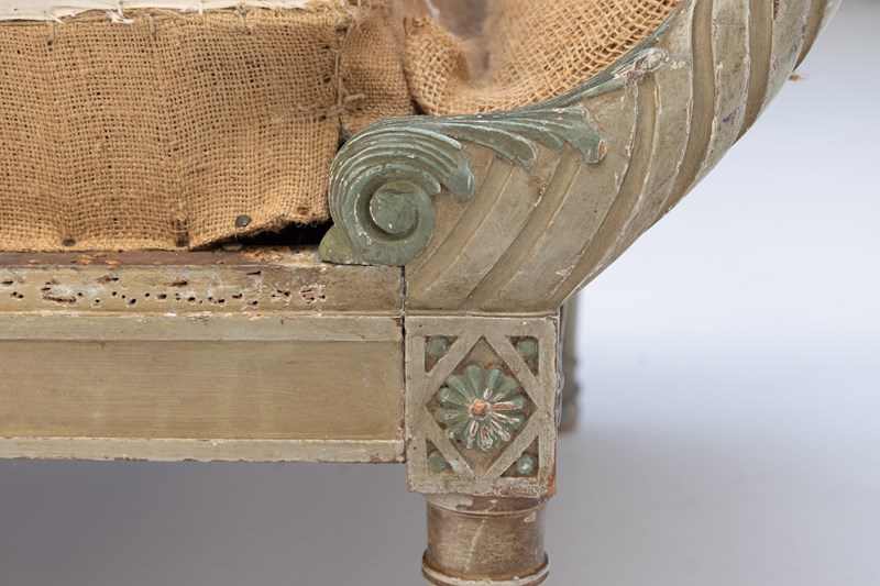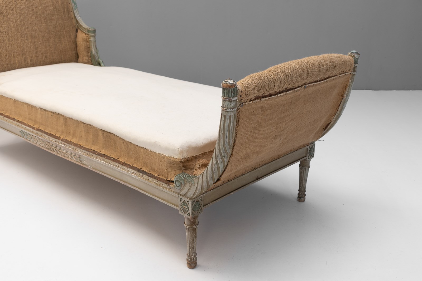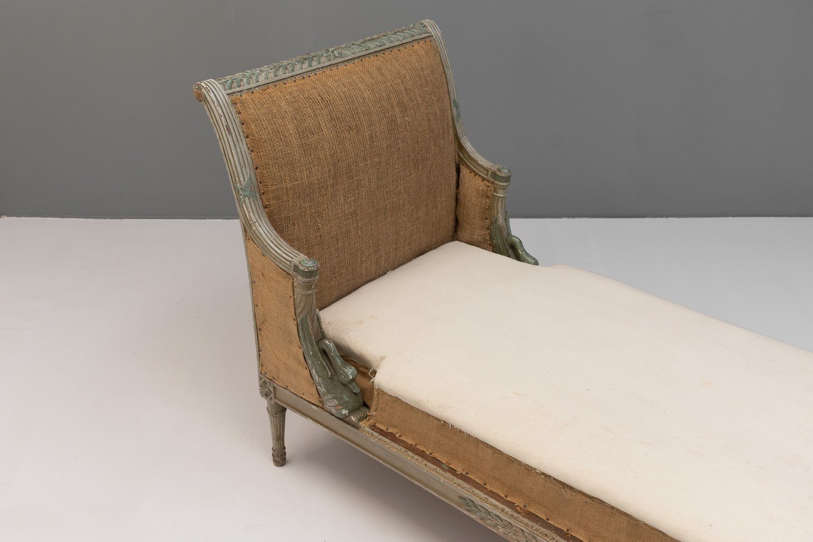 French 19th century chaise lounge in original paint finish with carved decoration in the form of swan necks. Deconstructed ready for a choice of fabric. France circa 1880.