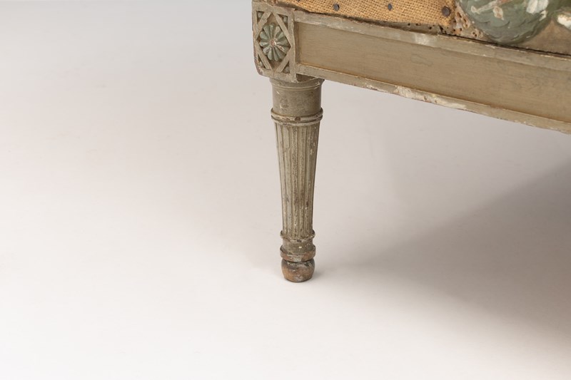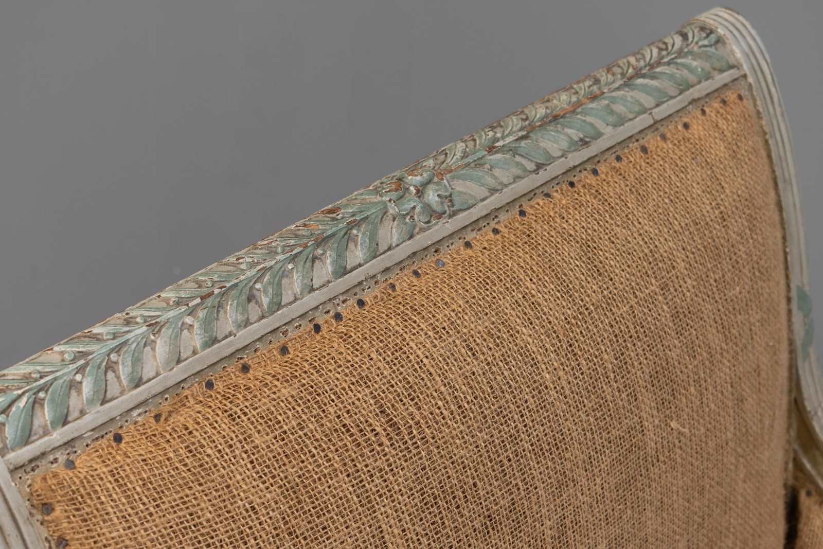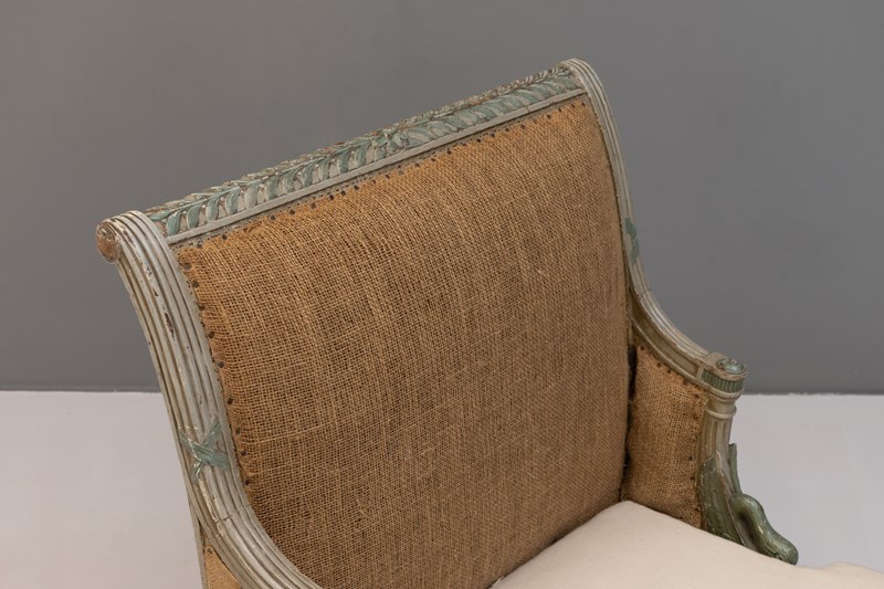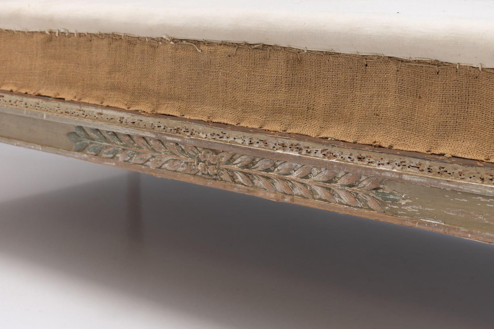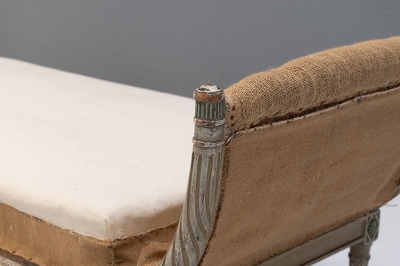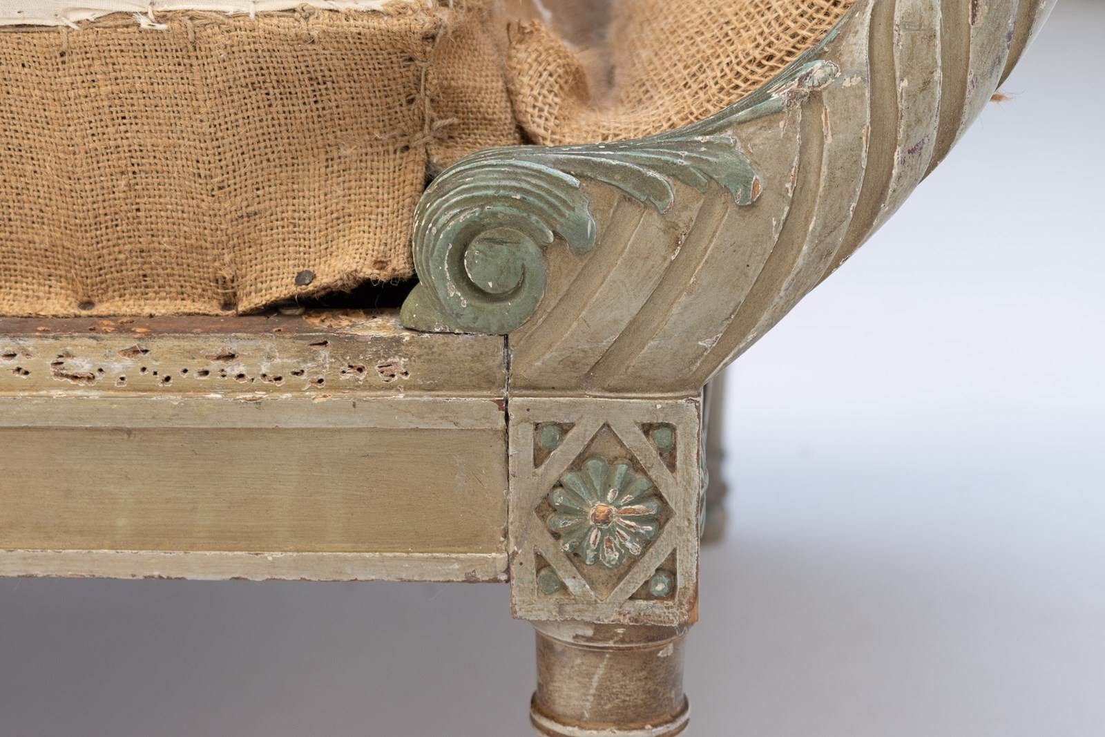 French 19th century chaise lounge in original paint finish with carved decoration in the form of swan necks. Deconstructed ready for a choice of fabric. France circa 1880.