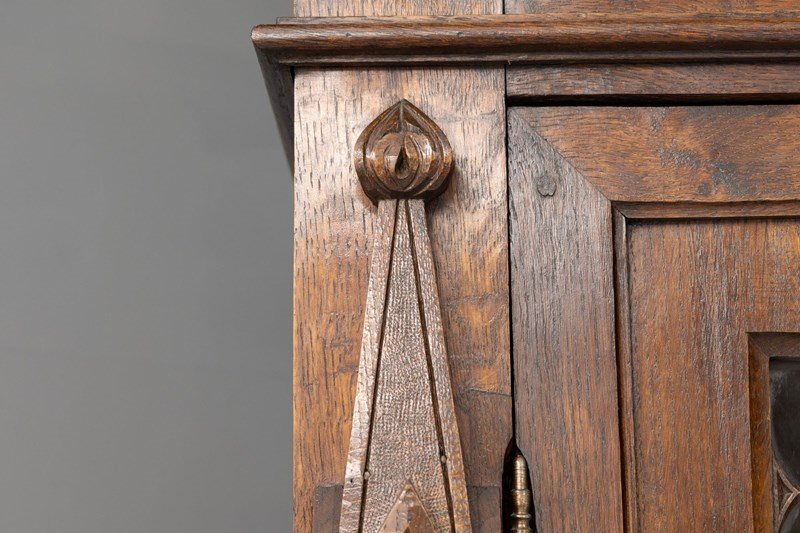 Two door gothic style bookcase in oak with arched glazed upper doors. Circa 1880.