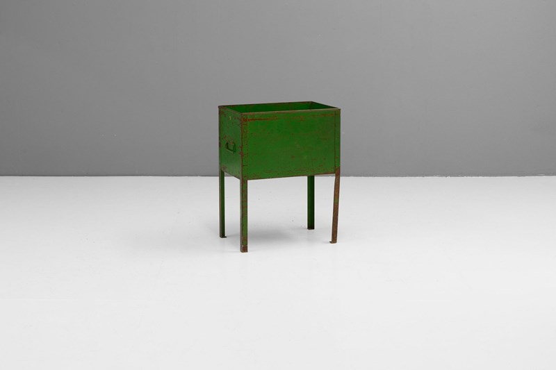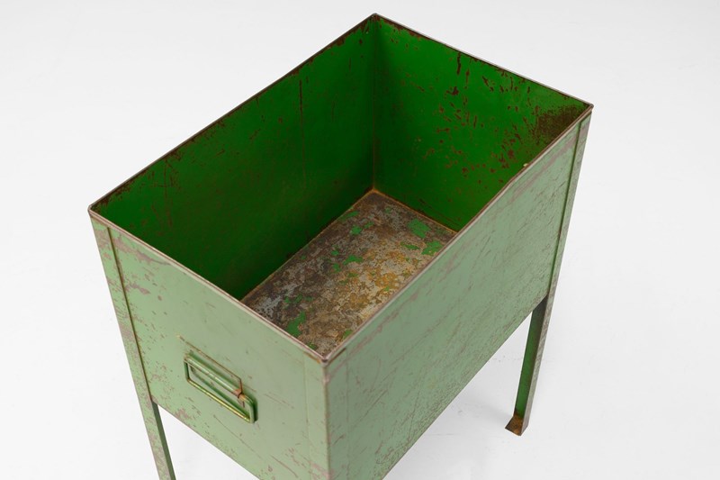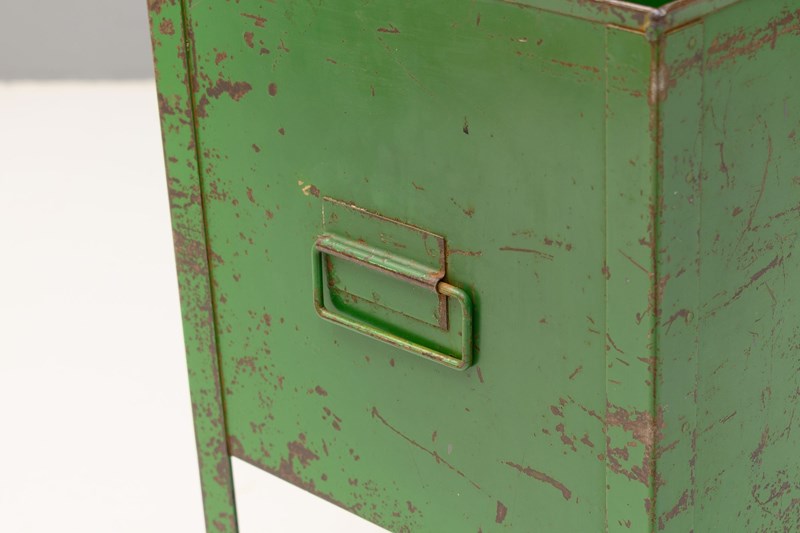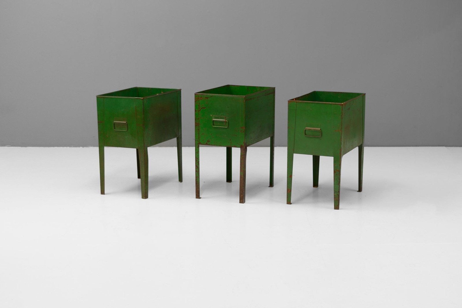 Three industrial stationery bins with aged green paint.