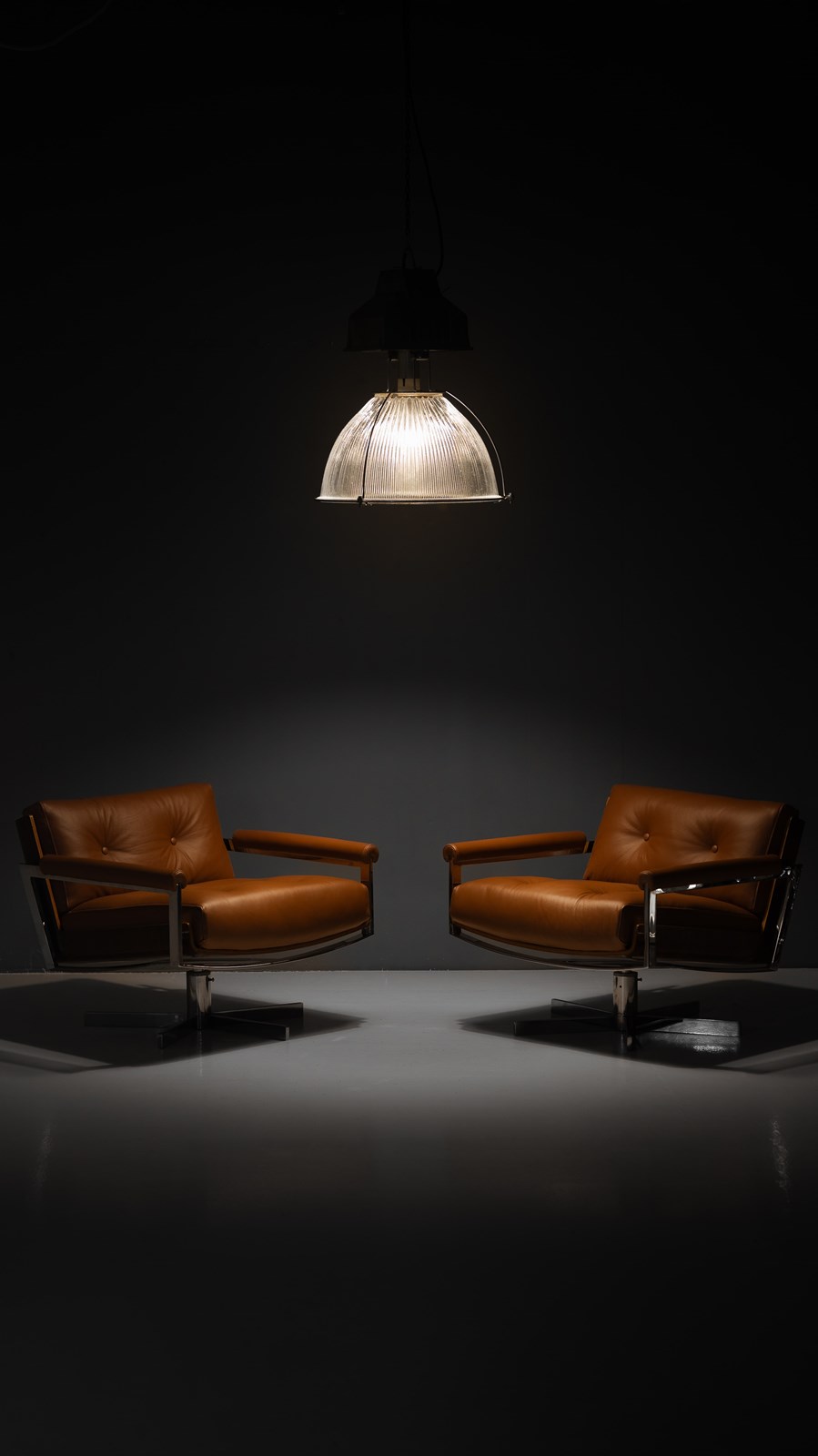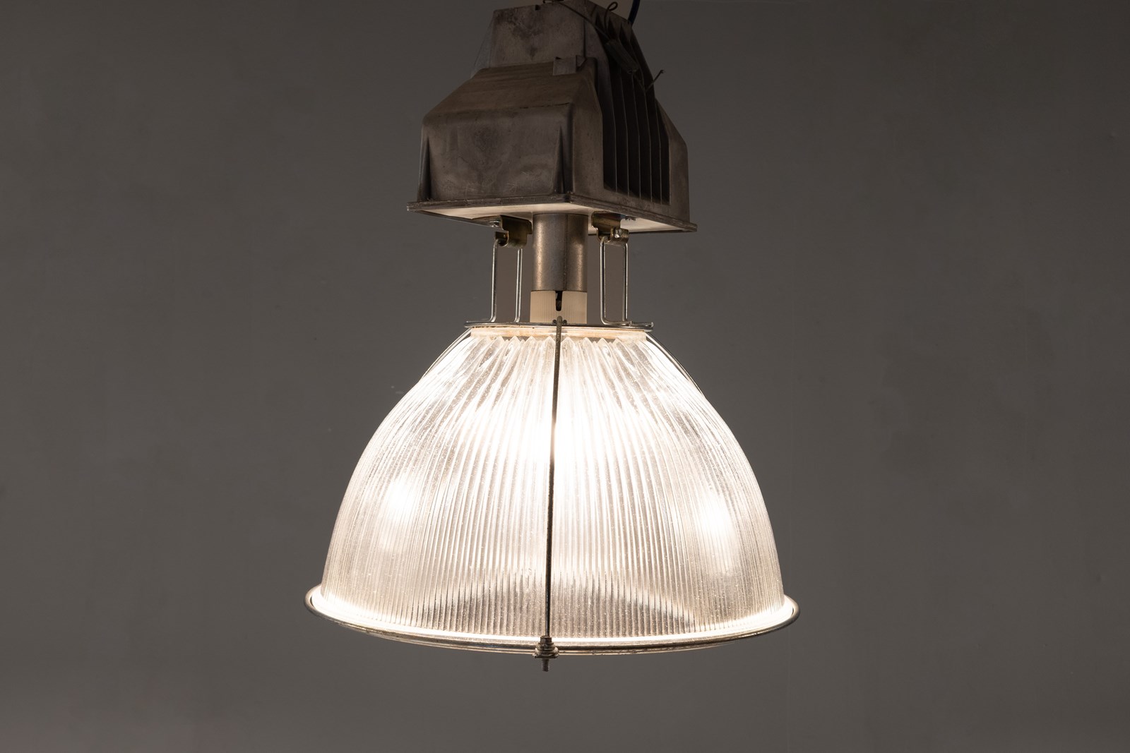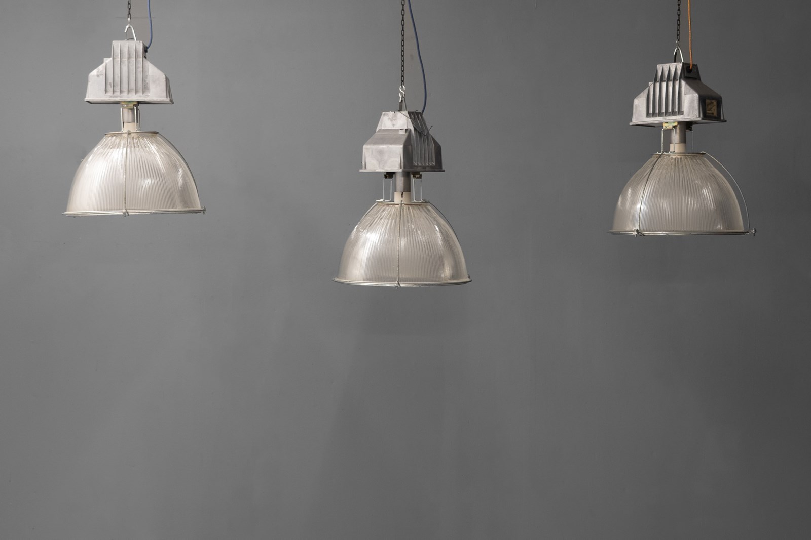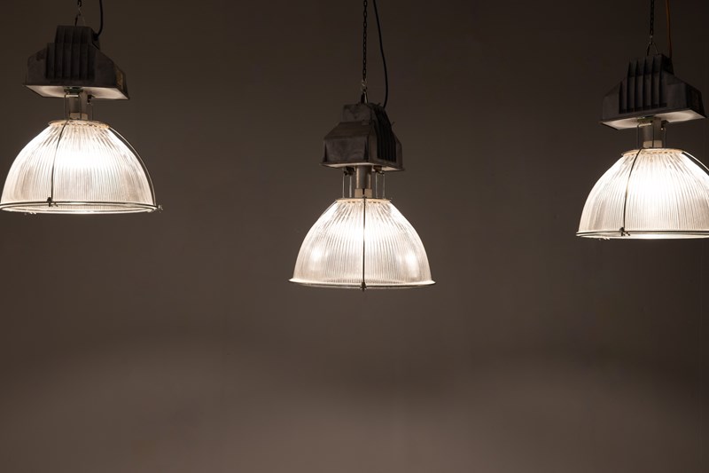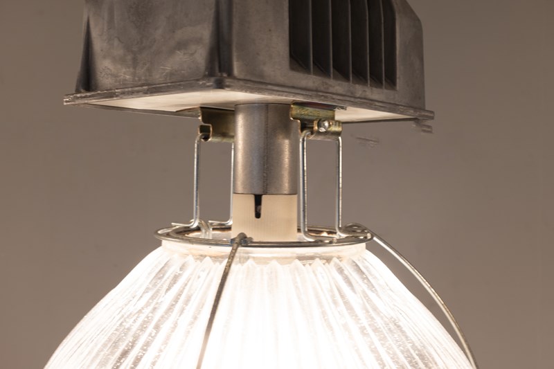 Run of 11 large industrial holophane glass pendant lamps. Good working condition. U.K circa 1980. Priced individually.