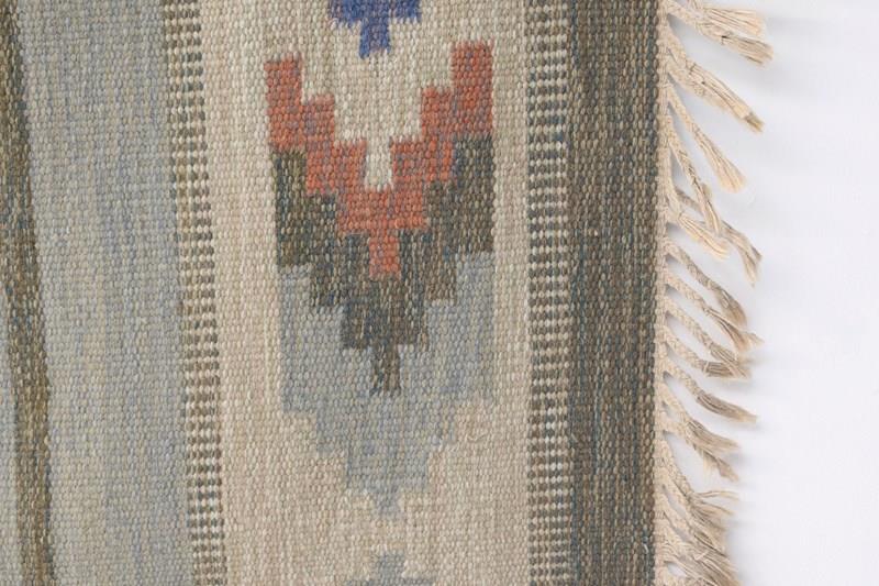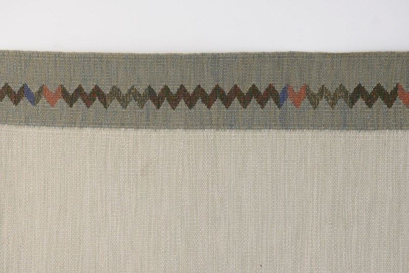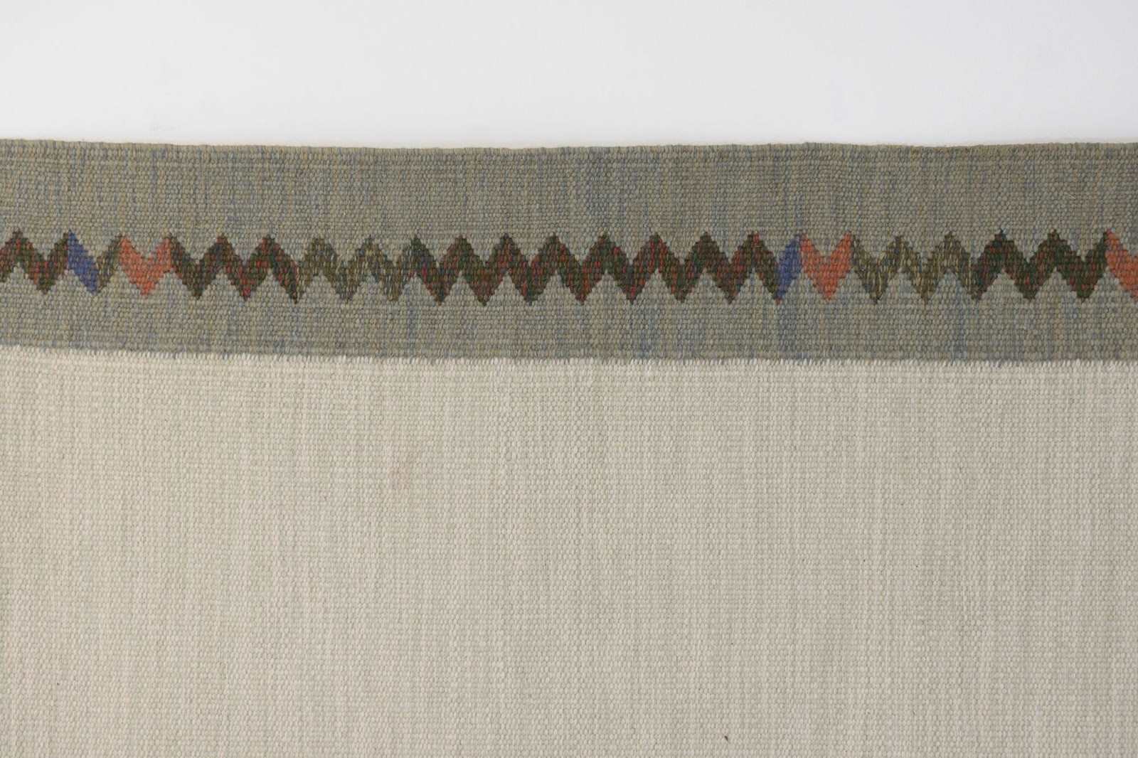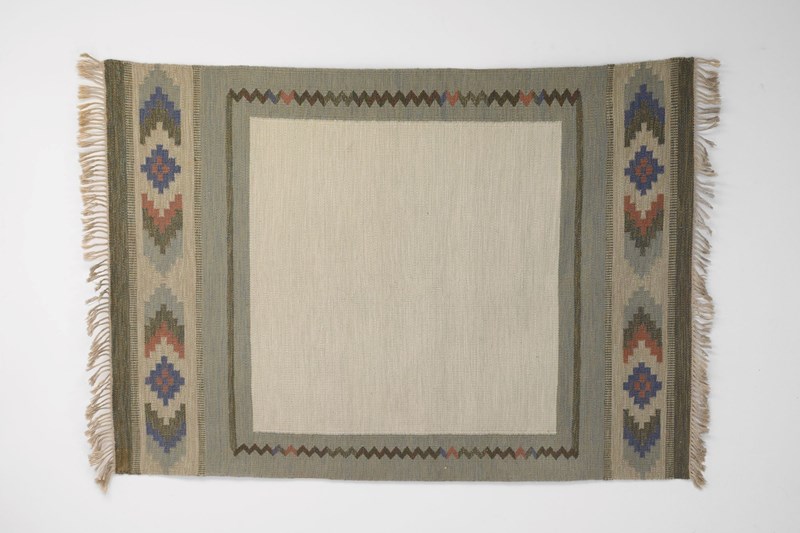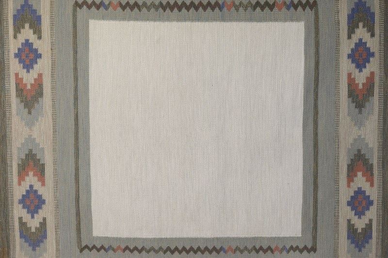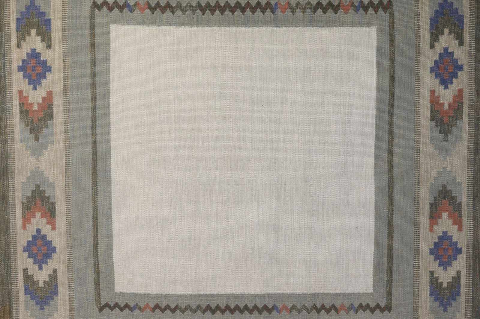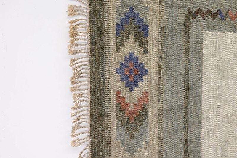 Large size mid-century Swedish kilim in a geometric border pattern and large clear central field. In tones of greens, blues and cream. Sweden circa 1960. All our carpets undergo a professional cleaning process. However, due to their age and previous life, some may exhibit minor signs of wear consistent with their history. Please examine the provided photos carefully or contact us for further information.
